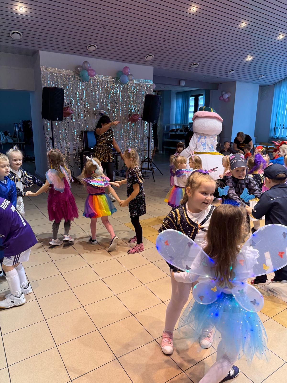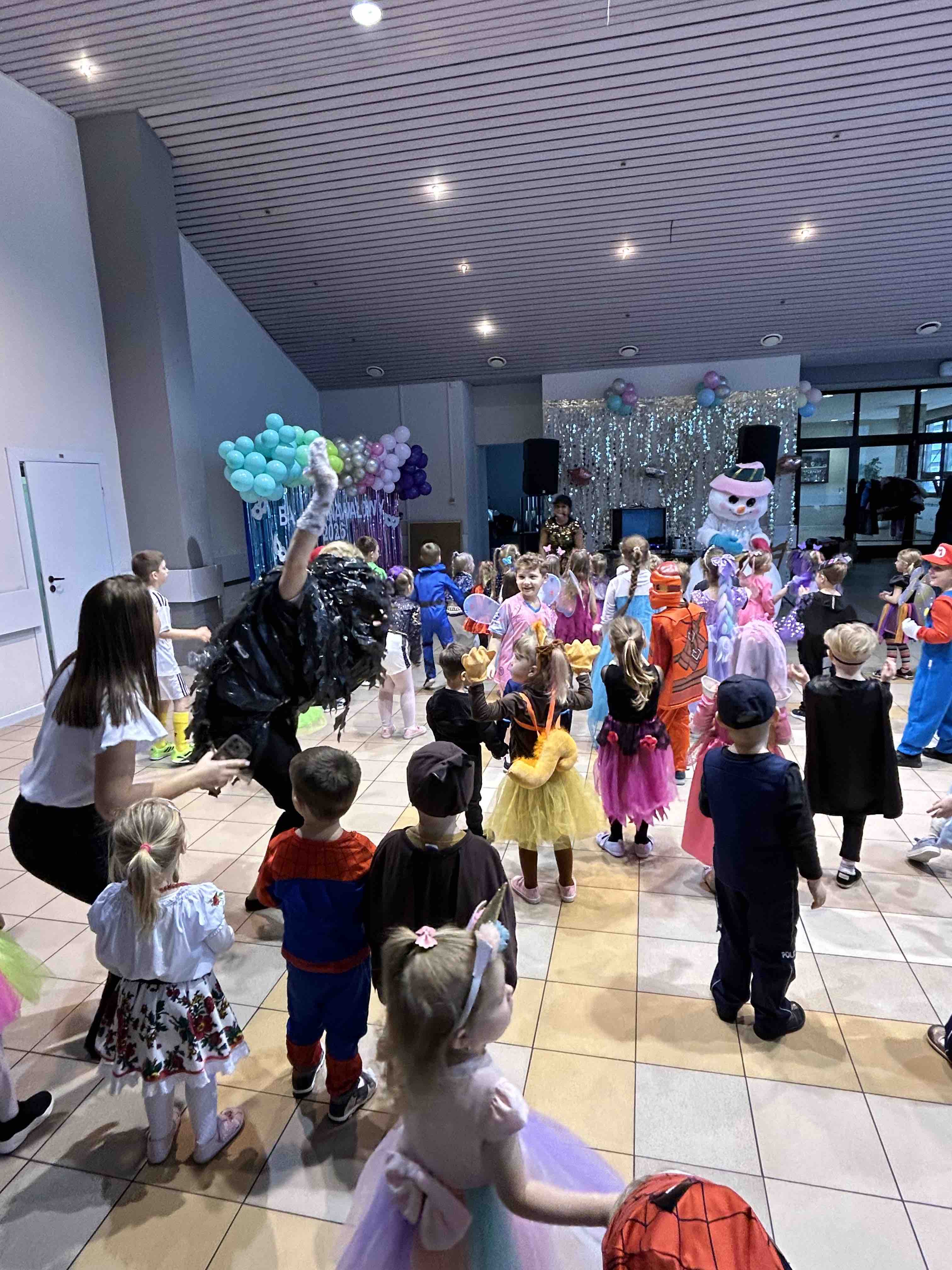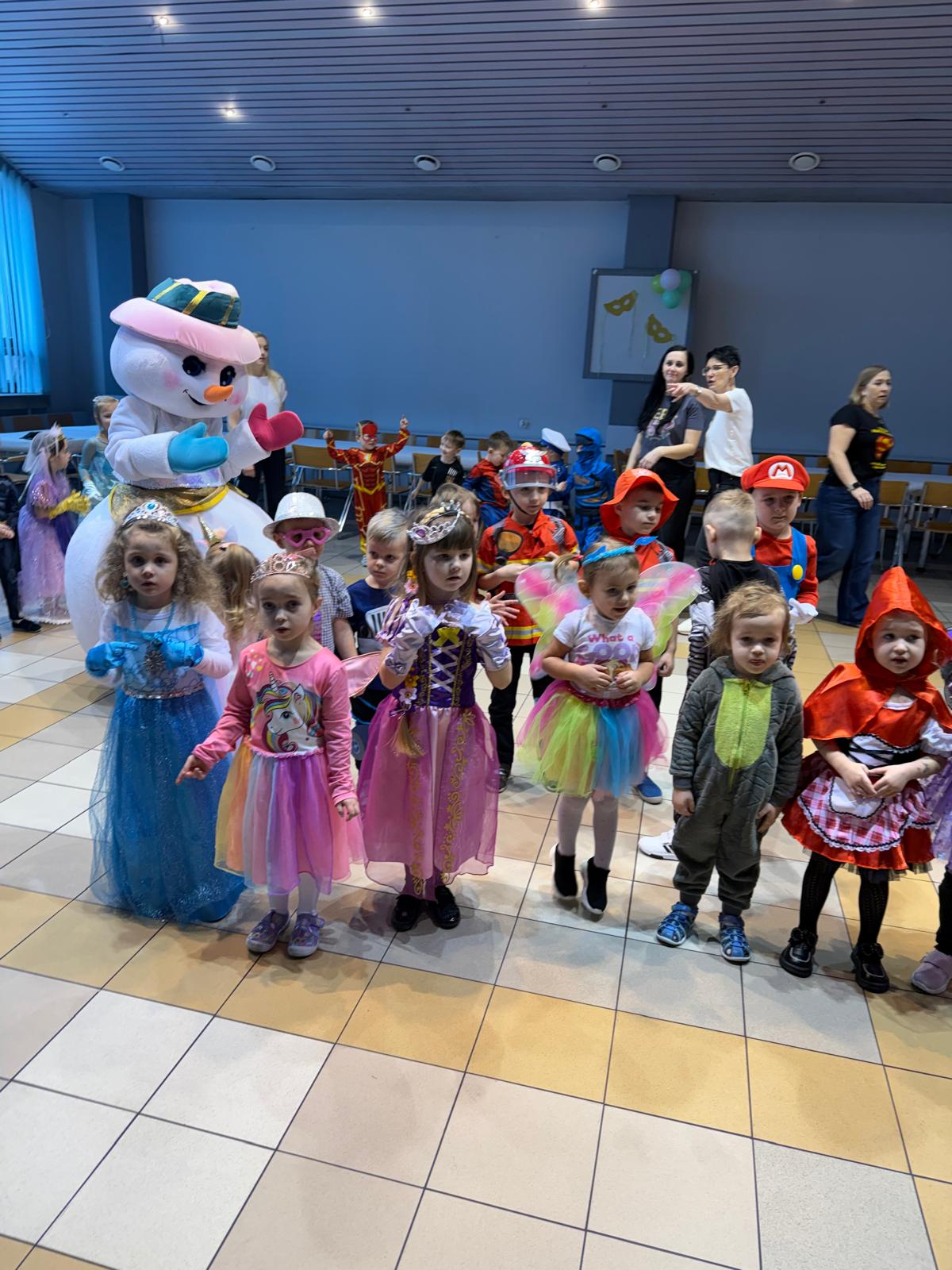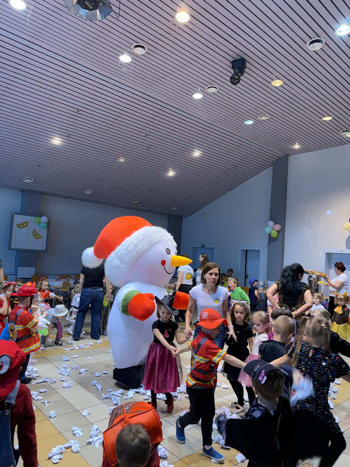 Na miejscu przedszkolaki przebrały się w swoje piękne stroje - można było spotkać księżniczki, super bohaterów, zwierzątka, policjantów, strażaków i wiele innych bajkowych postaci. Każde dziecko z dumą prezentowało swój kostium podczas wspólnych tańców i zabaw przy muzyce. O doskonałą zabawę zadbali profesjonalni animatorzy, którzy przygotowali mnóstwo konkursów, gier i tanecznych niespodzianek. Były wspólne pląsy, zabawy ruchowe, a także wesołe wyzwania, które wywołały dużo śmiechu. Ogromną atrakcją balu była wizyta gości - wesołego Bałwanka oraz sympatycznej Pandy. Maskotki wspólnie z dziećmi tańczyły, przytulały się i pozowały do pamiątkowych zdjęć.