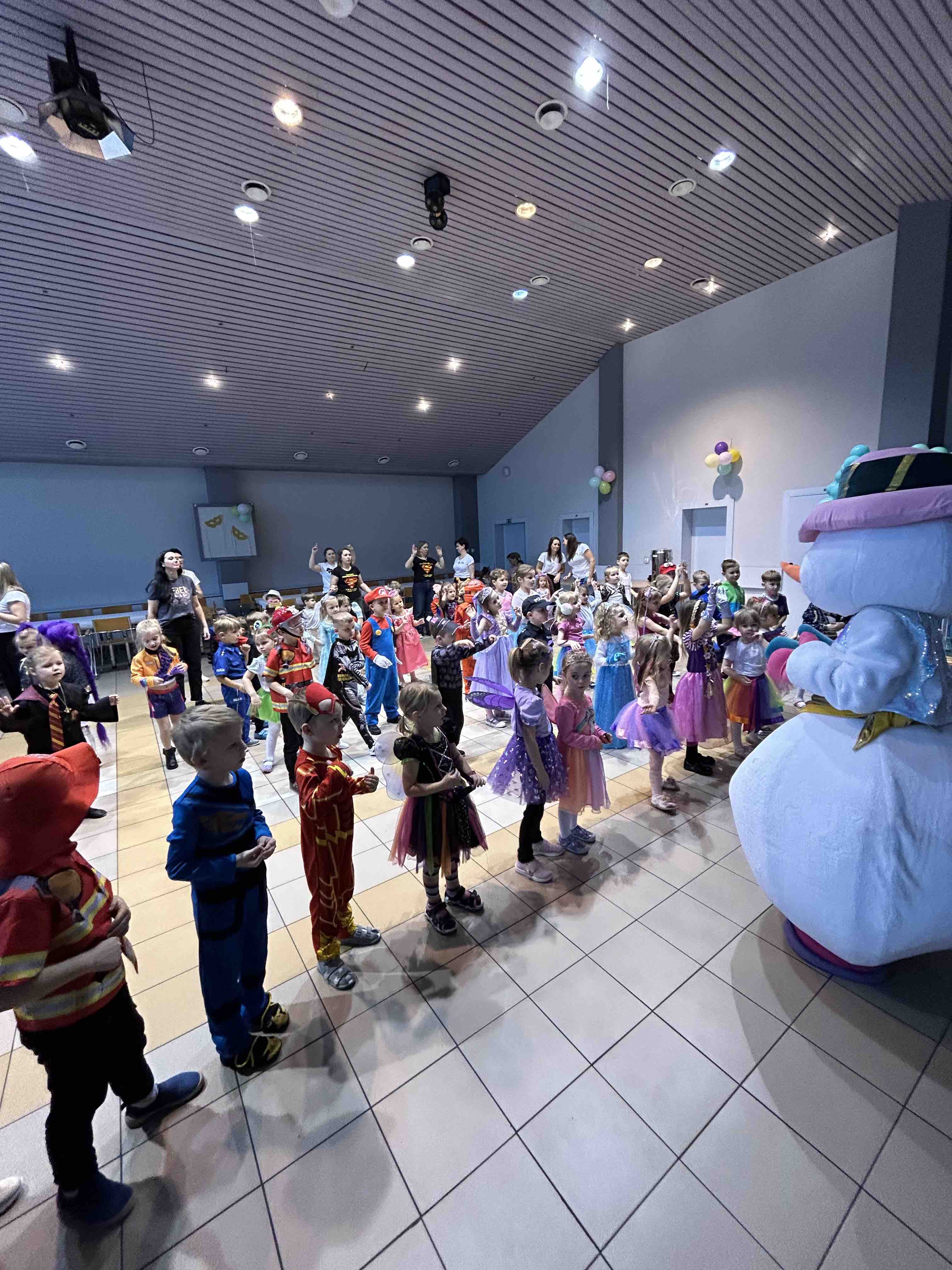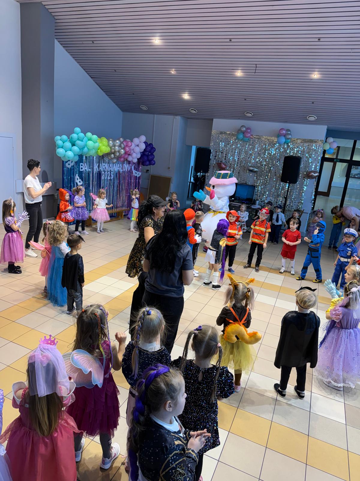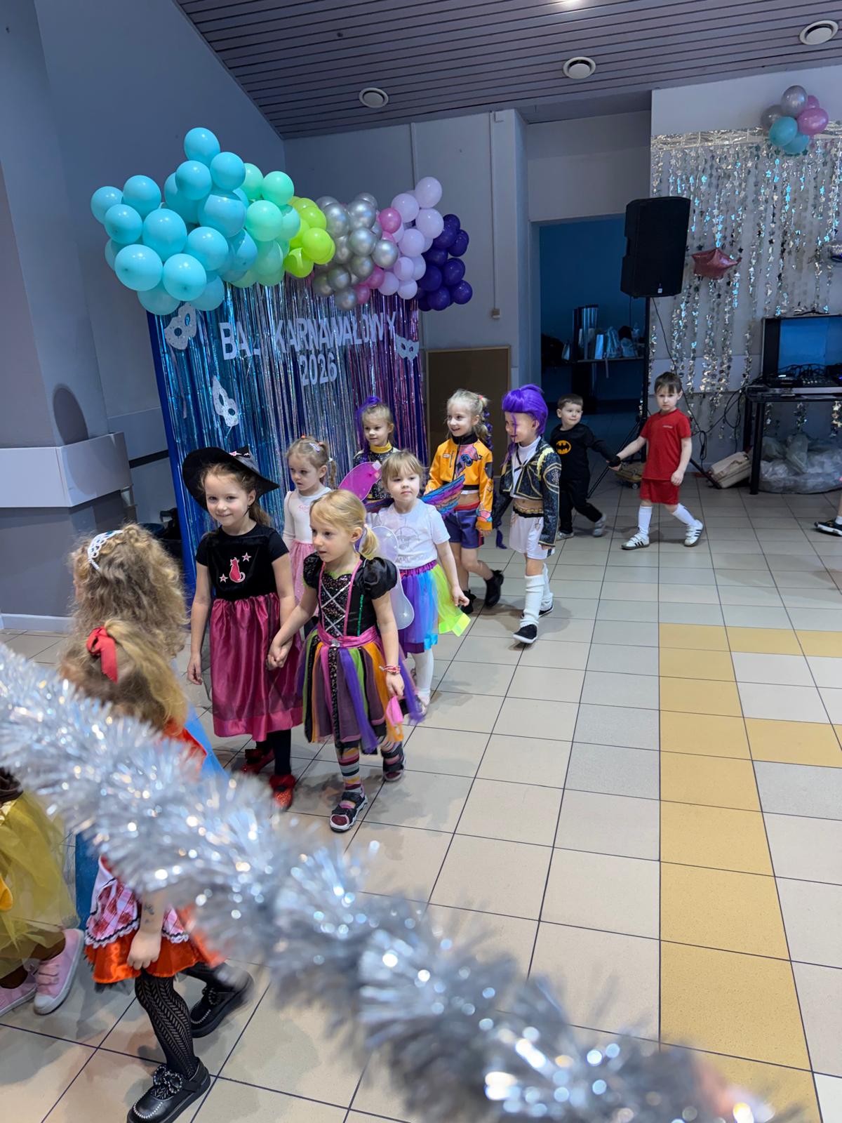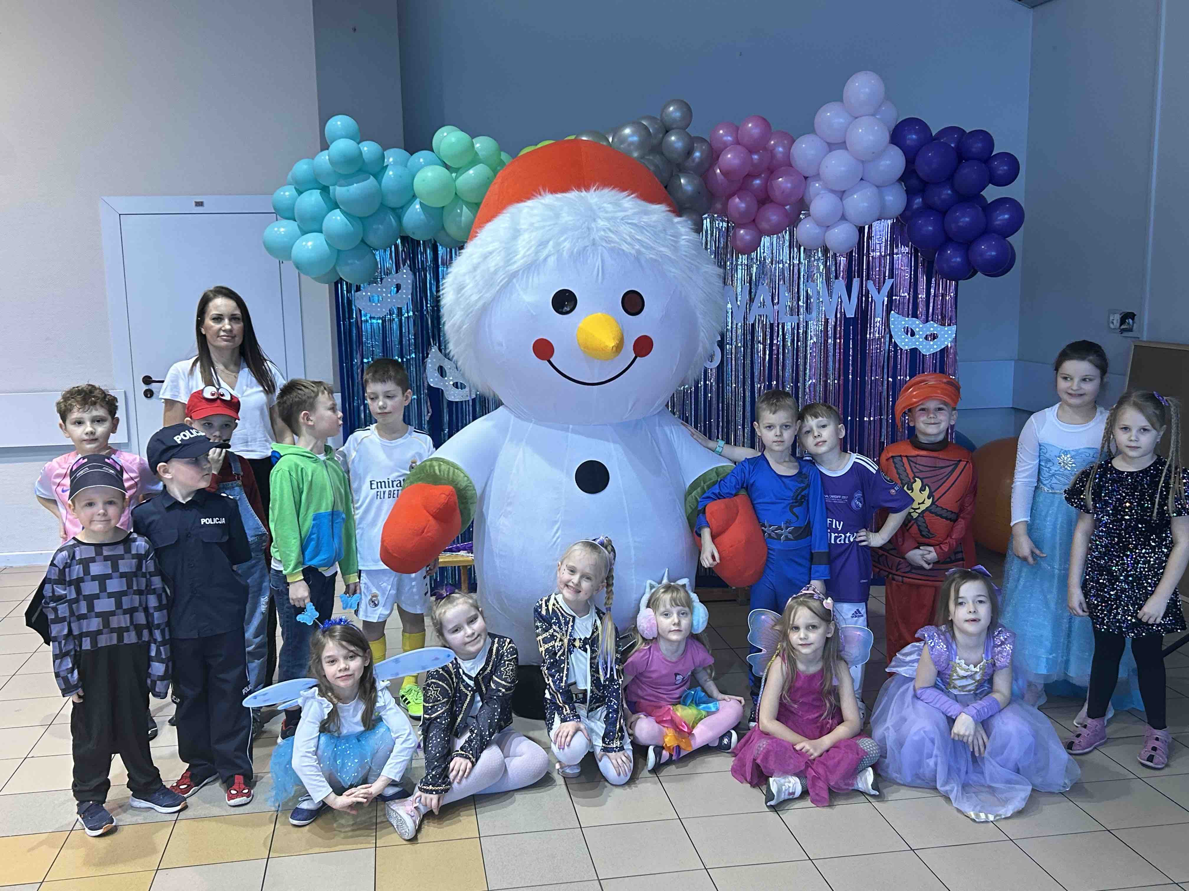 Na miejscu przedszkolaki przebrały się w swoje piękne stroje - można było spotkać księżniczki, super bohaterów, zwierzątka, policjantów, strażaków i wiele innych bajkowych postaci. Każde dziecko z dumą prezentowało swój kostium podczas wspólnych tańców i zabaw przy muzyce. O doskonałą zabawę zadbali profesjonalni animatorzy, którzy przygotowali mnóstwo konkursów, gier i tanecznych niespodzianek. Były wspólne pląsy, zabawy ruchowe, a także wesołe wyzwania, które wywołały dużo śmiechu. Ogromną atrakcją balu była wizyta gości - wesołego Bałwanka oraz sympatycznej Pandy. Maskotki wspólnie z dziećmi tańczyły, przytulały się i pozowały do pamiątkowych zdjęć.