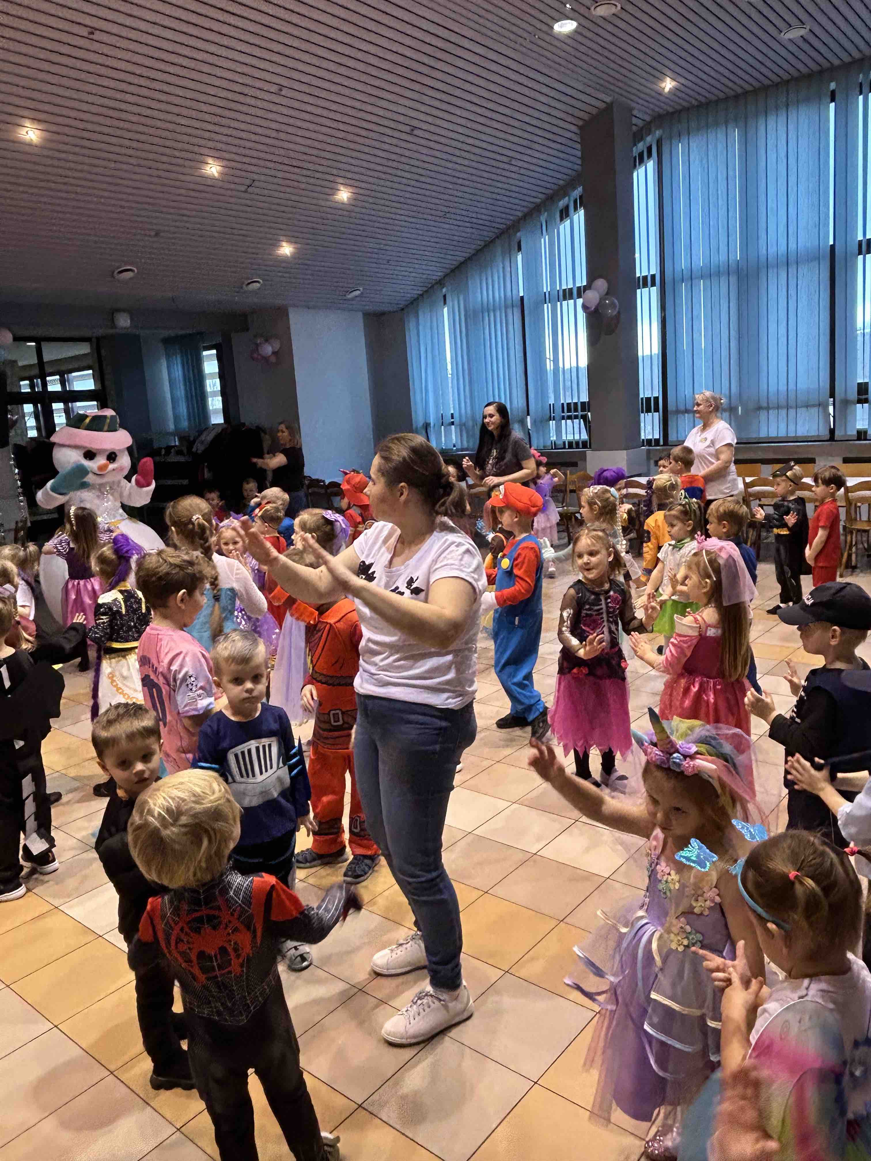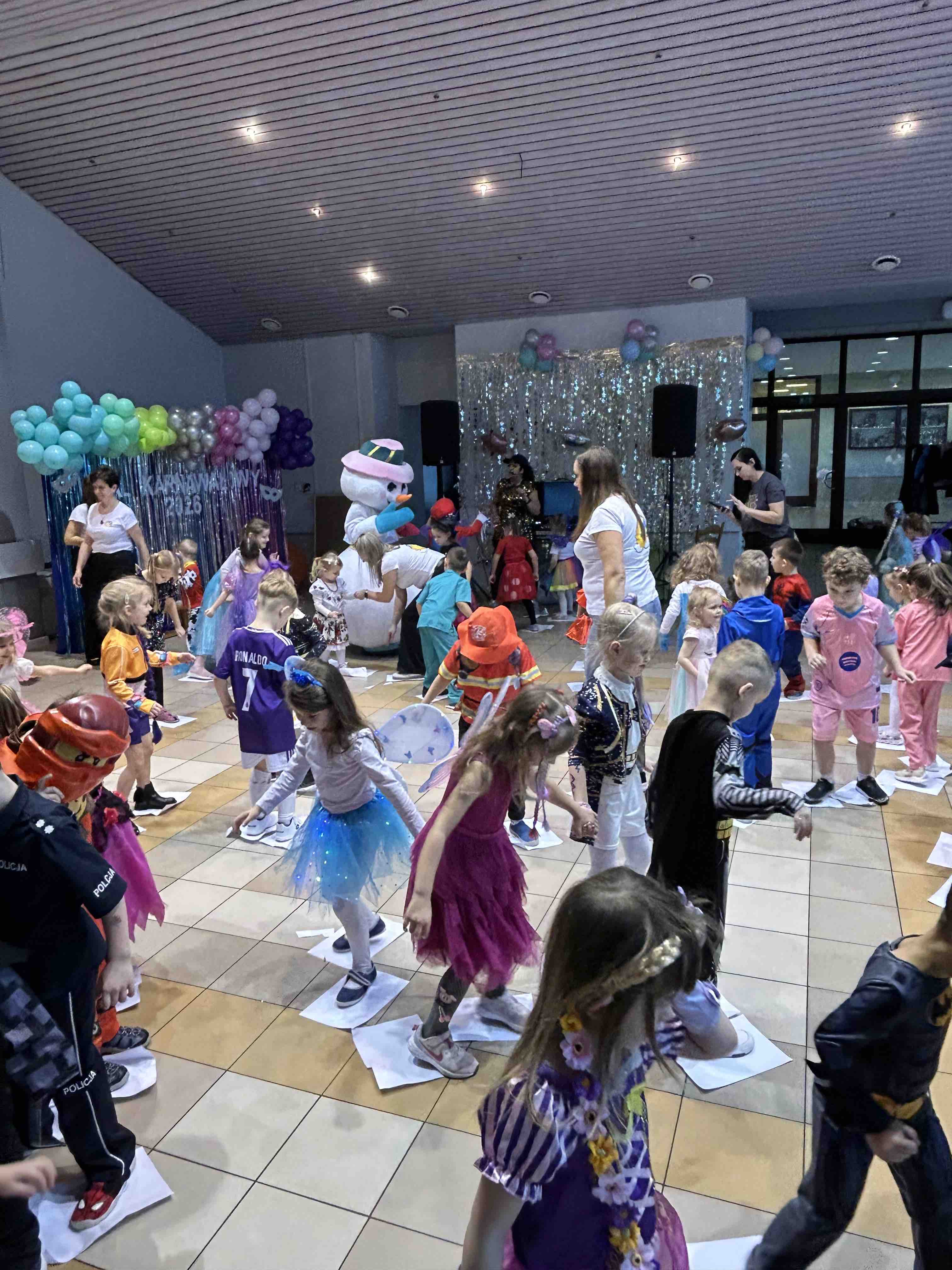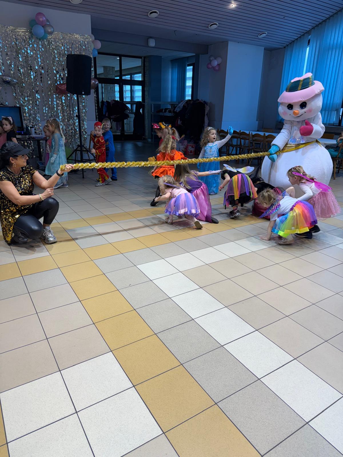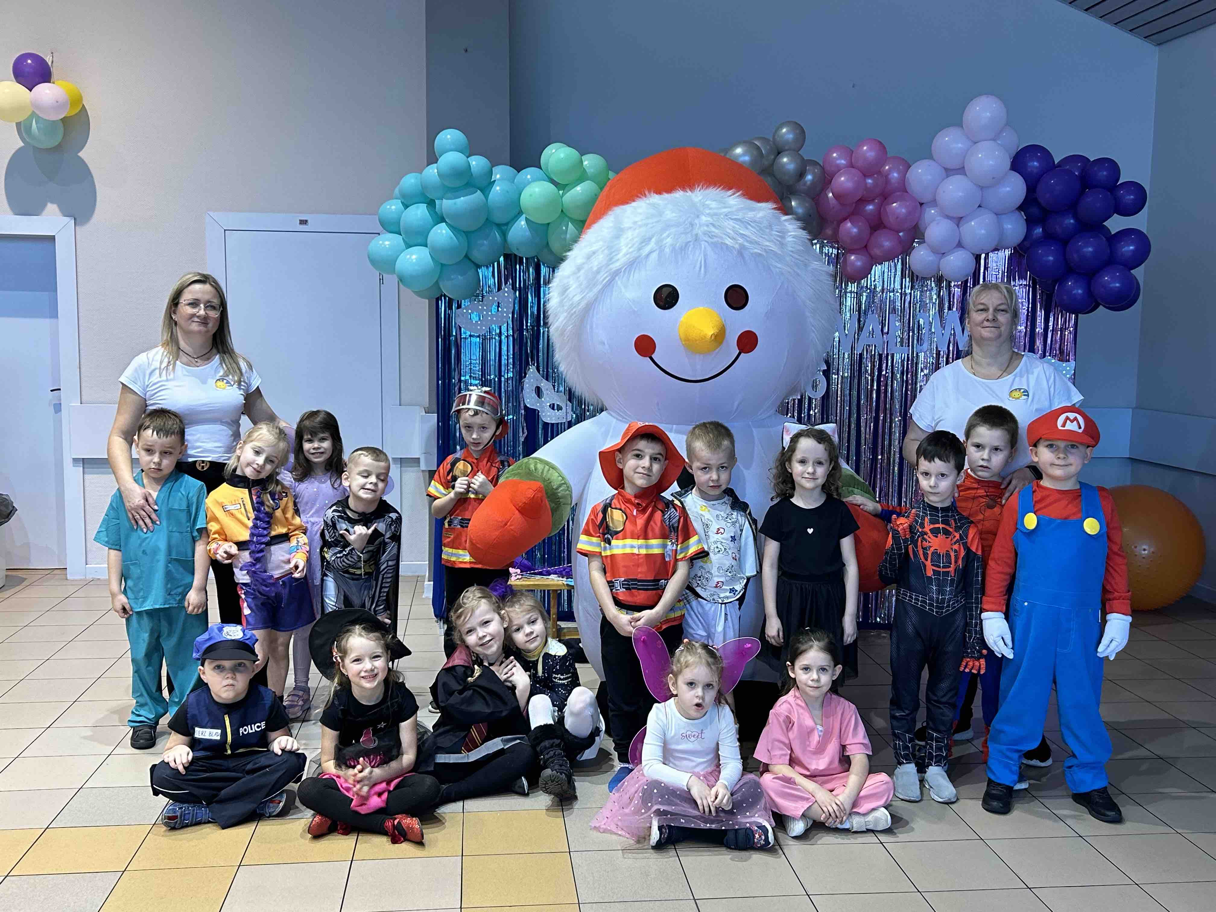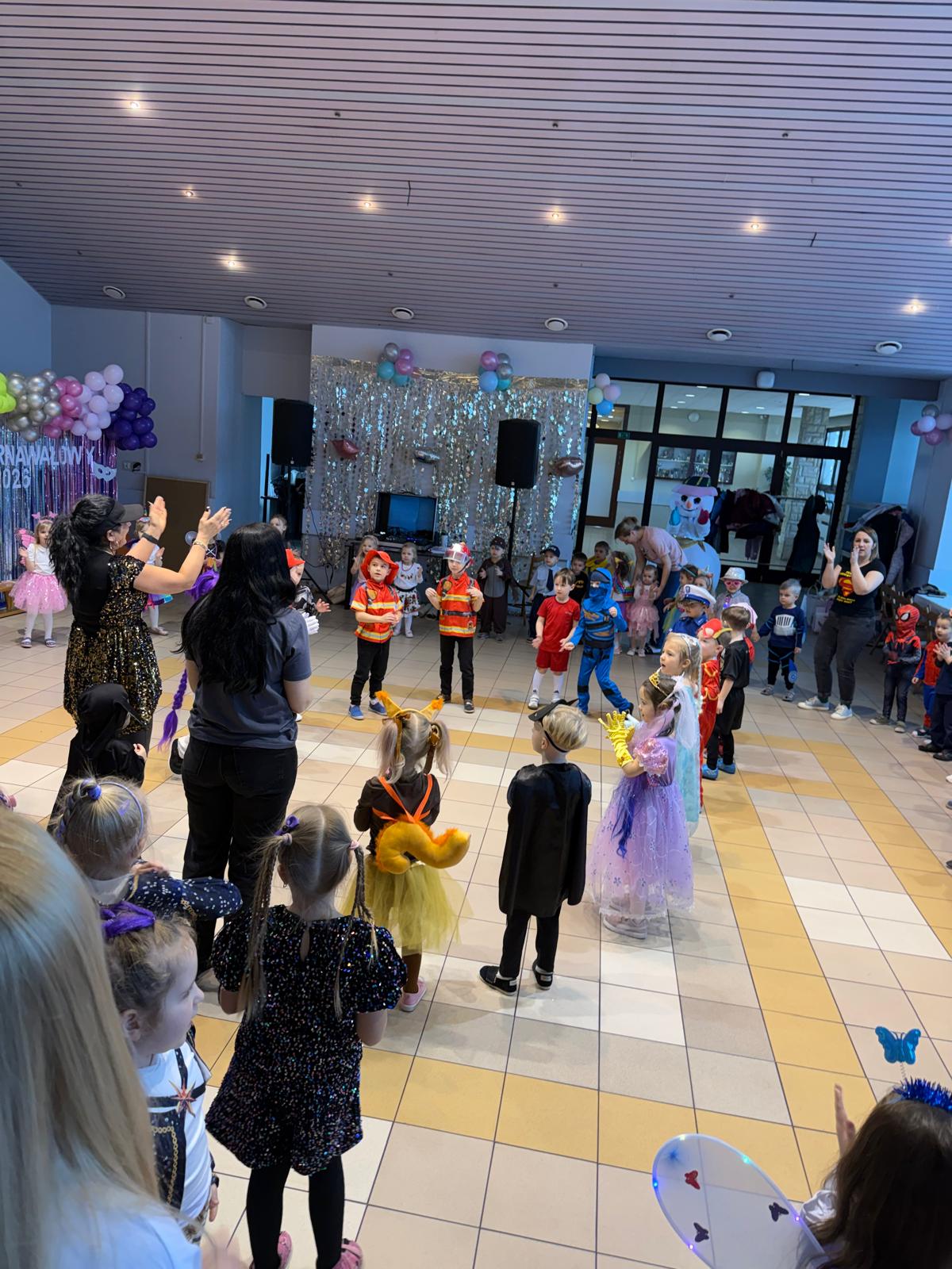 Na miejscu przedszkolaki przebrały się w swoje piękne stroje - można było spotkać księżniczki, super bohaterów, zwierzątka, policjantów, strażaków i wiele innych bajkowych postaci. Każde dziecko z dumą prezentowało swój kostium podczas wspólnych tańców i zabaw przy muzyce. O doskonałą zabawę zadbali profesjonalni animatorzy, którzy przygotowali mnóstwo konkursów, gier i tanecznych niespodzianek. Były wspólne pląsy, zabawy ruchowe, a także wesołe wyzwania, które wywołały dużo śmiechu. Ogromną atrakcją balu była wizyta gości - wesołego Bałwanka oraz sympatycznej Pandy. Maskotki wspólnie z dziećmi tańczyły, przytulały się i pozowały do pamiątkowych zdjęć.