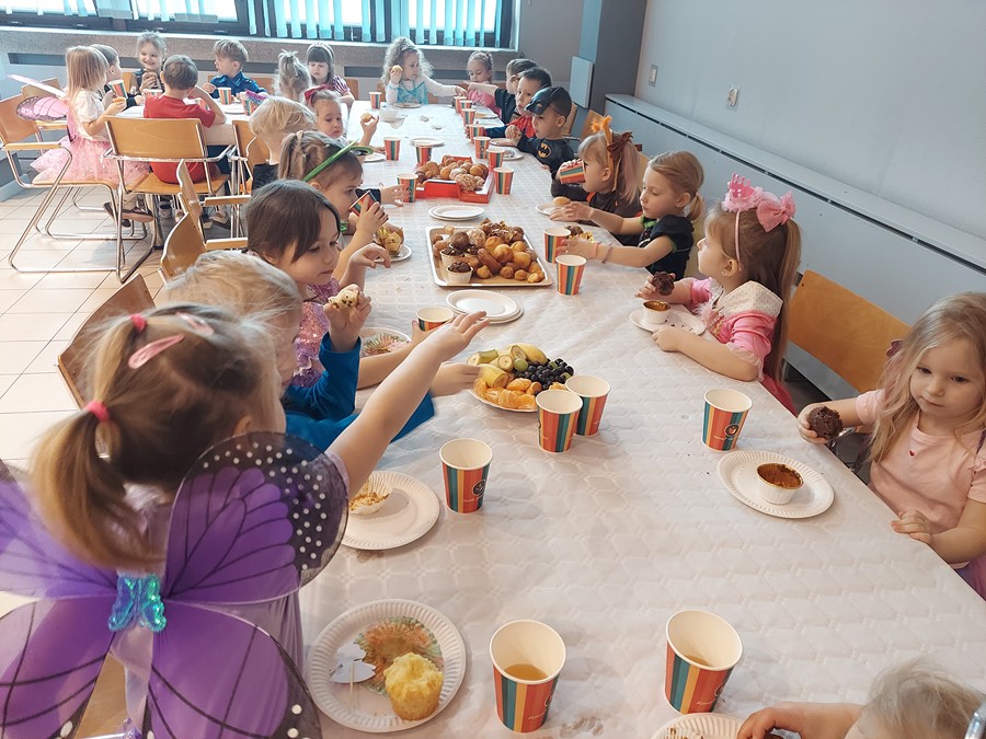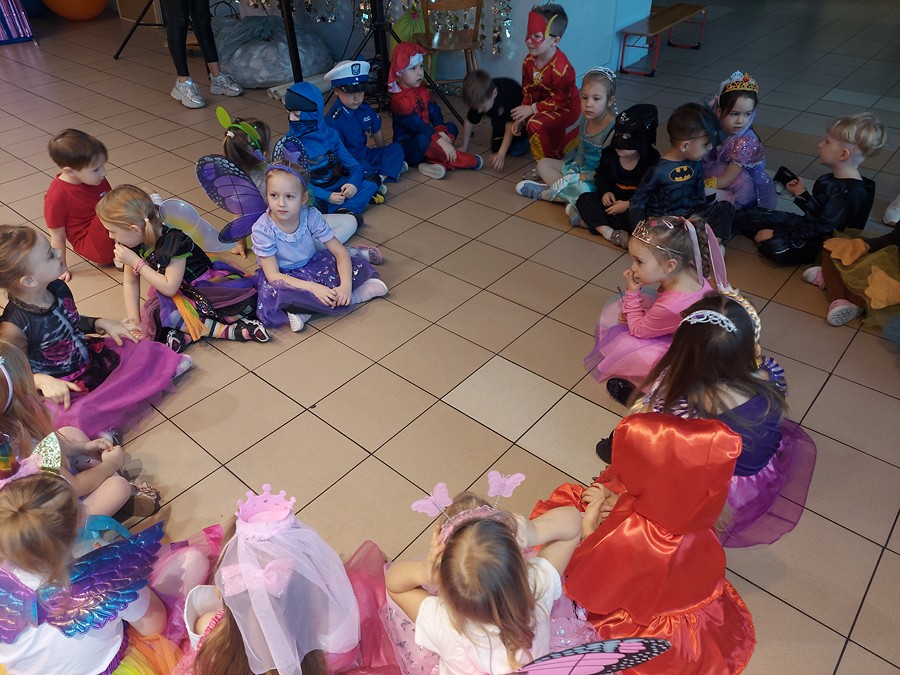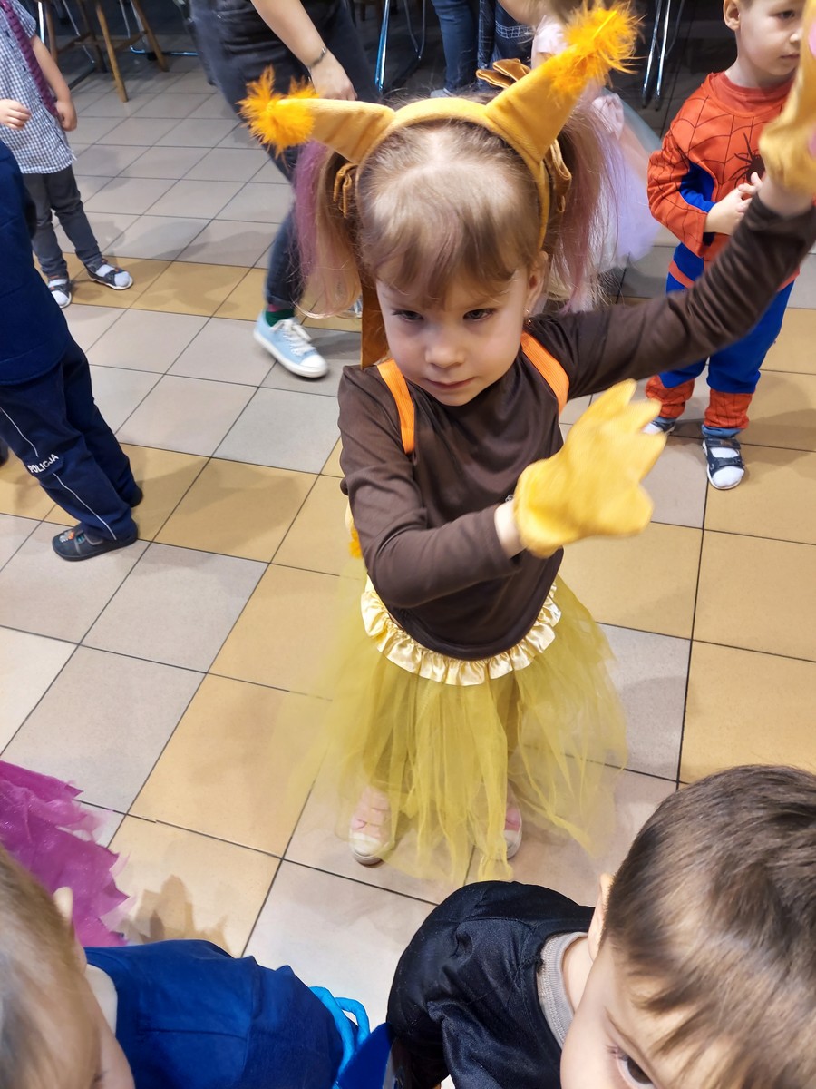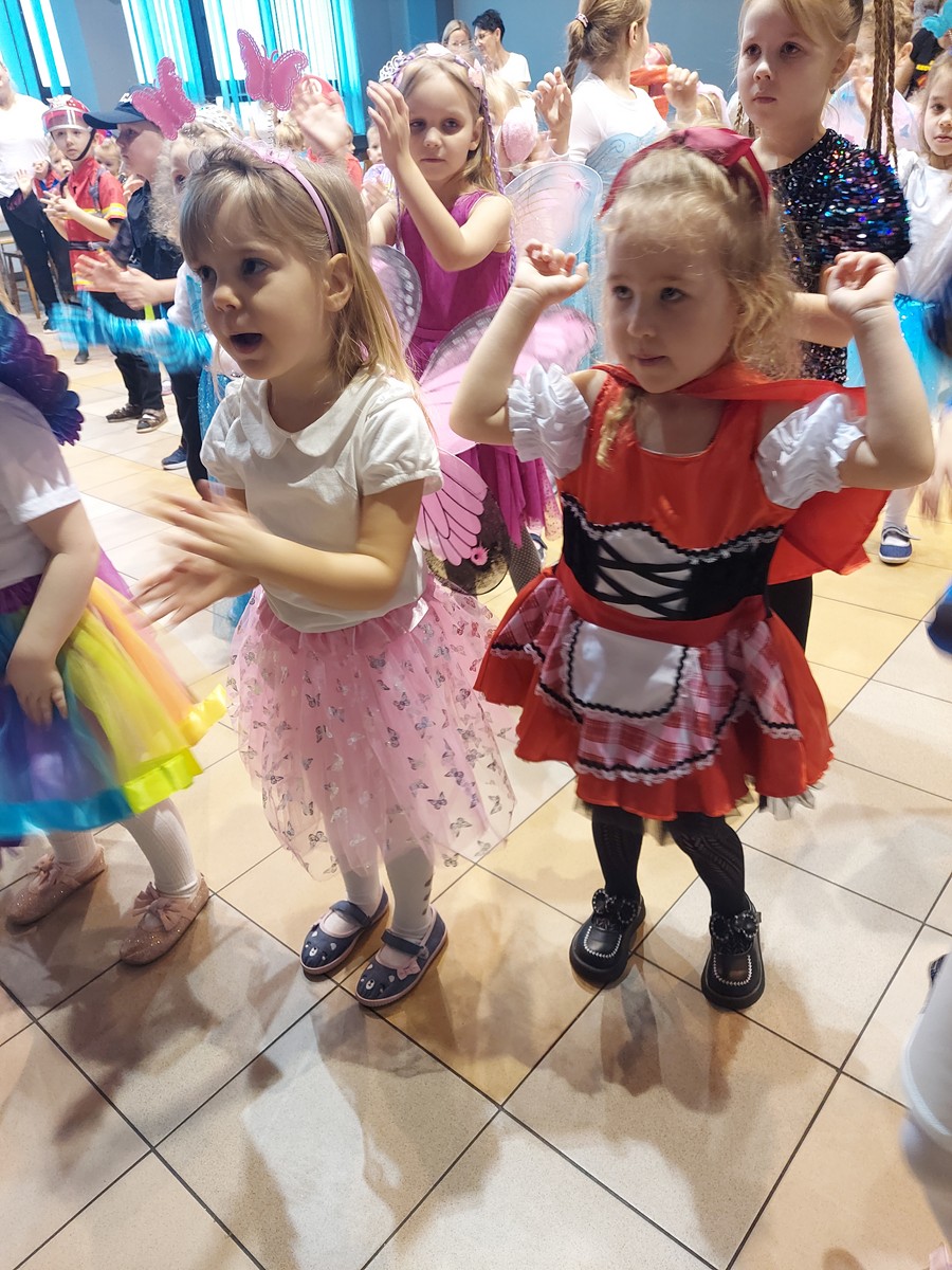 Czterolatki świetnie się bawiły i uczestniczyły we wspólnych zabawach organizowanych przez grupę Rytmiks, a skoczna i rytmiczna muzyka zachęcała do tańca. Wszystkim towarzyszył uśmiech na twarzy, a kiedy czas zabawy dobiegł końca dzieci z żalem opuszczały salę balową. Tego dnia nie mogło się obyć bez słodkiego i owocowego poczęstunku oraz pamiątkowych zdjęć.