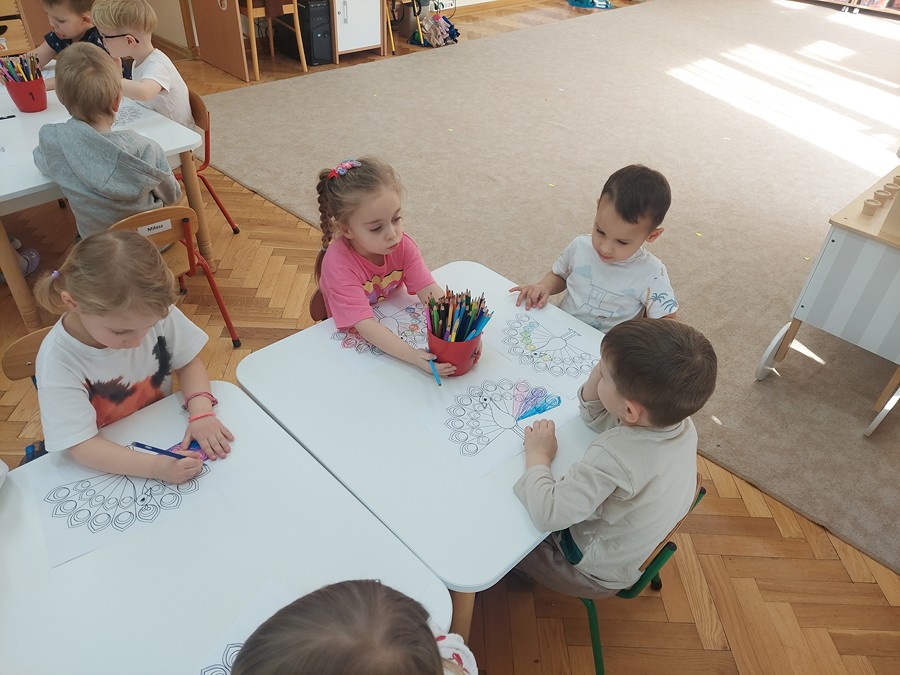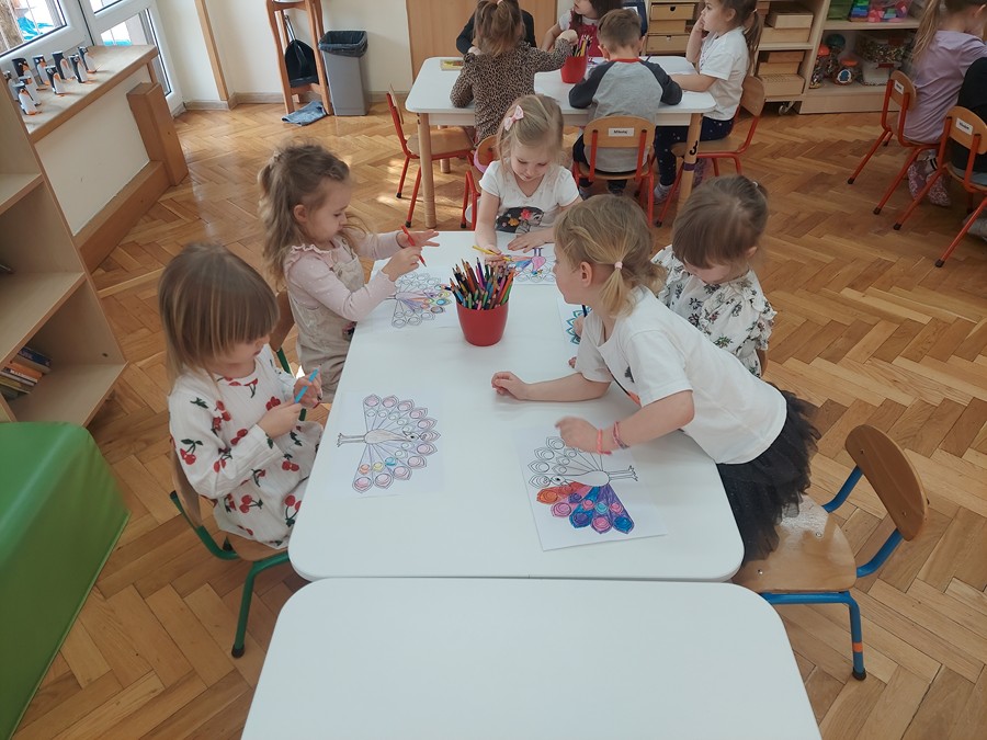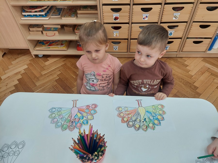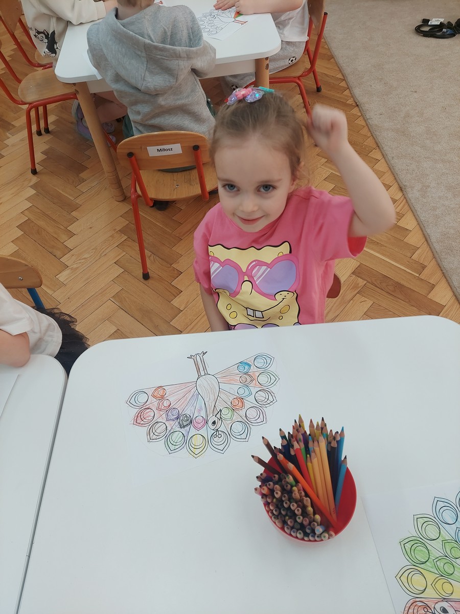 Czterolatki dowiedziały się również, co oznacza frazeologizm „być dumnym jak paw”. Następnie pokolorowały malowankę „Pawia”, a także wkleiły postać Brawojki do emocjonalnych książeczek. Podczas tej aktywności rozwijały kreatywność oraz sprawność manualną.