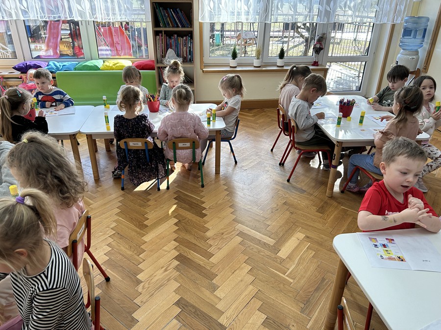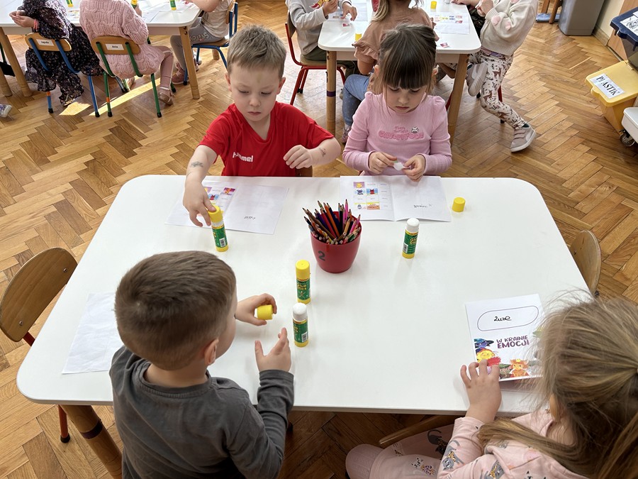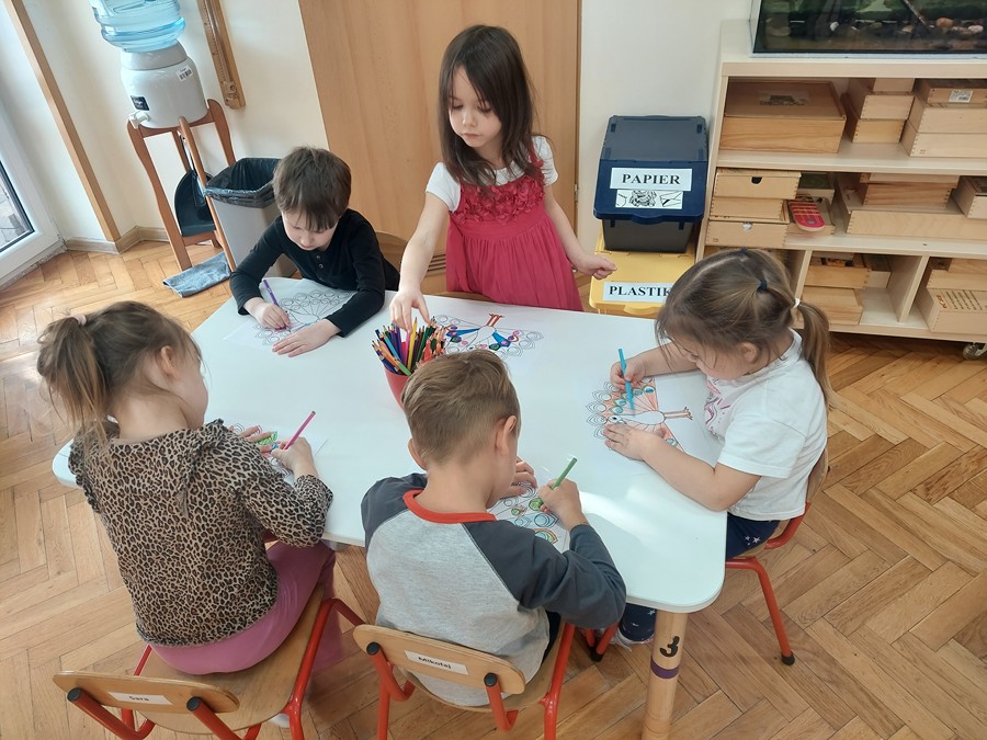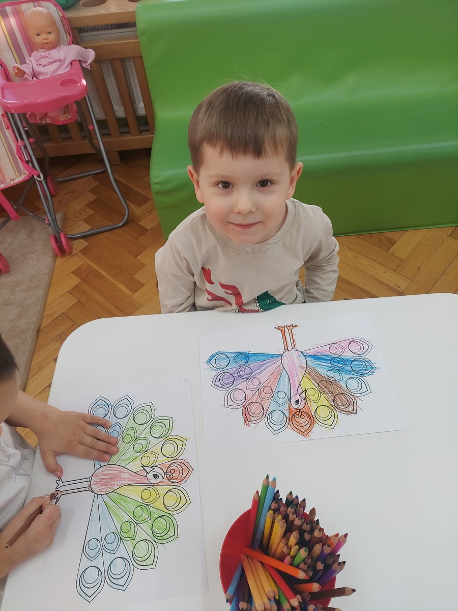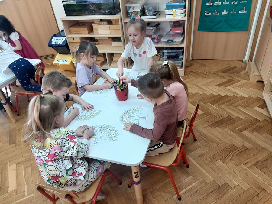 Czterolatki dowiedziały się również, co oznacza frazeologizm „być dumnym jak paw”. Następnie pokolorowały malowankę „Pawia”, a także wkleiły postać Brawojki do emocjonalnych książeczek. Podczas tej aktywności rozwijały kreatywność oraz sprawność manualną.