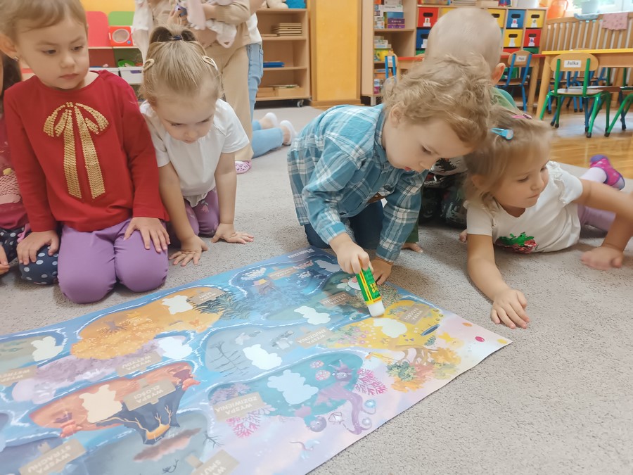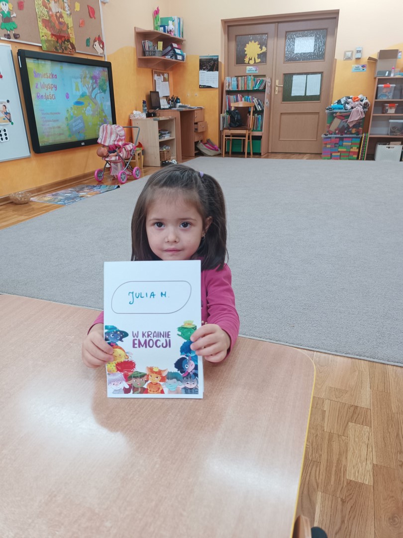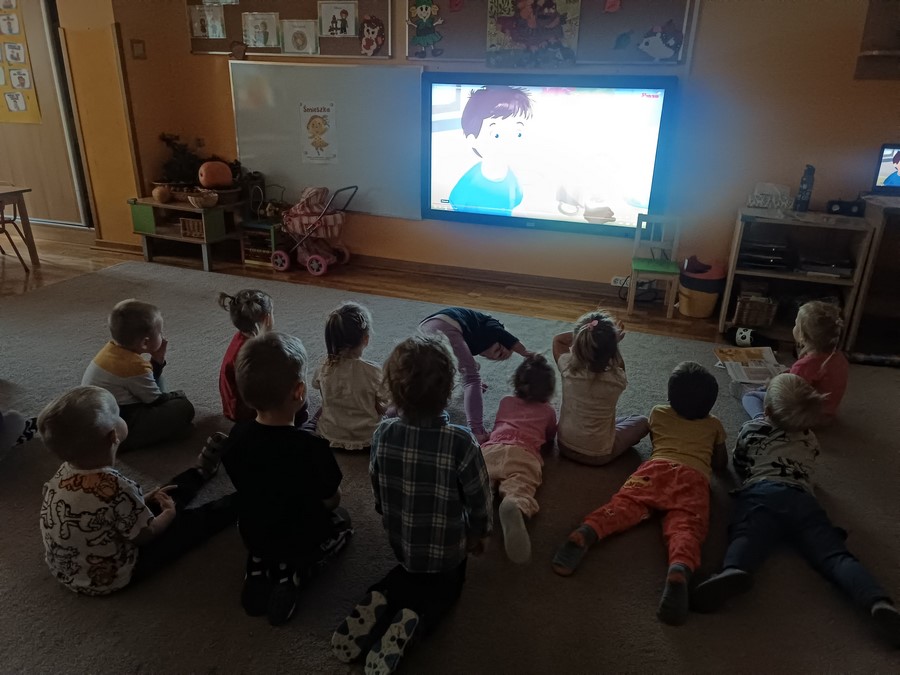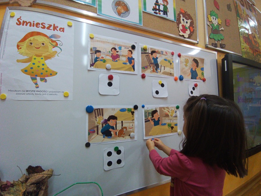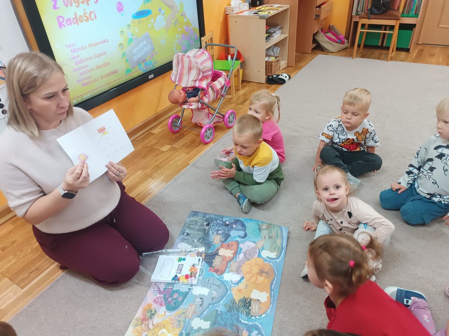 W październiku dzieci poznały Śmieszkę z Wyspy Radości. Przedszkolaki obejrzały bajkę o Śmieszce, która wprowadziła najmłodszych w temat emocji, a szczególnie radości. Dzieci odkrywały, co sprawia im przyjemność, jak wygląda radosna buzia i w jaki sposób mogą dzielić się uśmiechem z innymi.