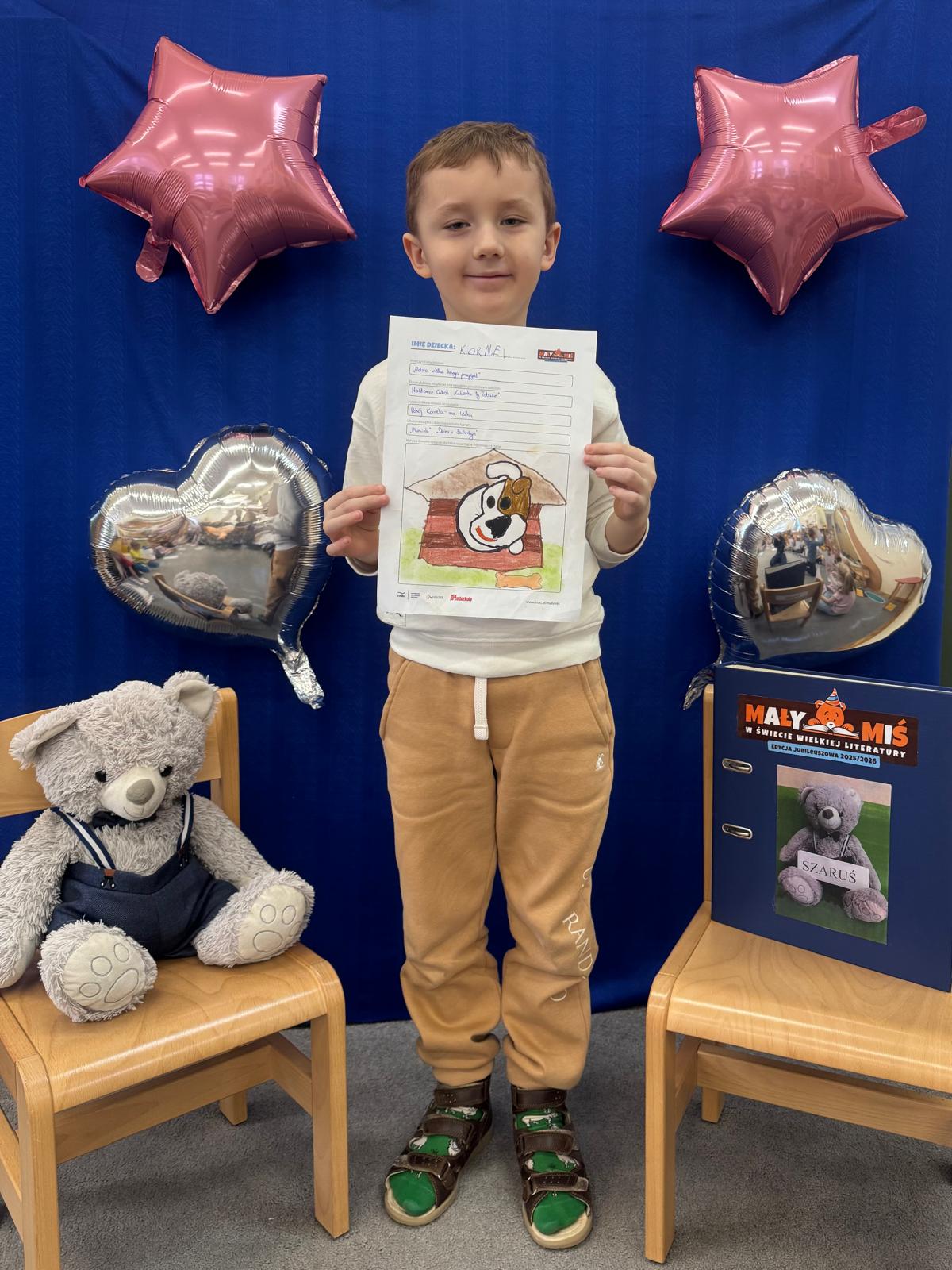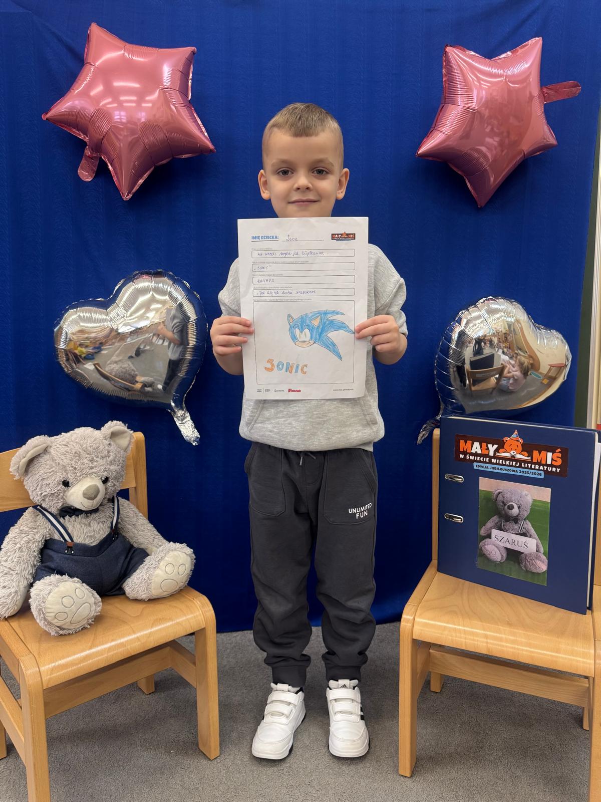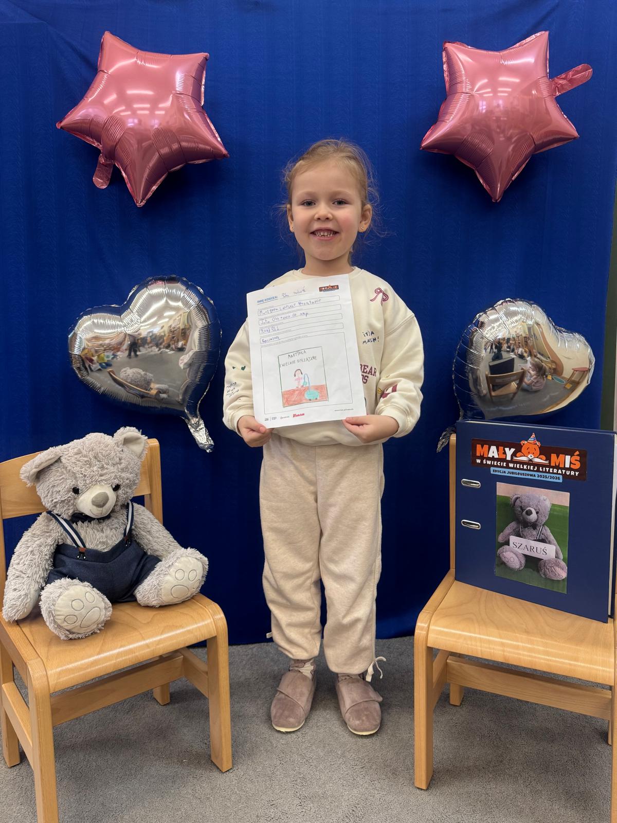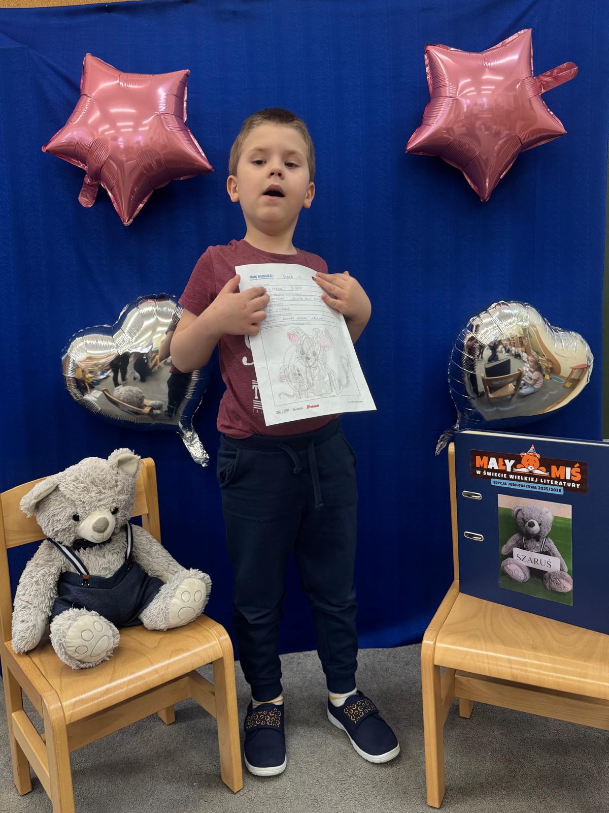 Na początku przedszkolaki wspólnie z nauczycielem wybrały grupową maskotkę – misia, który stał się przewodnikiem po świecie książek. Miś otrzymał imię - Szaruś i zamieszkał w naszym kąciku czytelniczym. Towarzyszy dzieciom podczas zajęć dydaktycznych oraz zabaw, inspirując do rozmów o literaturze i rozwijania wyobraźni.