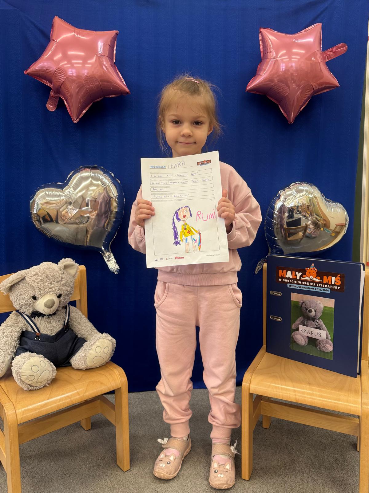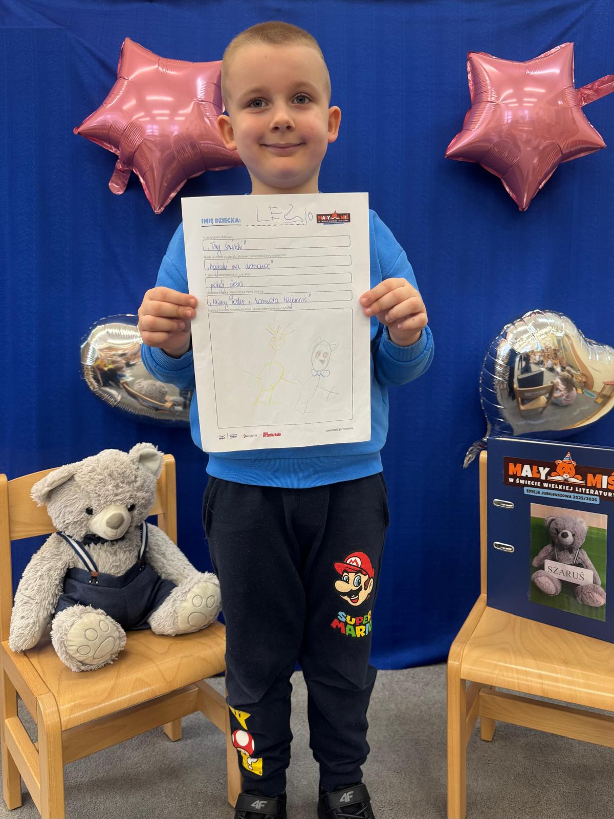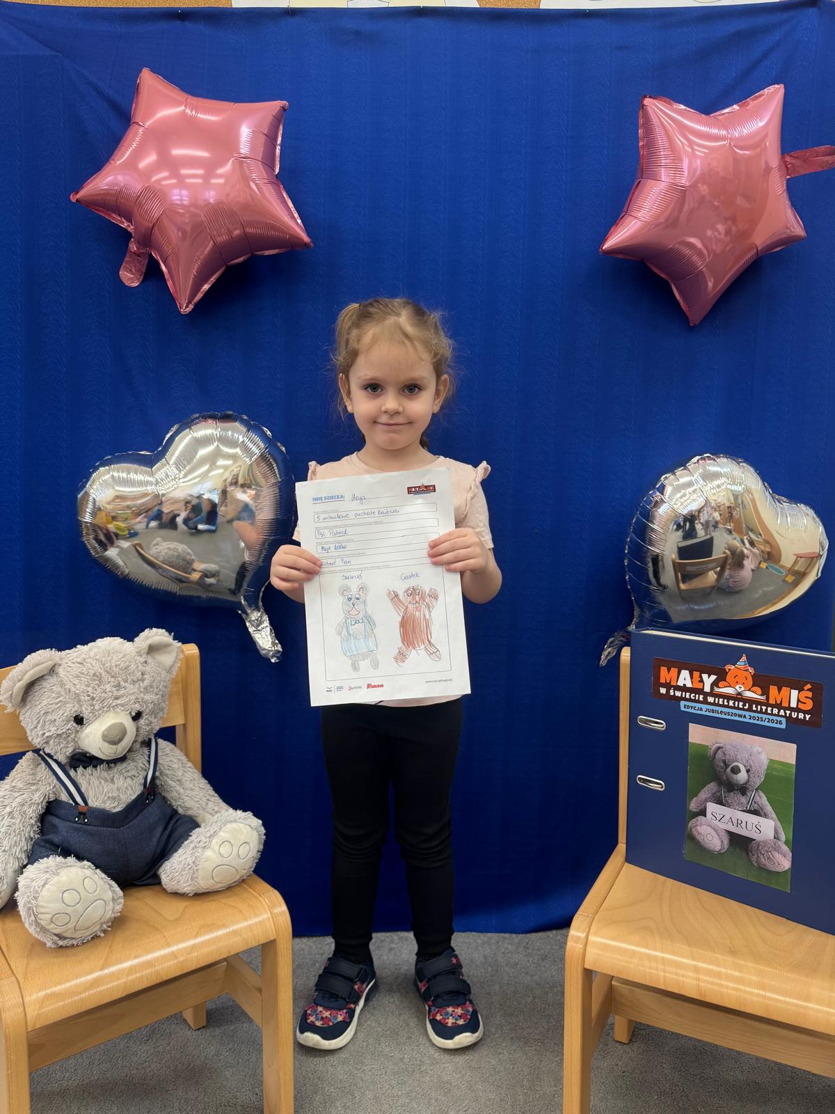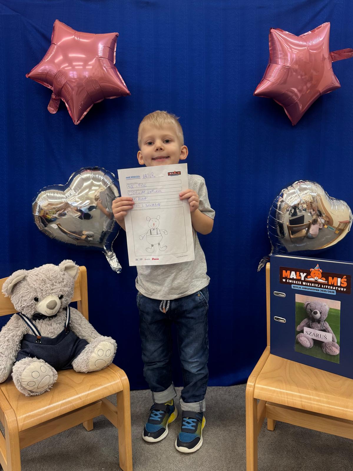 Na początku przedszkolaki wspólnie z nauczycielem wybrały grupową maskotkę – misia, który stał się przewodnikiem po świecie książek. Miś otrzymał imię - Szaruś i zamieszkał w naszym kąciku czytelniczym. Towarzyszy dzieciom podczas zajęć dydaktycznych oraz zabaw, inspirując do rozmów o literaturze i rozwijania wyobraźni.