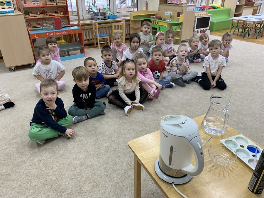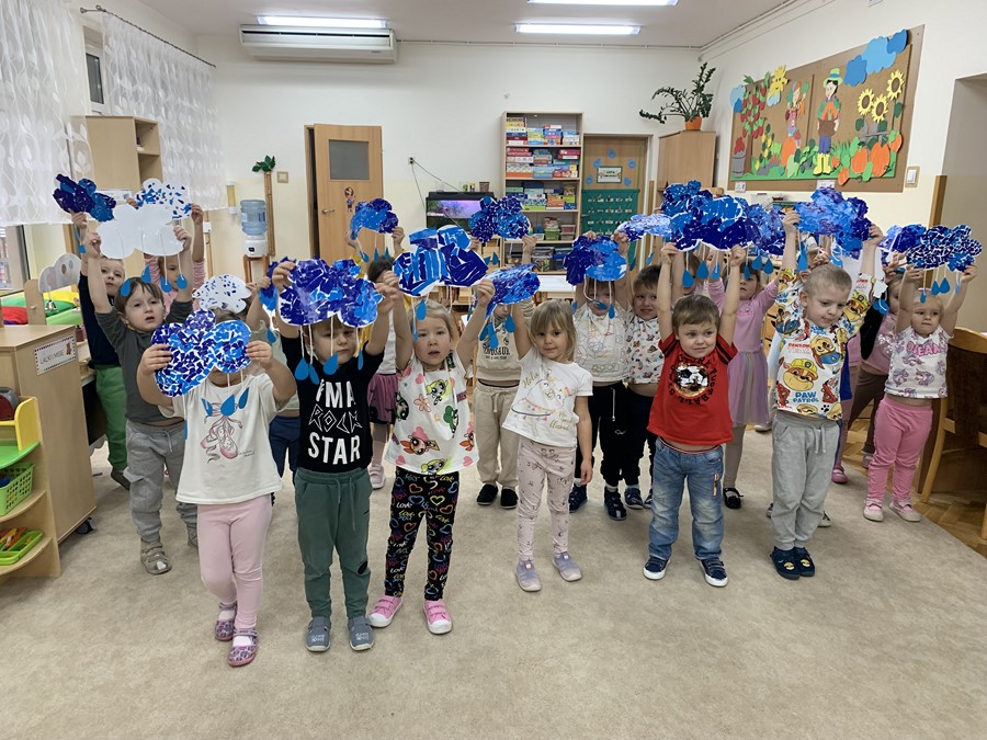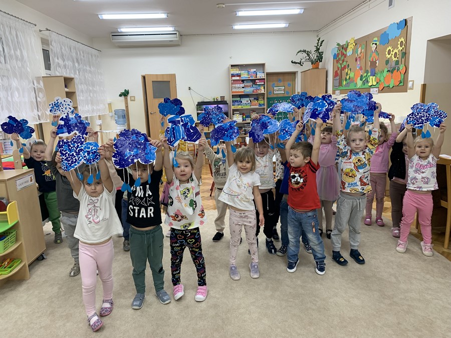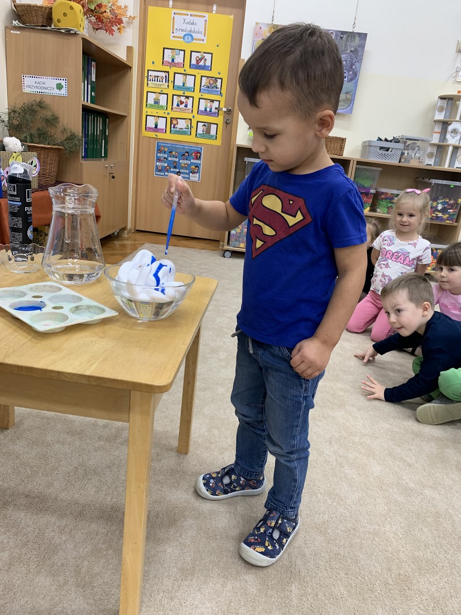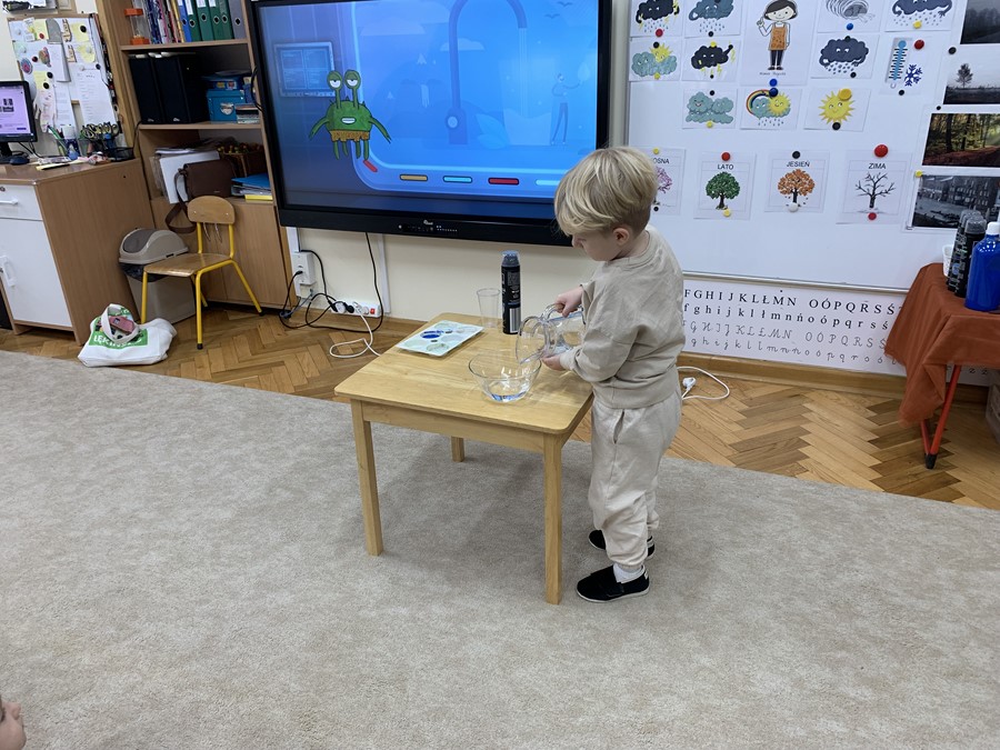Na początku dzieci obejrzały filmik edukacyjny, z którego poznały obieg wody w przyrodzie, a także dowiedziały się w jaki sposób powstaje deszcz. Kropelki chętnie brały udział w eksperymentach z wodą i osobiście przeprowadziły doświadczenie z chmurą deszczową, wywołując niebieski deszcz w słoiku.