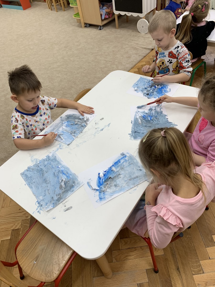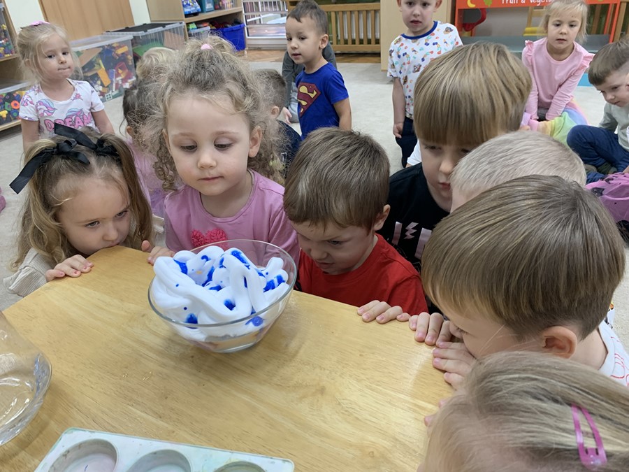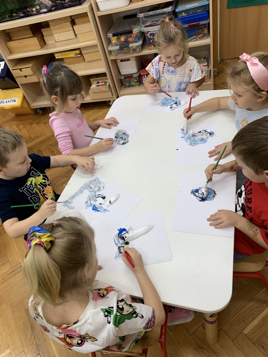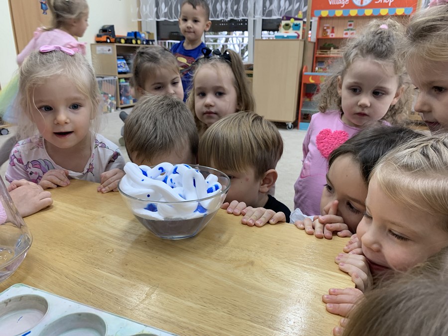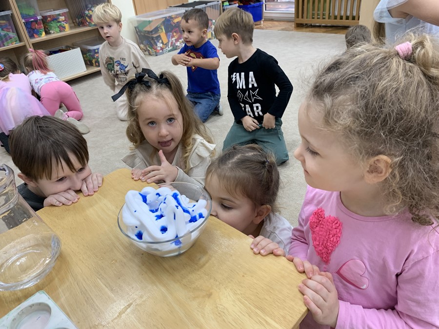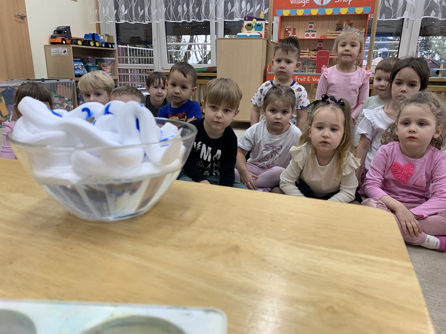 Zabawy badawcze lubią wszystkie przedszkolaki. Dzieci z grupy 4-latków zastanawiały się jak powstaje deszczowa chmura. W tym celu przeprowadziliśmy eksperyment przy użyciu pianki do golenia.