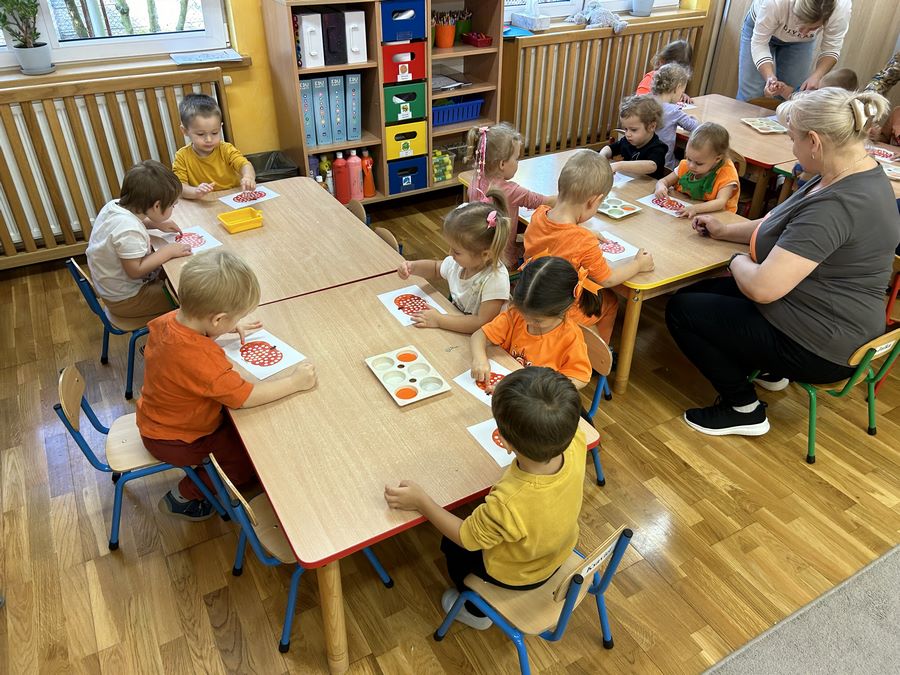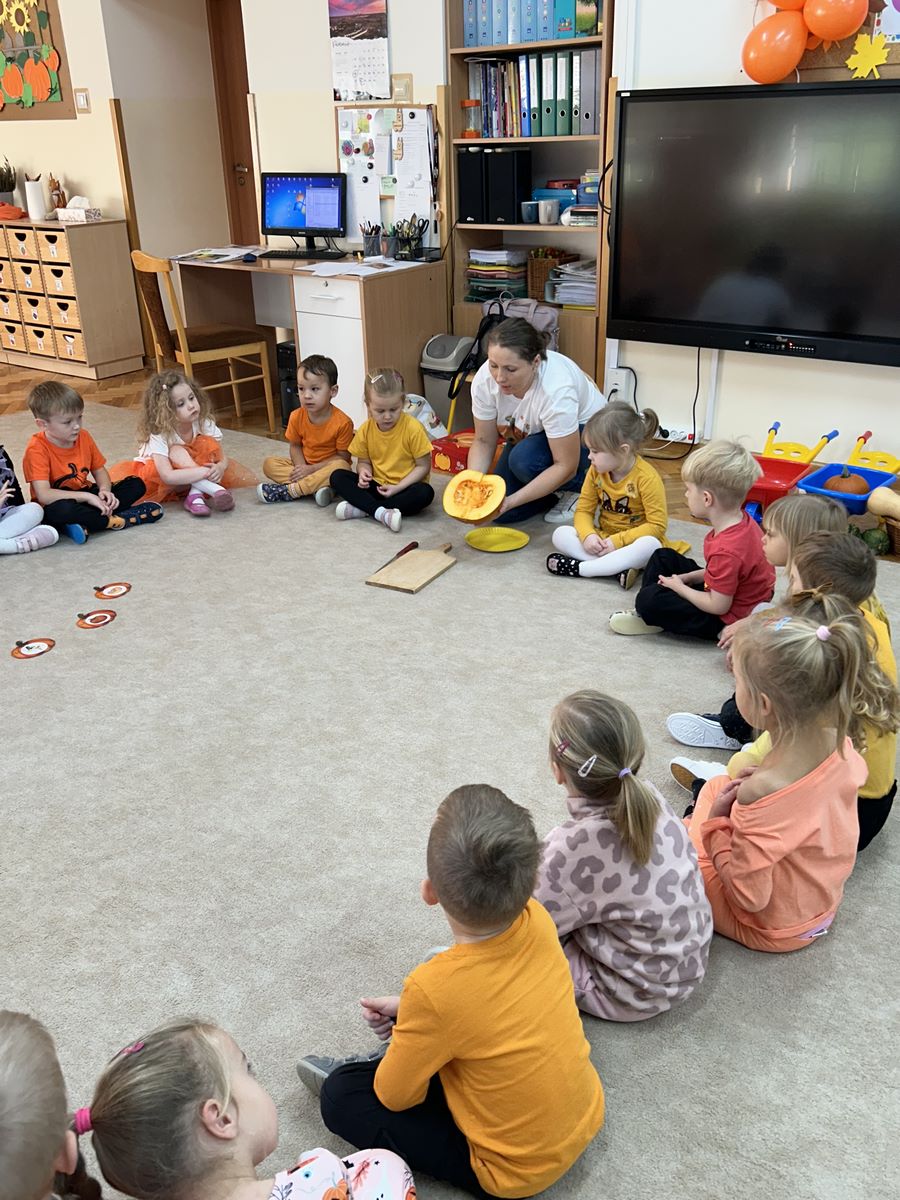 Na początku dzieci wysłuchały bajki pt.„Od ziarenka do dyni”, dzięki której poznały cykl rozwojowy tej niezwykłej rośliny. Z zainteresowaniem słuchały, jak z maleńkiego ziarenka wyrasta pnącze, a potem dorodna dynia. Po lekturze odbyła się rozmowa o tym, do czego można wykorzystać dynię i jakie ma właściwości odżywcze. Przedszkolaki z zachwytem słuchały ciekawostki o dyniach, że istnieje ich wiele gatunków, że mogą być nie tylko pomarańczowe, ale też żółte, zielone, a nawet białe. Dzieci dowiedziały się również, że z dyni można zrobić zupę, ciasto a także jeść smaczne pestki. Potem przyszedł czas na prawdziwą naukę poprzez doświadczenie – przedszkolaki mogły zobaczyć przekrój dyni. Z ciekawością oglądały jej wnętrze, dotykały miąższu i wyjmowały pestki. Nie zabrakło też degustacji ziarenek dyni, które okazały się bardzo smaczne i zdrowe. Kolejnym punktem programu były zabawy ruchowe z dyniami, dzieci toczyły je po sali oraz przewoziły w taczkach omijając przeszkody. Przedszkolaki również wykonały pracę plastyczną, malując dynię paluszkami. Powstały wspaniałe, kolorowe dzieła, które ozdobiły przedszkolny korytarz. Na zakończenie dnia wszyscy zebrali się przy foto-budce, gdzie wykonano zdjęcia. Dzień Dyni okazał się nie tylko świetną zabawą, ale też cenną lekcją o przyrodzie i zdrowym odżywianiu. Ten dzień na długo pozostanie w pamięci wszystkich uczestników dziękujemy za wspólną, wspaniałą zabawę.