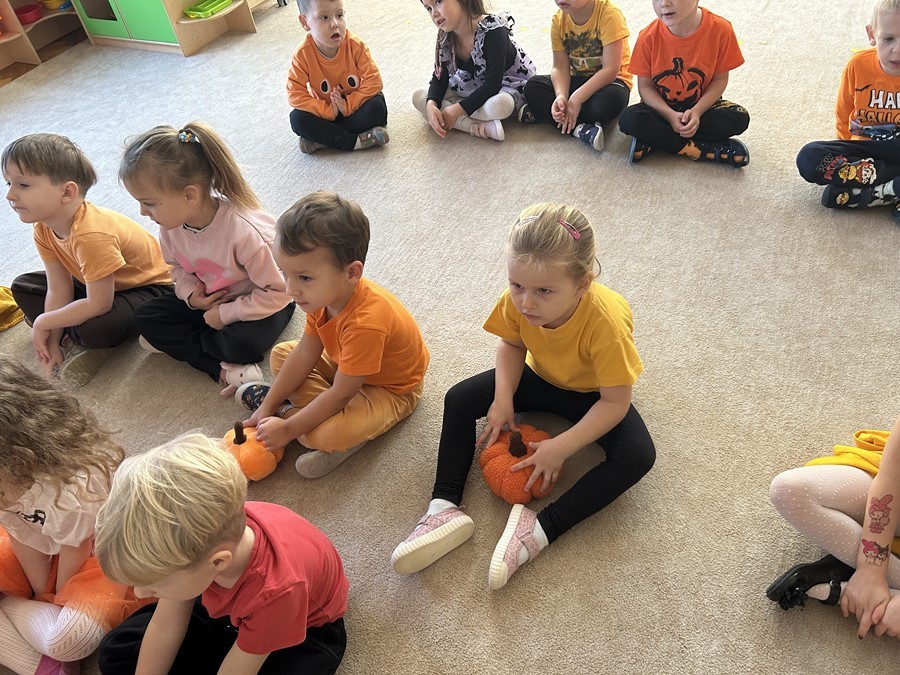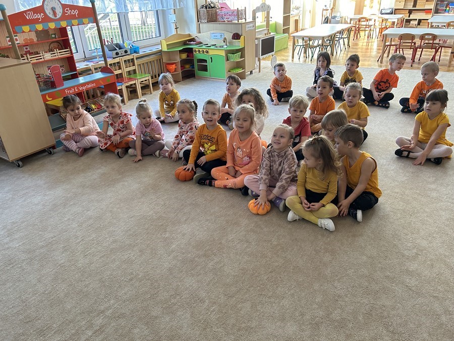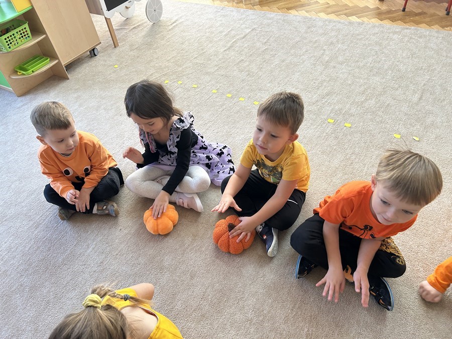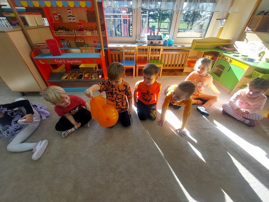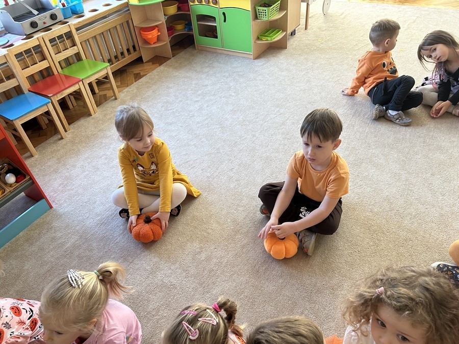 Podczas wspólnych zabaw dzieci brały udział w zabawach z udziałem dyni. Ten dzień przyniósł wiele niezapomnianych wrażeń, ciekawości, odkrywania i zabawy, co widać na zdjęciach poniżej.