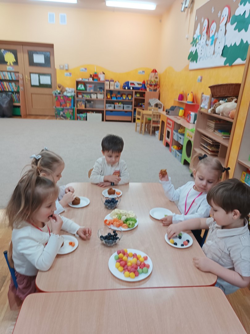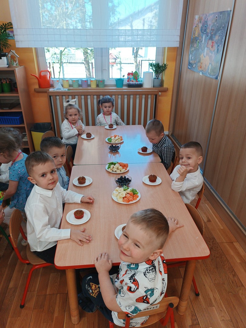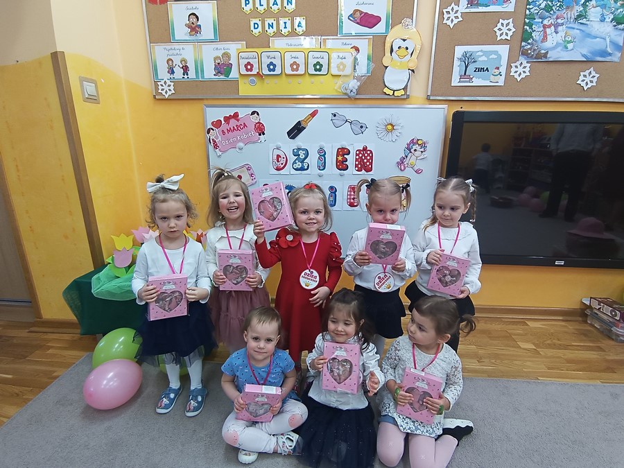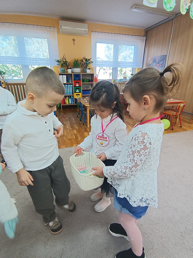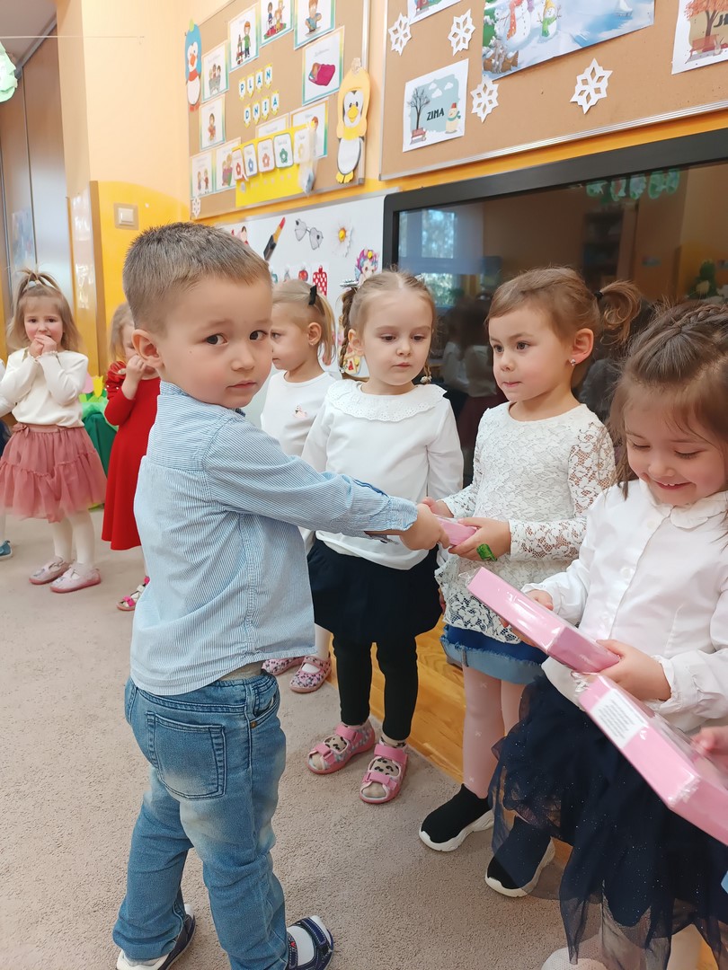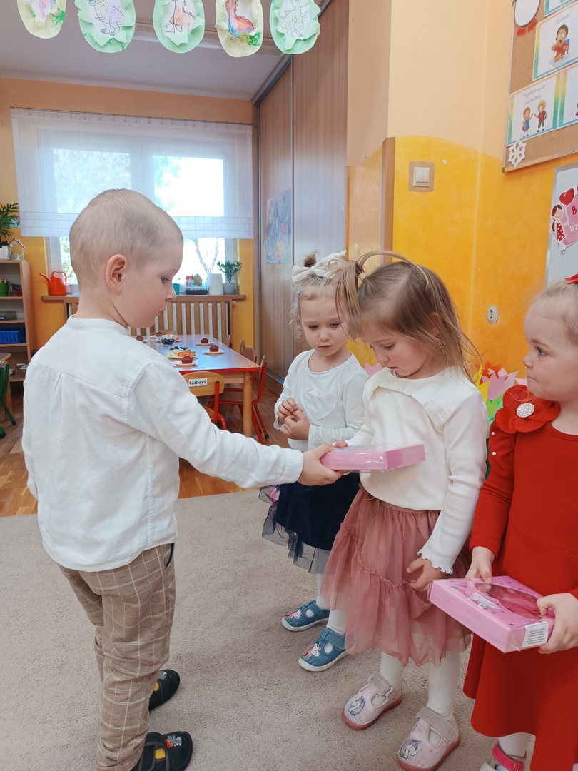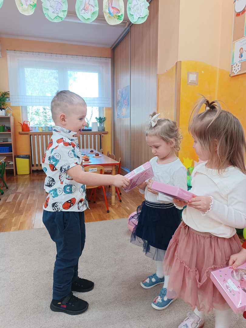 Chłopcy złożyli dziewczynkom serdeczne życzenia oraz wręczyli im drobne upominki. Na zakończenie dzieci czekał także słodki poczęstunek przygotowany przez rodziców. To był bardzo miły i radosny dzień, pełen uśmiechów i wspólnej zabawy.