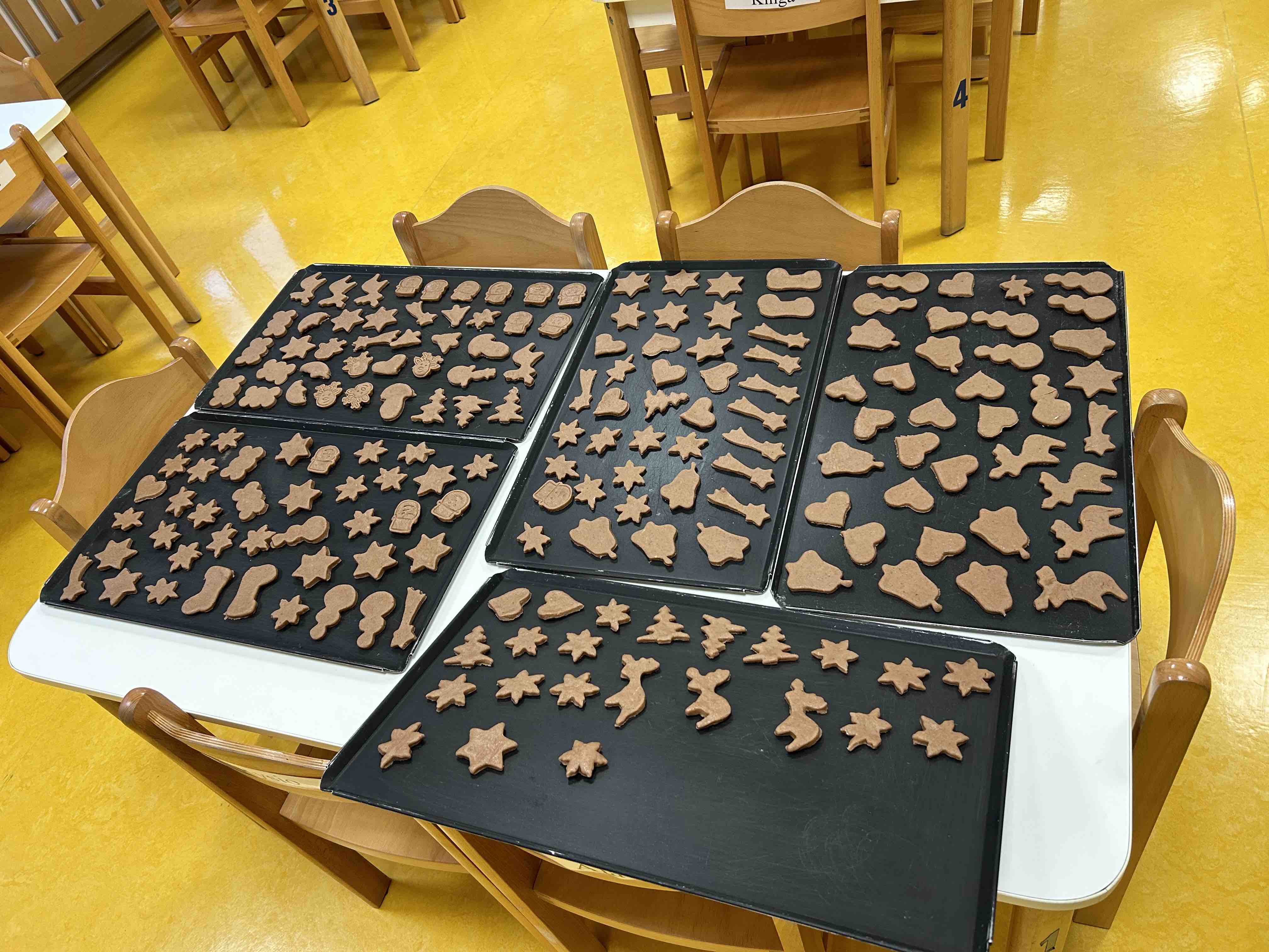 Przez ostatnie dni w naszym przedszkolu unosił się zapach korzennych przypraw. Dzieci poznały sposób wykonania ciasta oraz potrzebne przybory kuchenne do zrobienia pierniczków. Gdy ciasto było gotowe przedszkolaki zabrały się do pracy – wałkowały ciasto i wykrawały ciasteczka. Pełne blaszki pierniczków pod czujnym okiem naszych pań kucharek piekły się w piekarniku, które później dzieci ozdabiały.