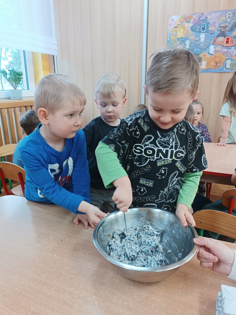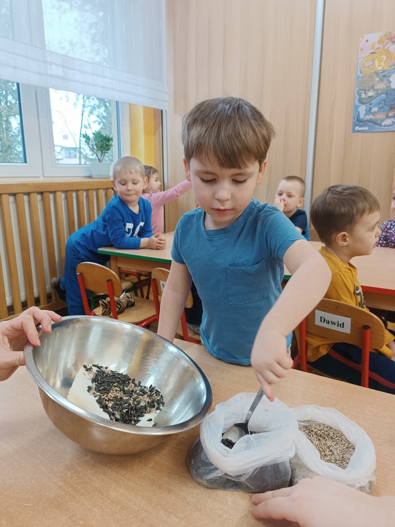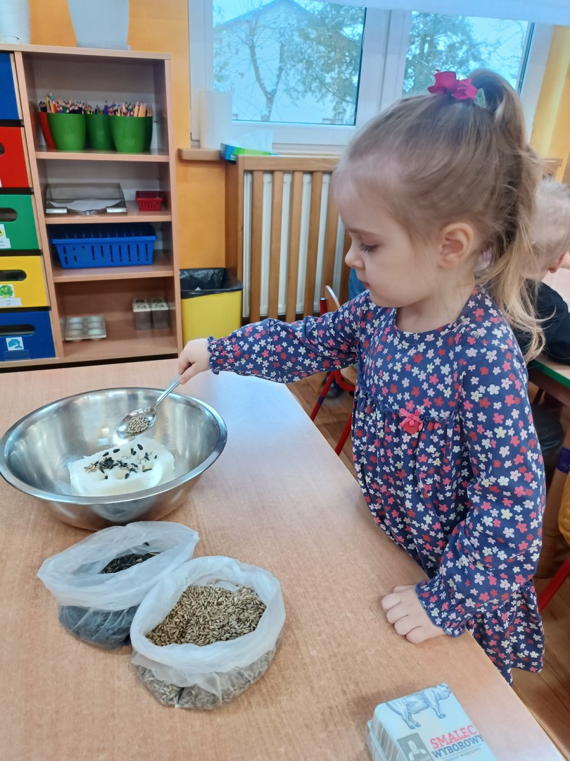 W ramach realizacji tematyki poświęconej ptakom zorganizowaliśmy wydarzenia edukacyjne, których celem było rozwijanie wiedzy przyrodniczej oraz wrażliwości na potrzeby zwierząt. Dzieci poznały różne gatunki ptaków, ich zwyczaje oraz znaczenie dokarmiania ptaków szczególnie w okresie zimowym. Wspólnie przygotowaliśmy i zawiesiliśmy przysmaki dla ptaków, ucząc się przy tym odpowiedzialności i troski o przyrodę. Podczas realizacji tematyki dzieci wykonał pyzy dla ptaków jako jedno z zadań innowacji "Zwierzęta wokół nas"