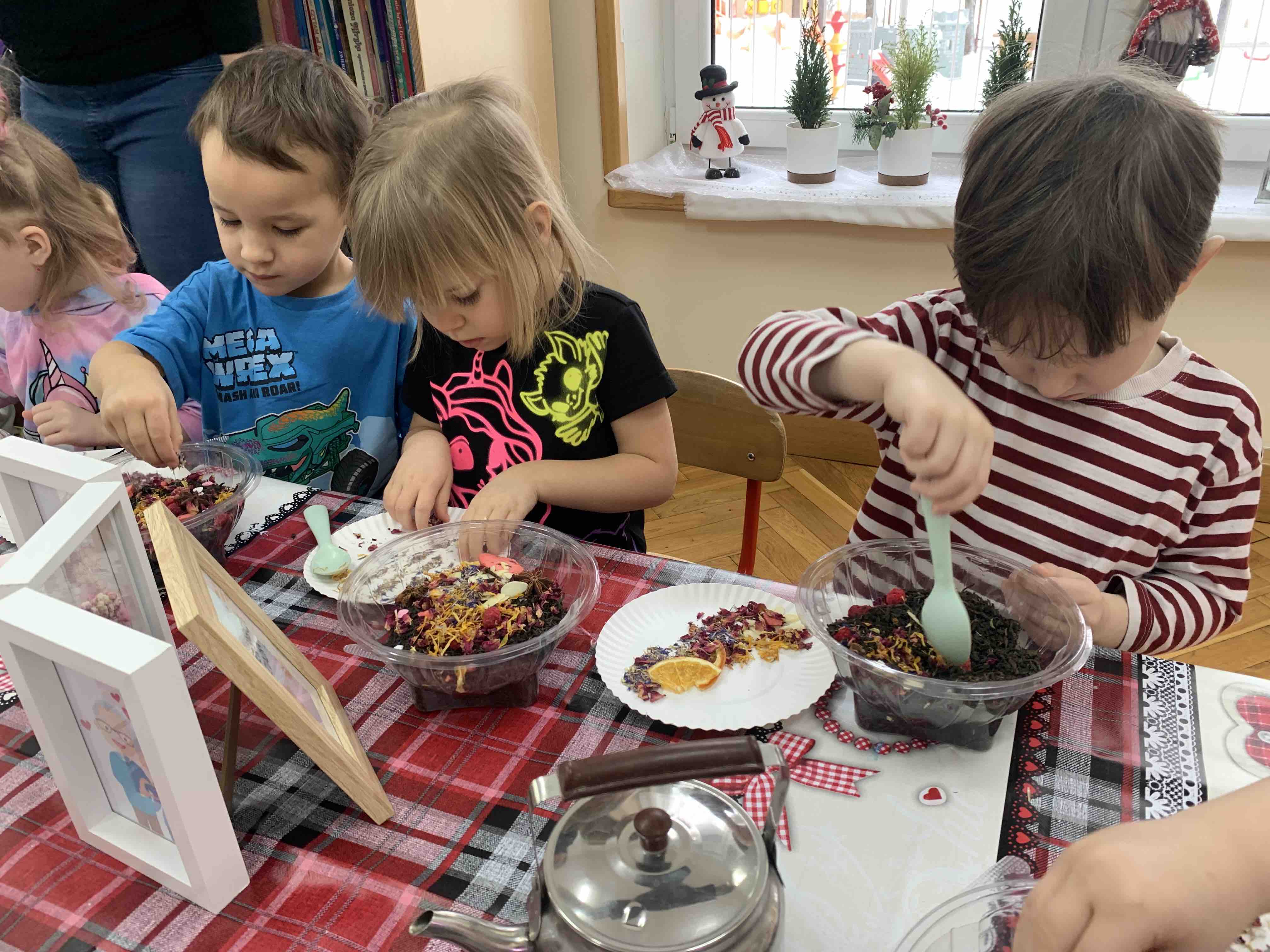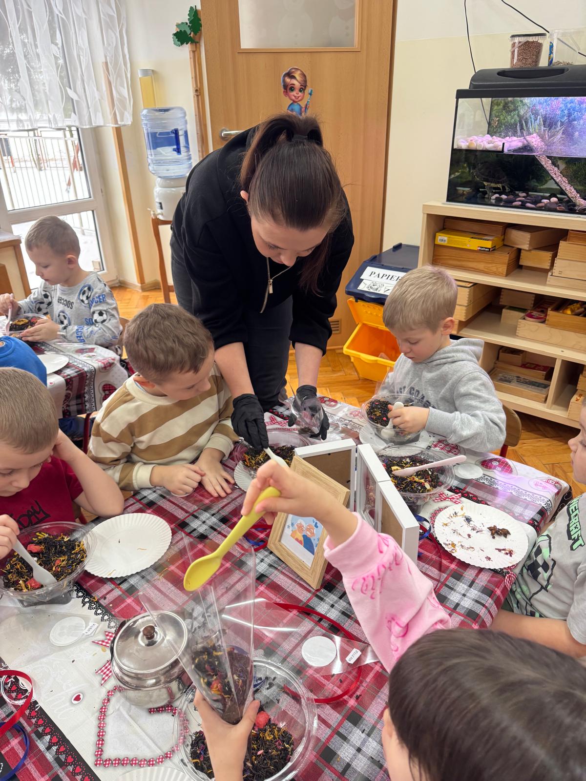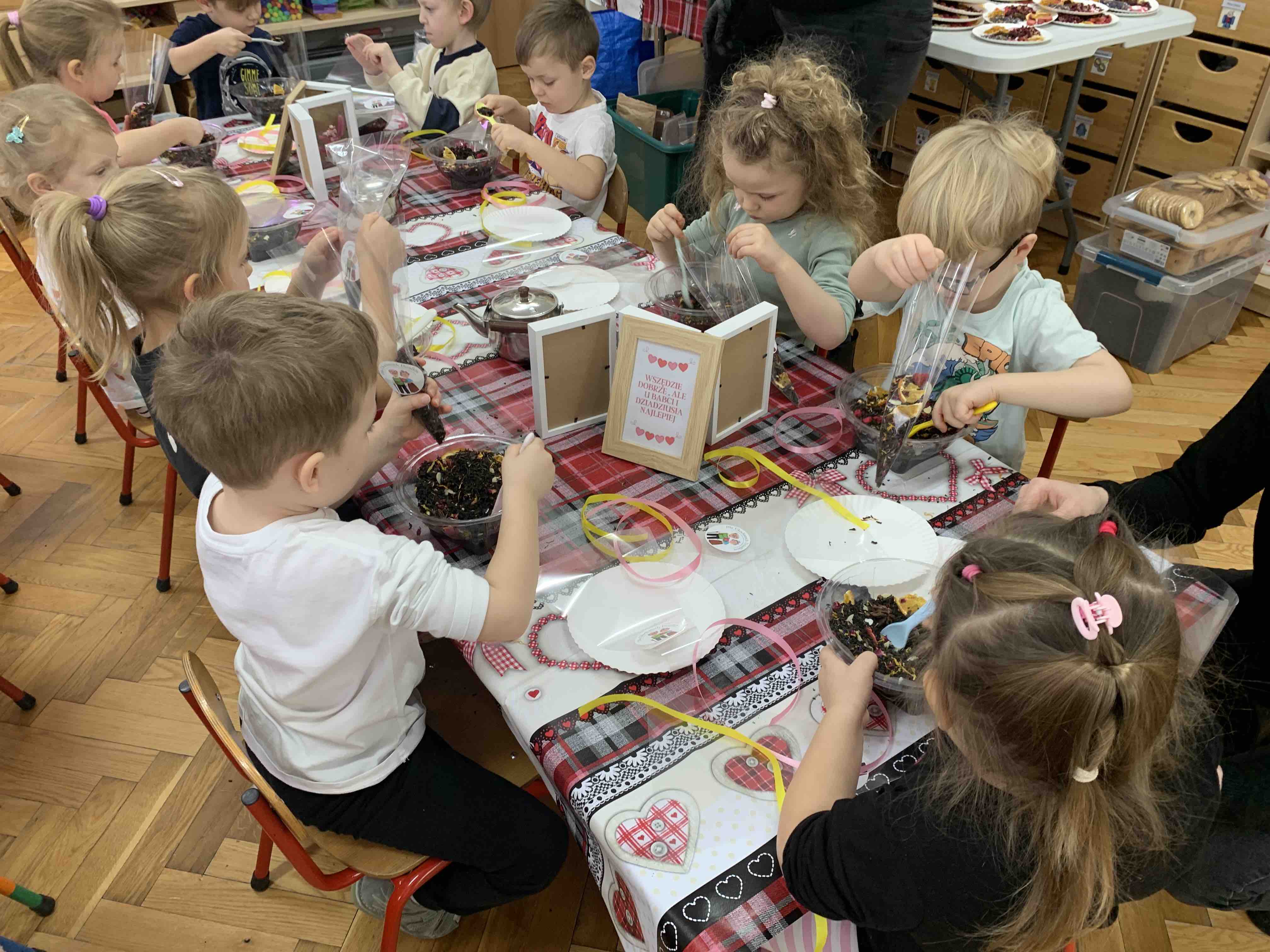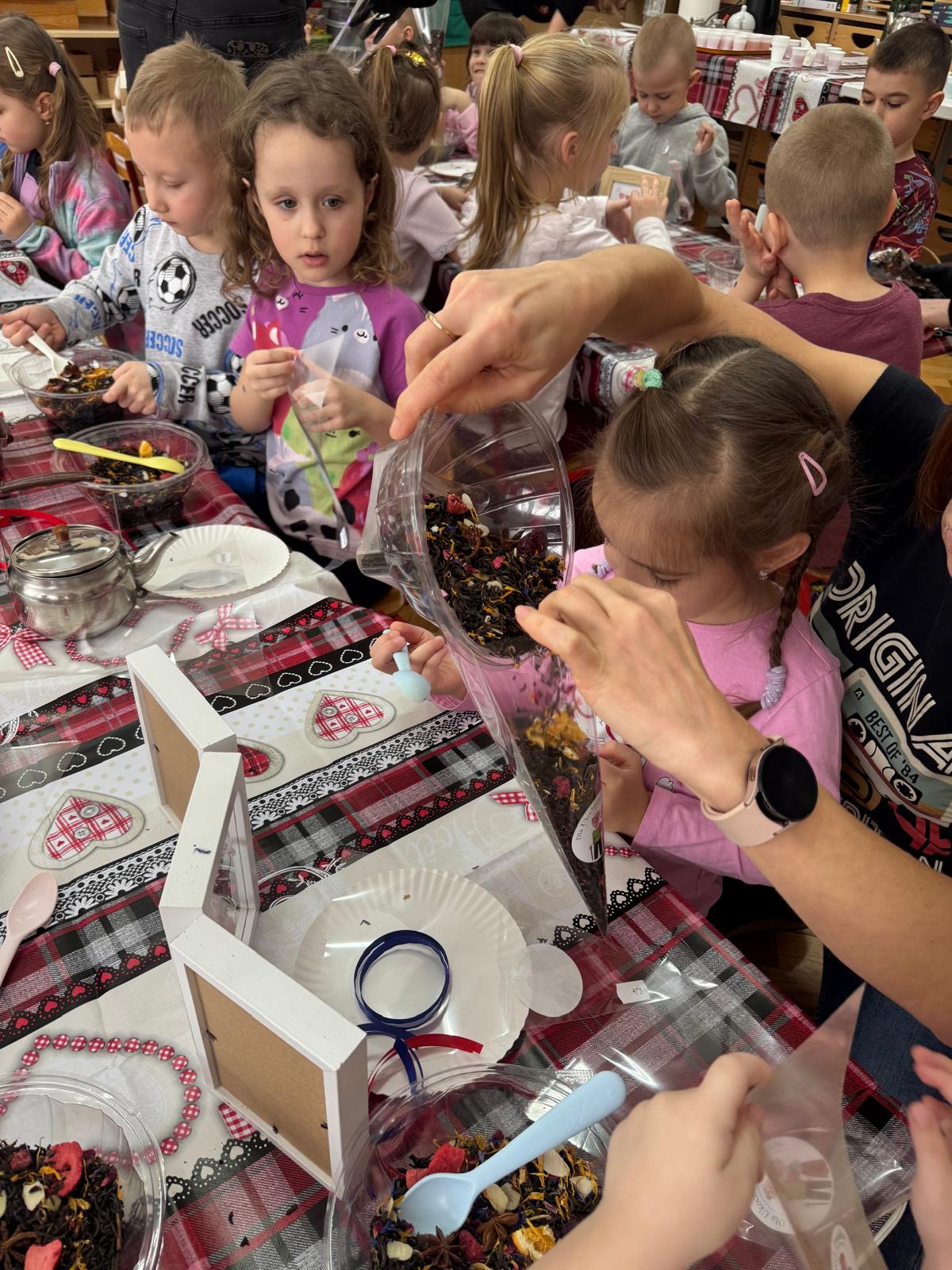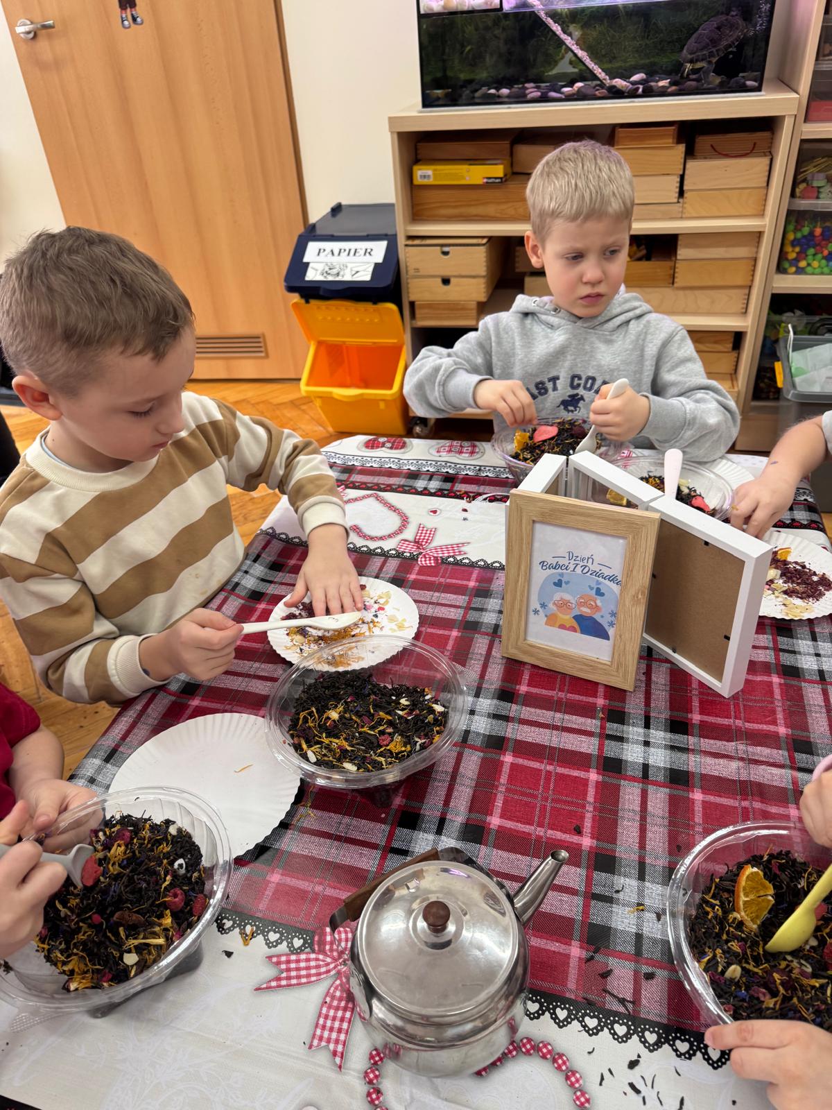 Uczestnicy warsztatów mieli za zadanie stworzyć zdrową i pyszną kompozycję herbacianą, która będzie wspaniałym prezentem dla naszych Babć i Dziadków. Dzieci były zachwycone zapachem naturalnych dodatków do naparu z herbaty ale też możliwością skosztowania zielonej herbaty i ciasteczka.