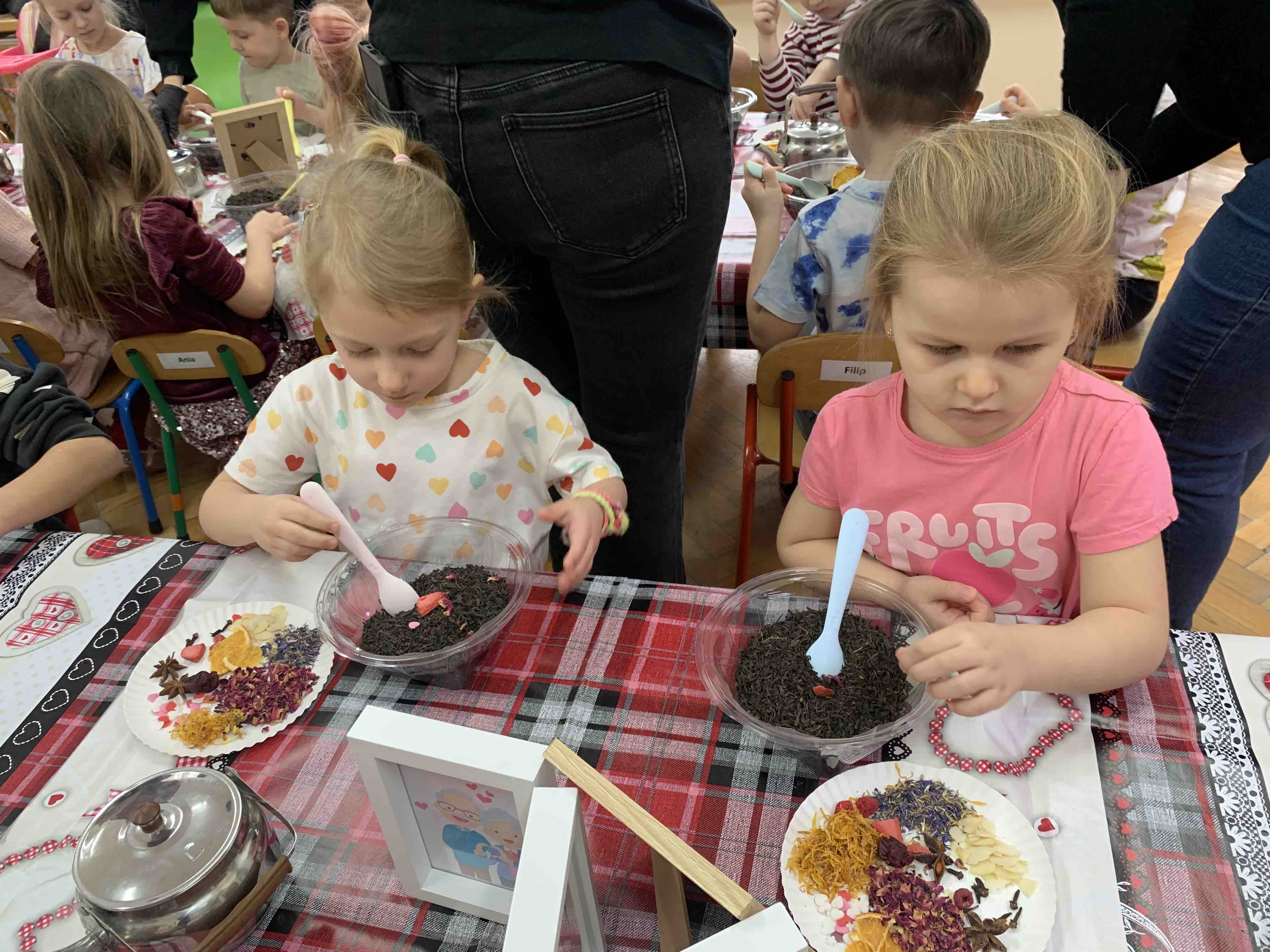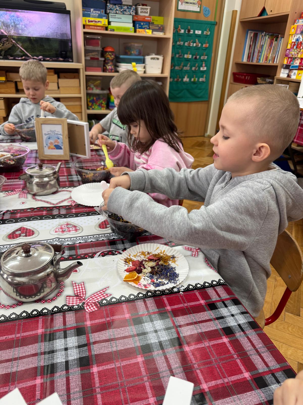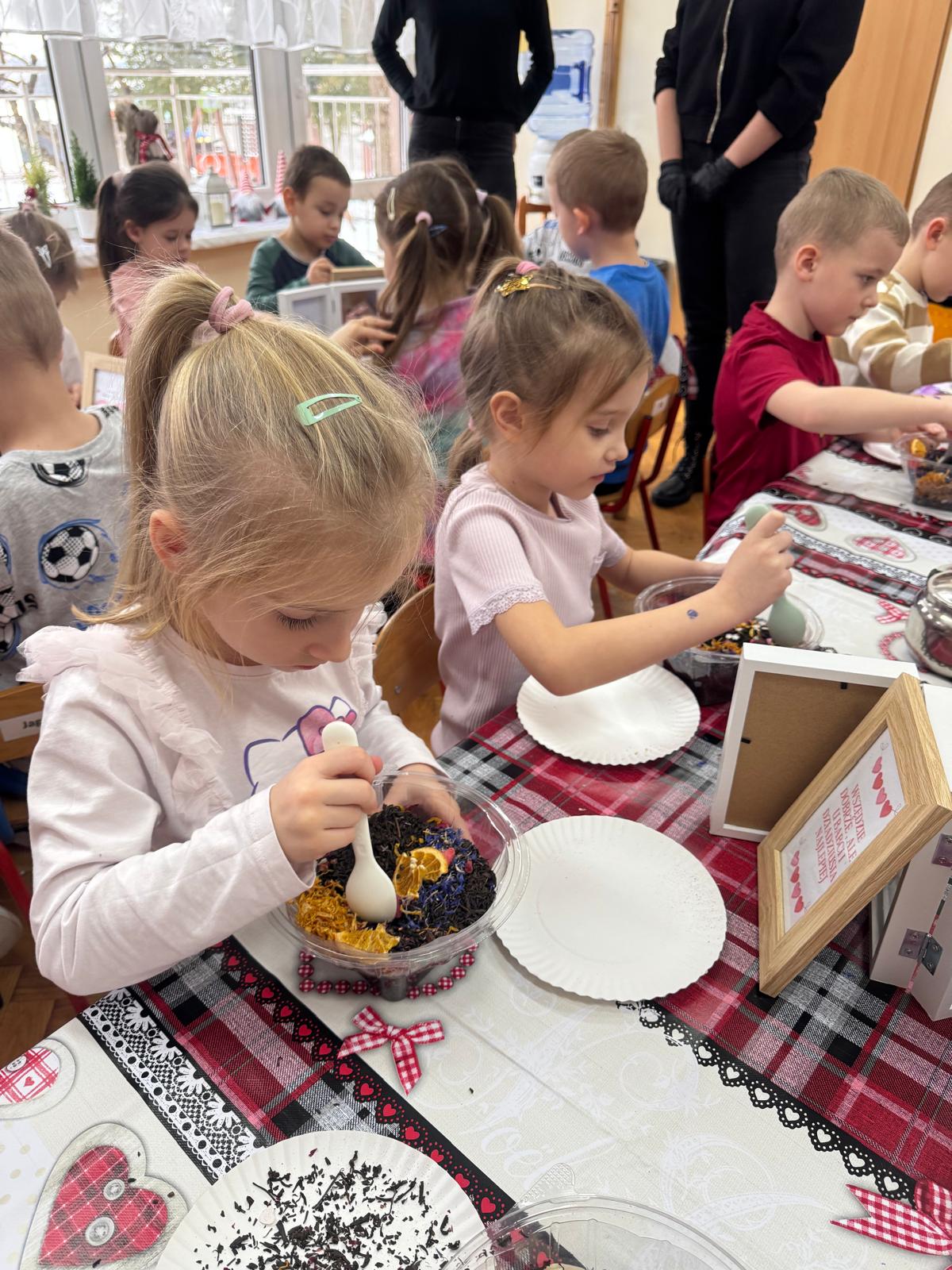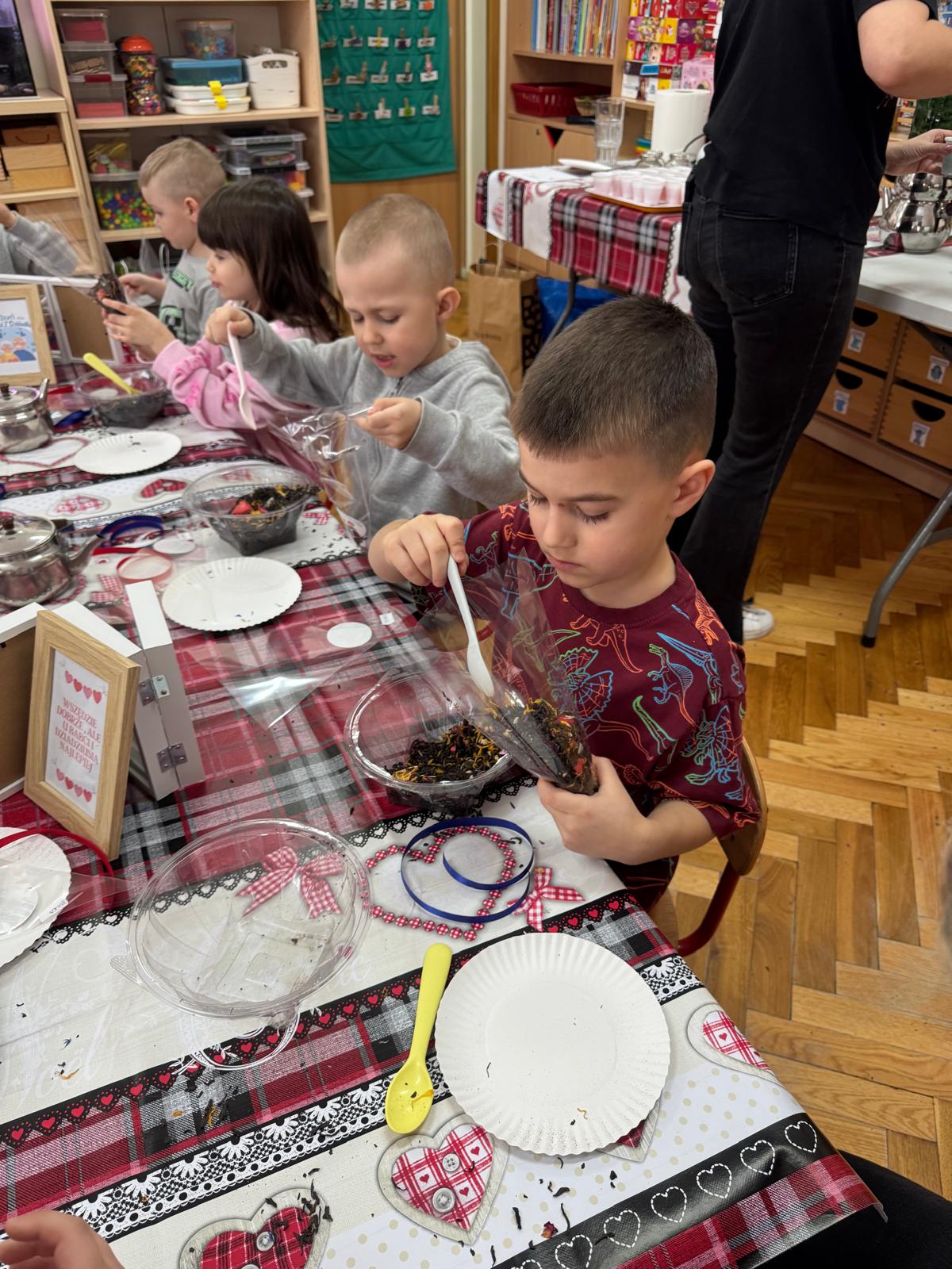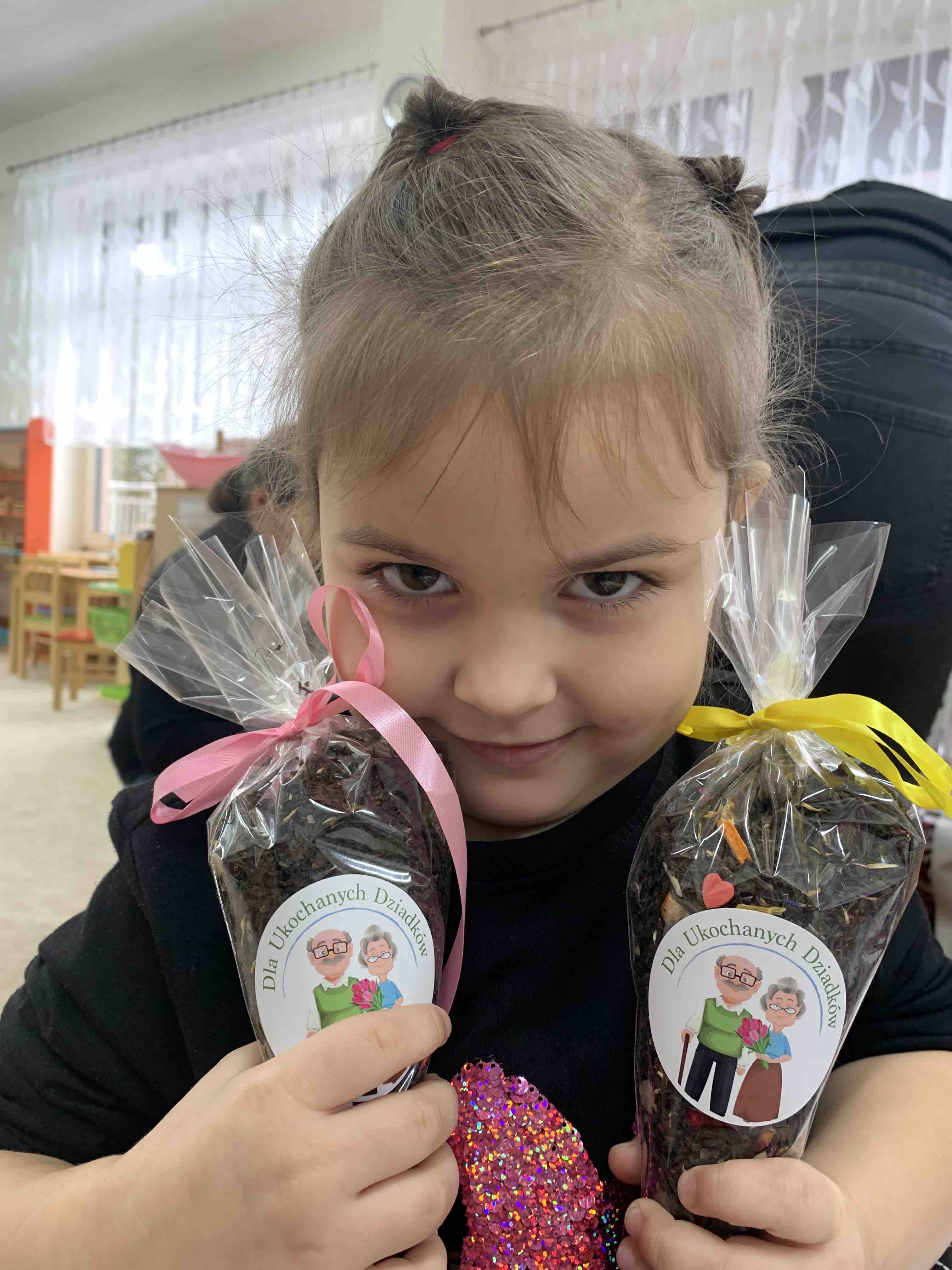 Uczestnicy warsztatów mieli za zadanie stworzyć zdrową i pyszną kompozycję herbacianą, która będzie wspaniałym prezentem dla naszych Babć i Dziadków. Dzieci były zachwycone zapachem naturalnych dodatków do naparu z herbaty ale też możliwością skosztowania zielonej herbaty i ciasteczka.