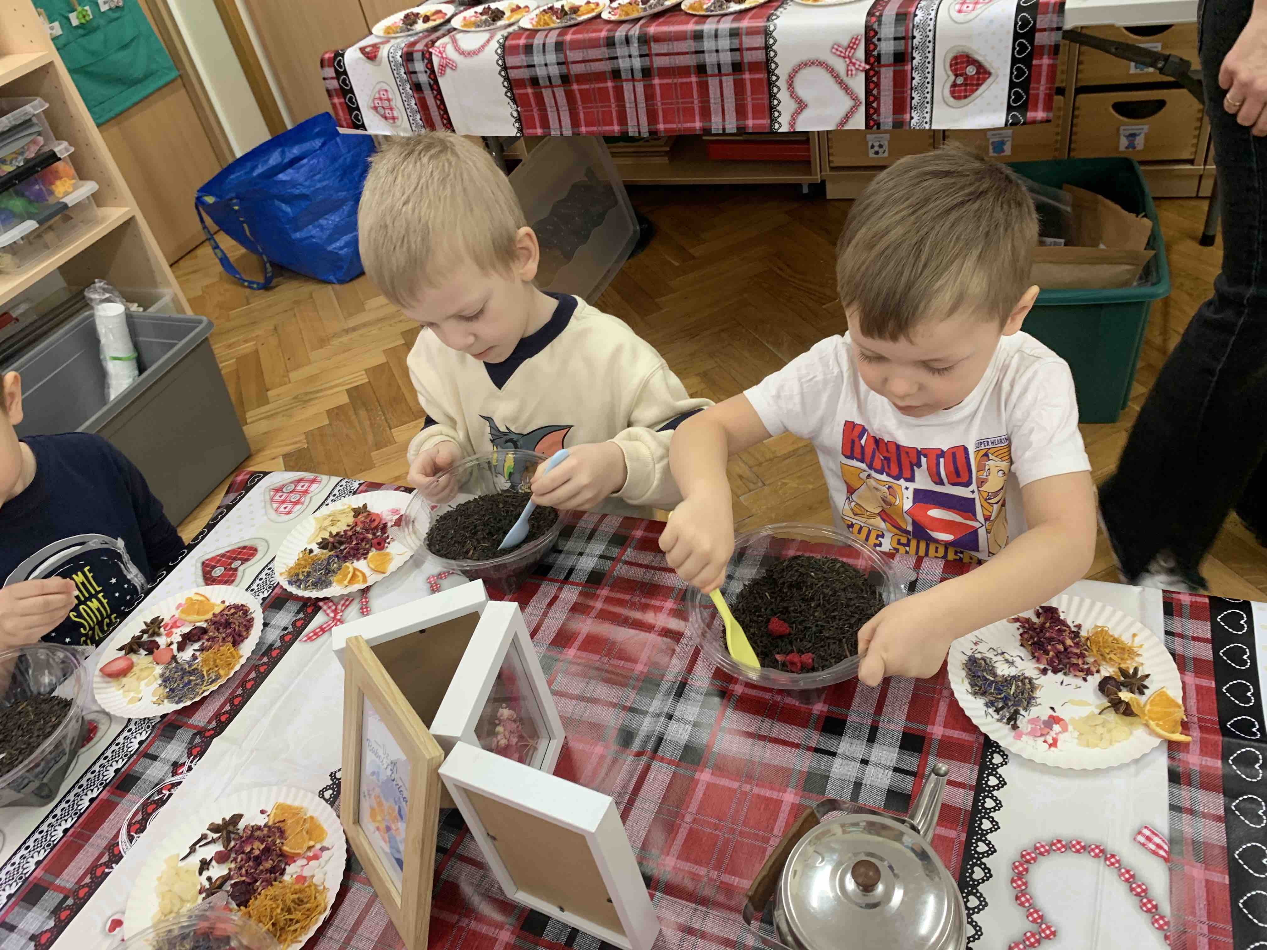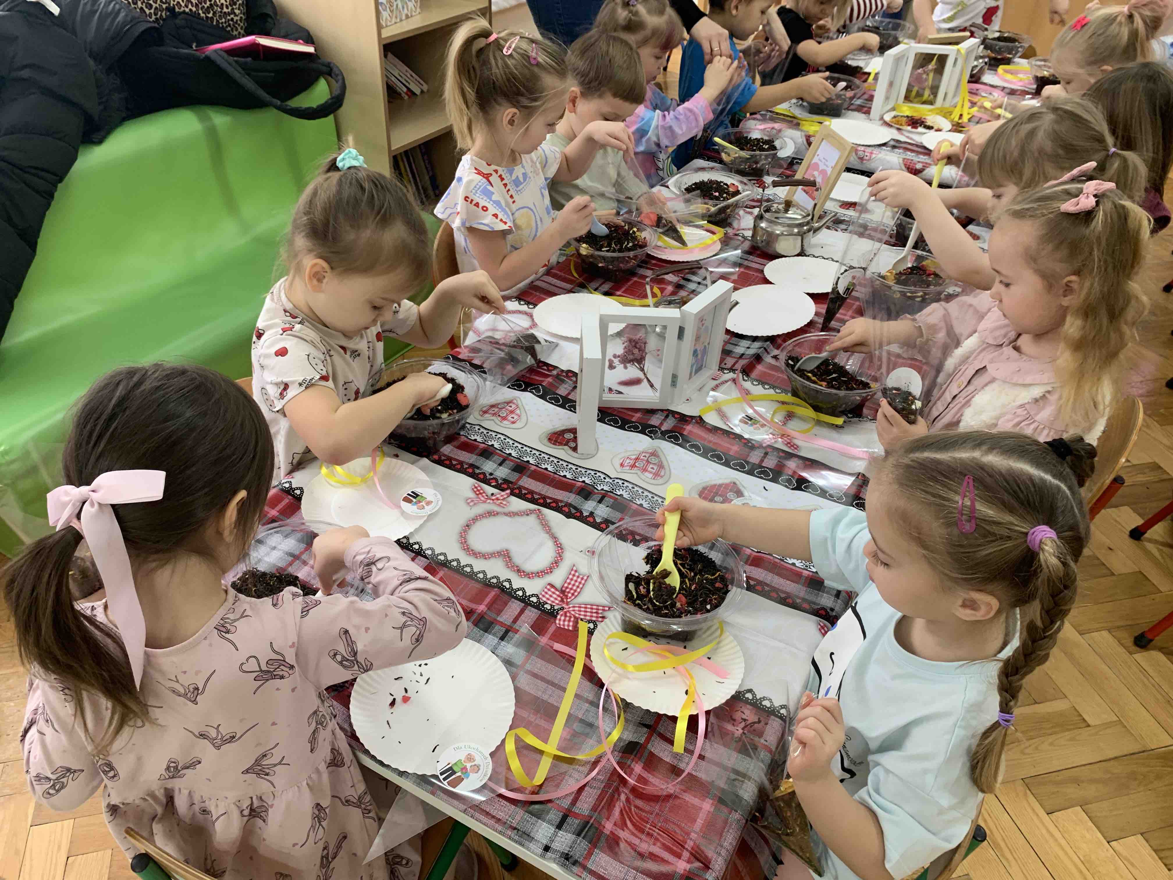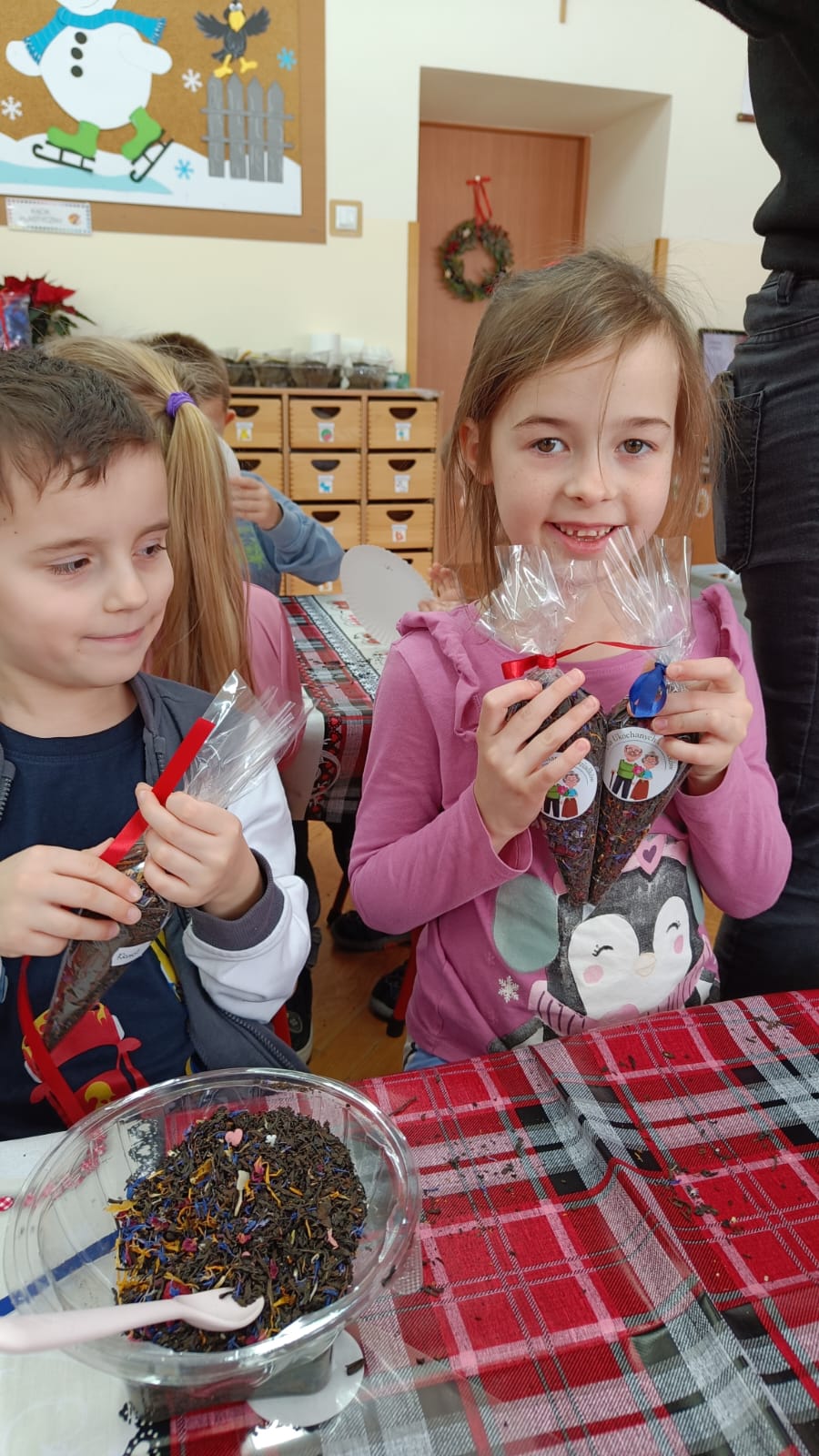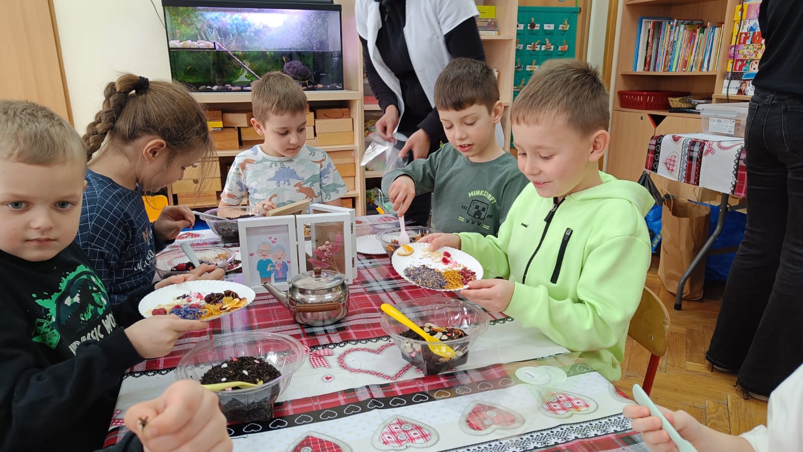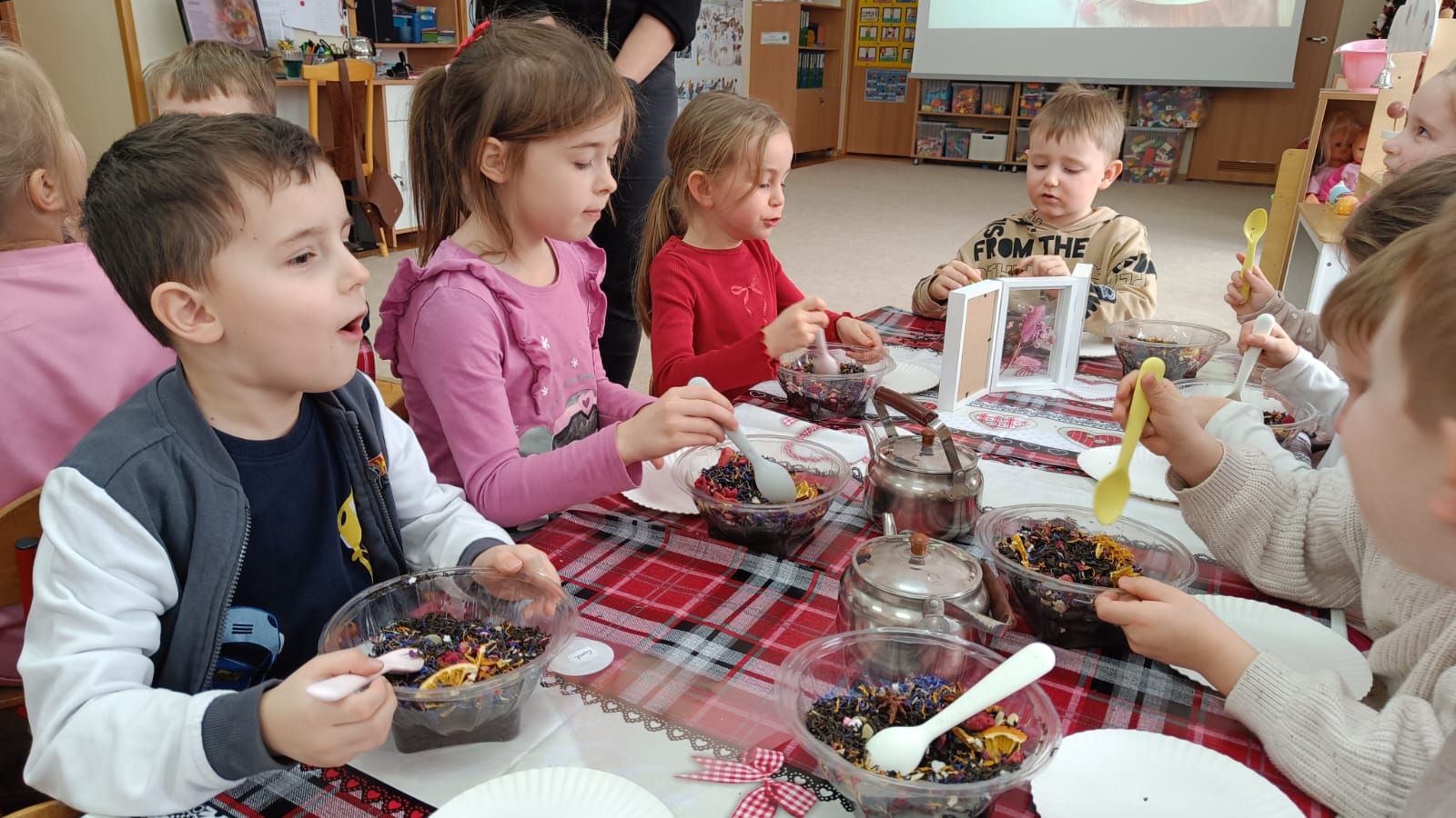 Uczestnicy warsztatów mieli za zadanie stworzyć zdrową i pyszną kompozycję herbacianą, która będzie wspaniałym prezentem dla naszych Babć i Dziadków. Dzieci były zachwycone zapachem naturalnych dodatków do naparu z herbaty ale też możliwością skosztowania zielonej herbaty i ciasteczka.