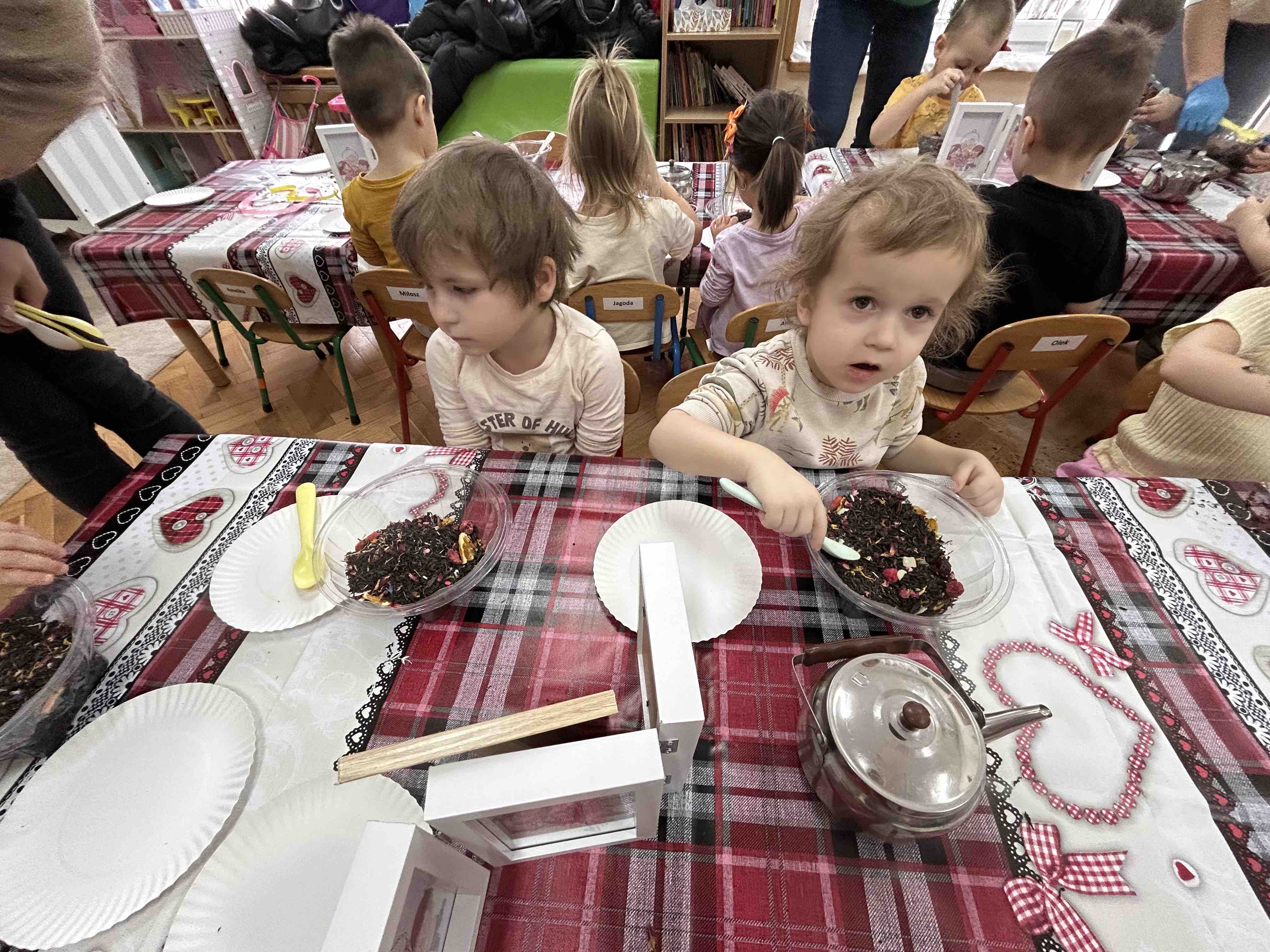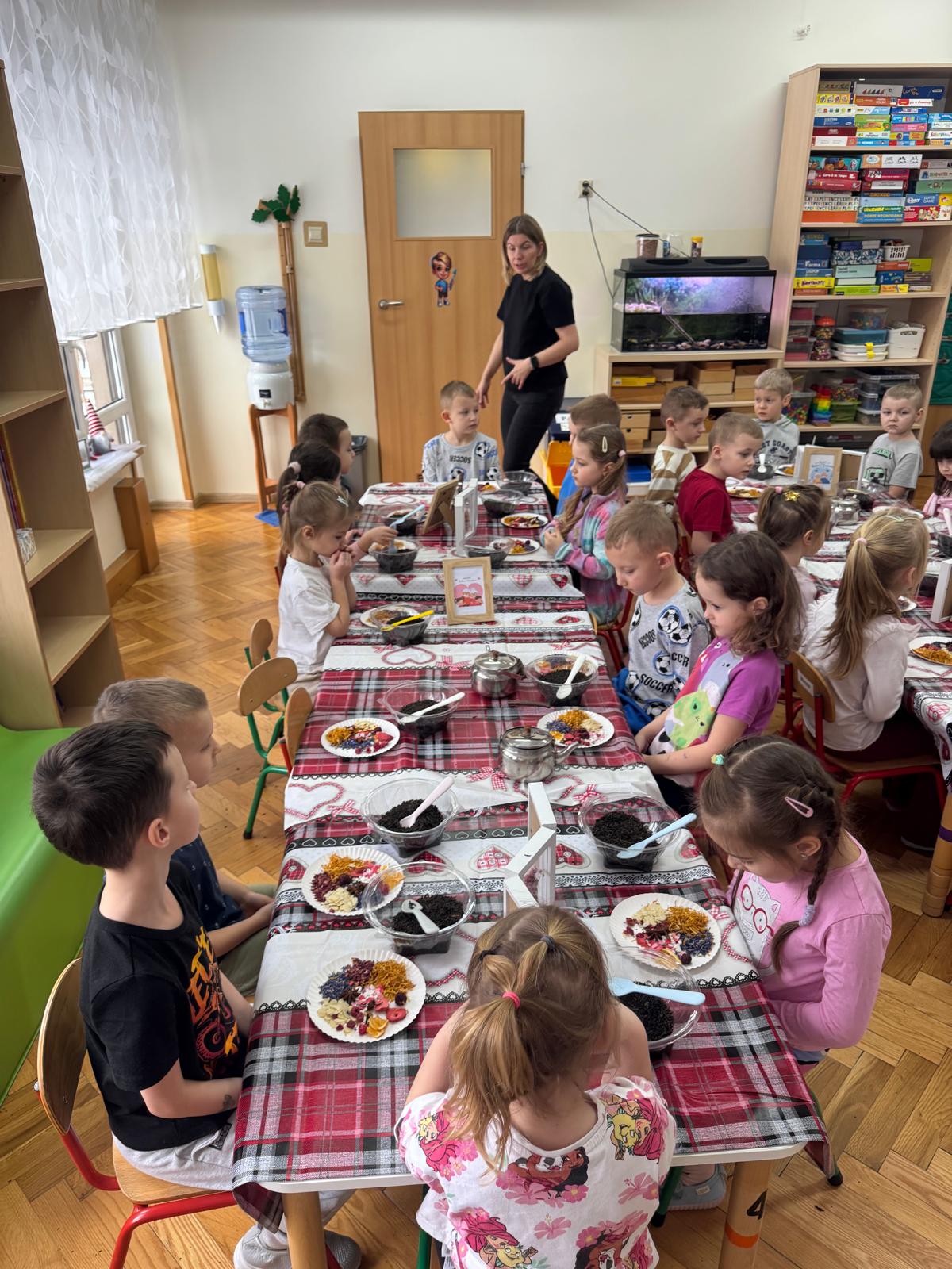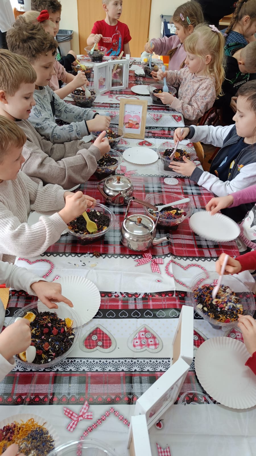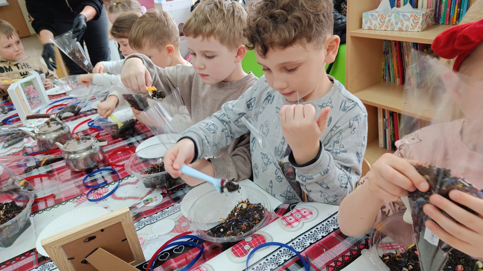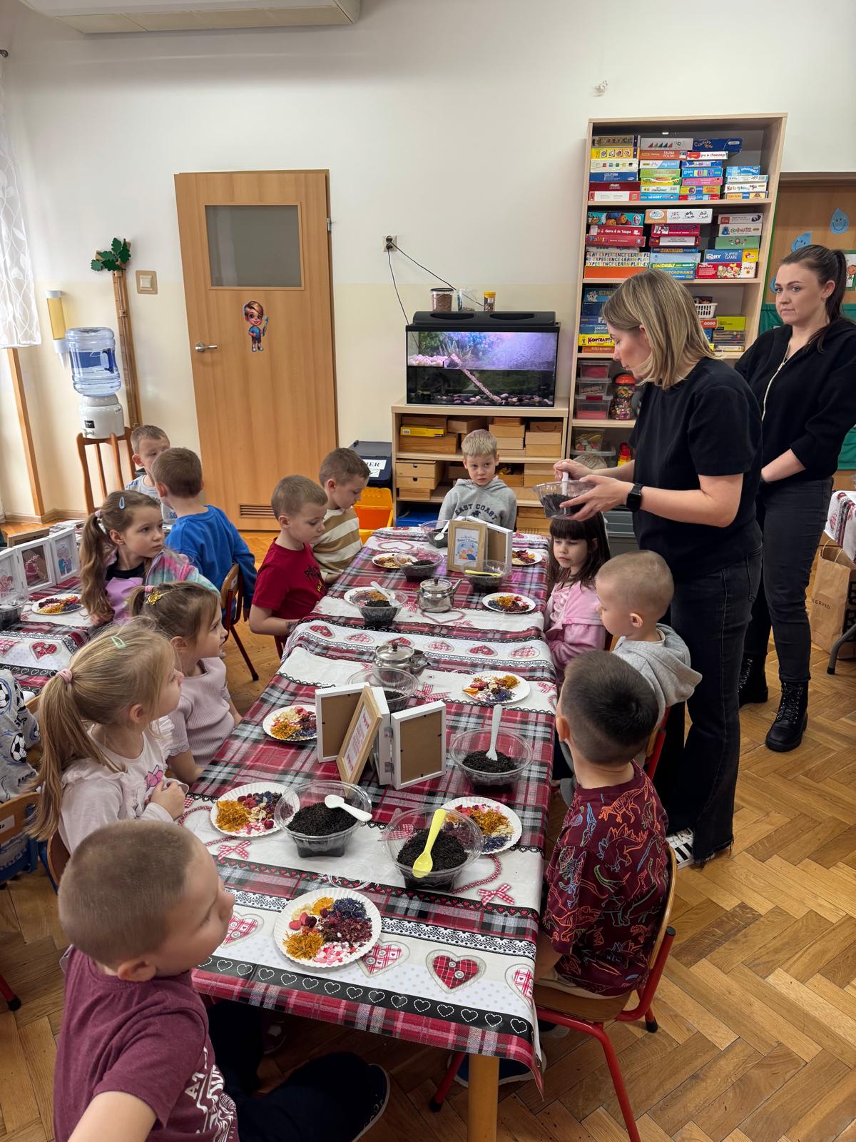 Uczestnicy warsztatów mieli za zadanie stworzyć zdrową i pyszną kompozycję herbacianą, która będzie wspaniałym prezentem dla naszych Babć i Dziadków. Dzieci były zachwycone zapachem naturalnych dodatków do naparu z herbaty ale też możliwością skosztowania zielonej herbaty i ciasteczka.