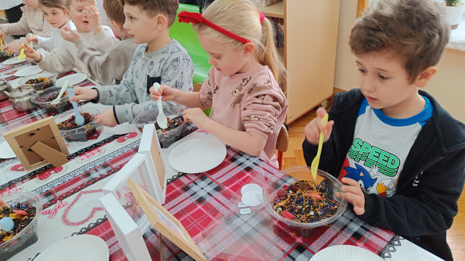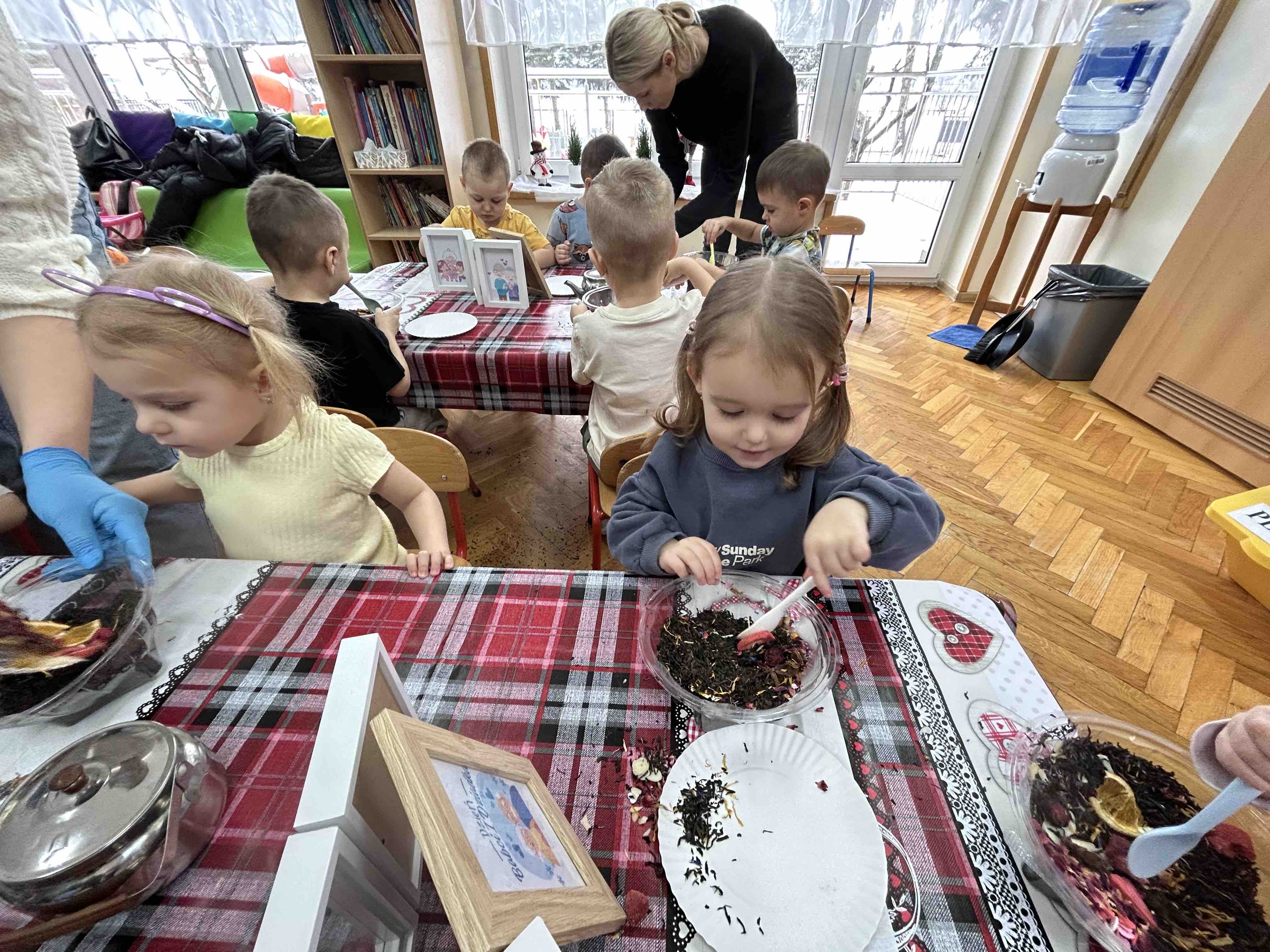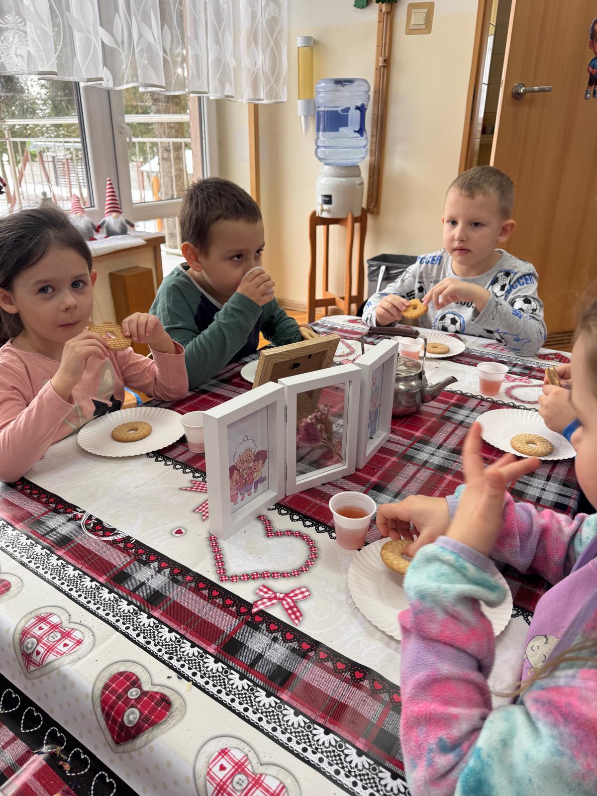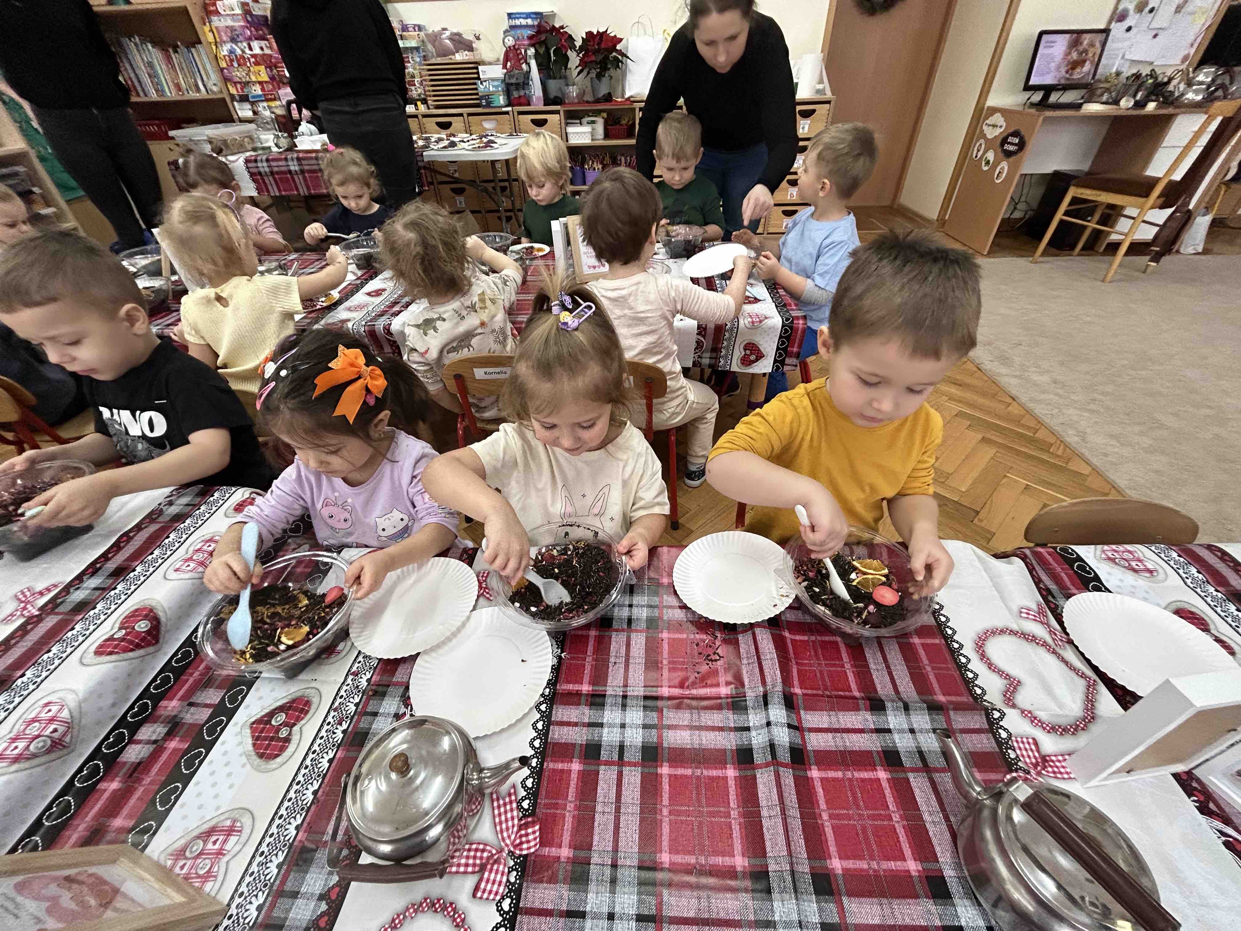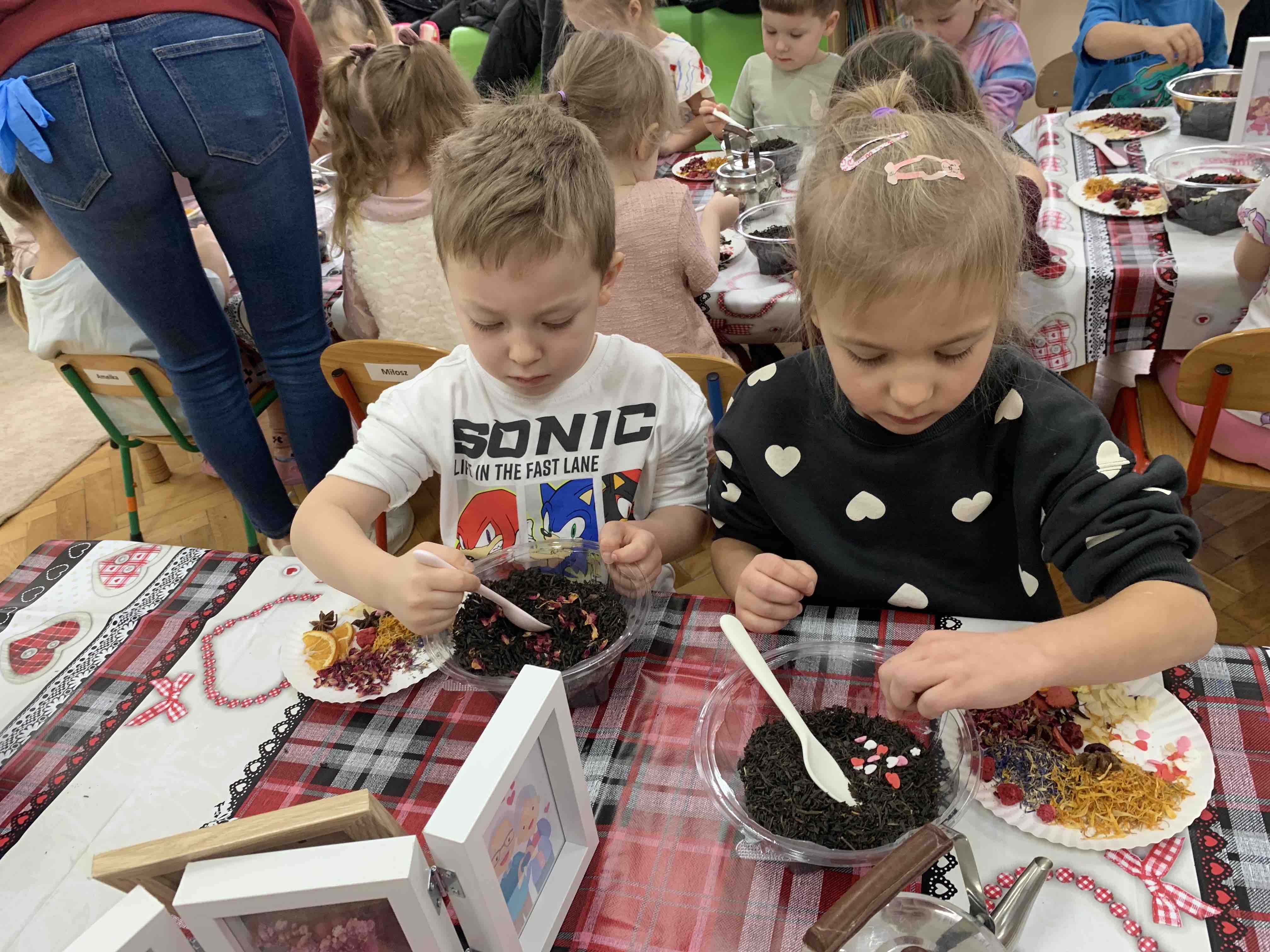 Uczestnicy warsztatów mieli za zadanie stworzyć zdrową i pyszną kompozycję herbacianą, która będzie wspaniałym prezentem dla naszych Babć i Dziadków. Dzieci były zachwycone zapachem naturalnych dodatków do naparu z herbaty ale też możliwością skosztowania zielonej herbaty i ciasteczka.