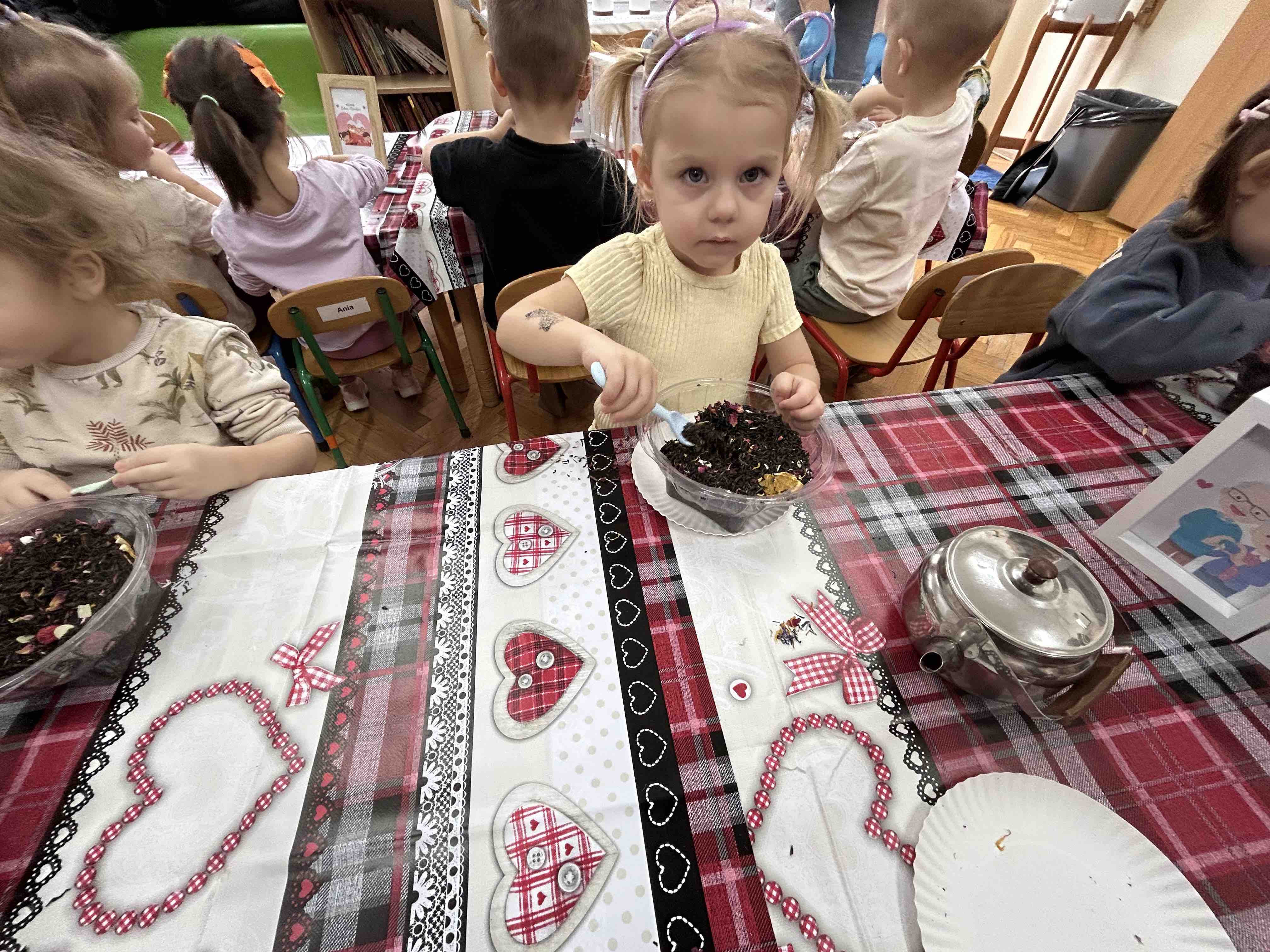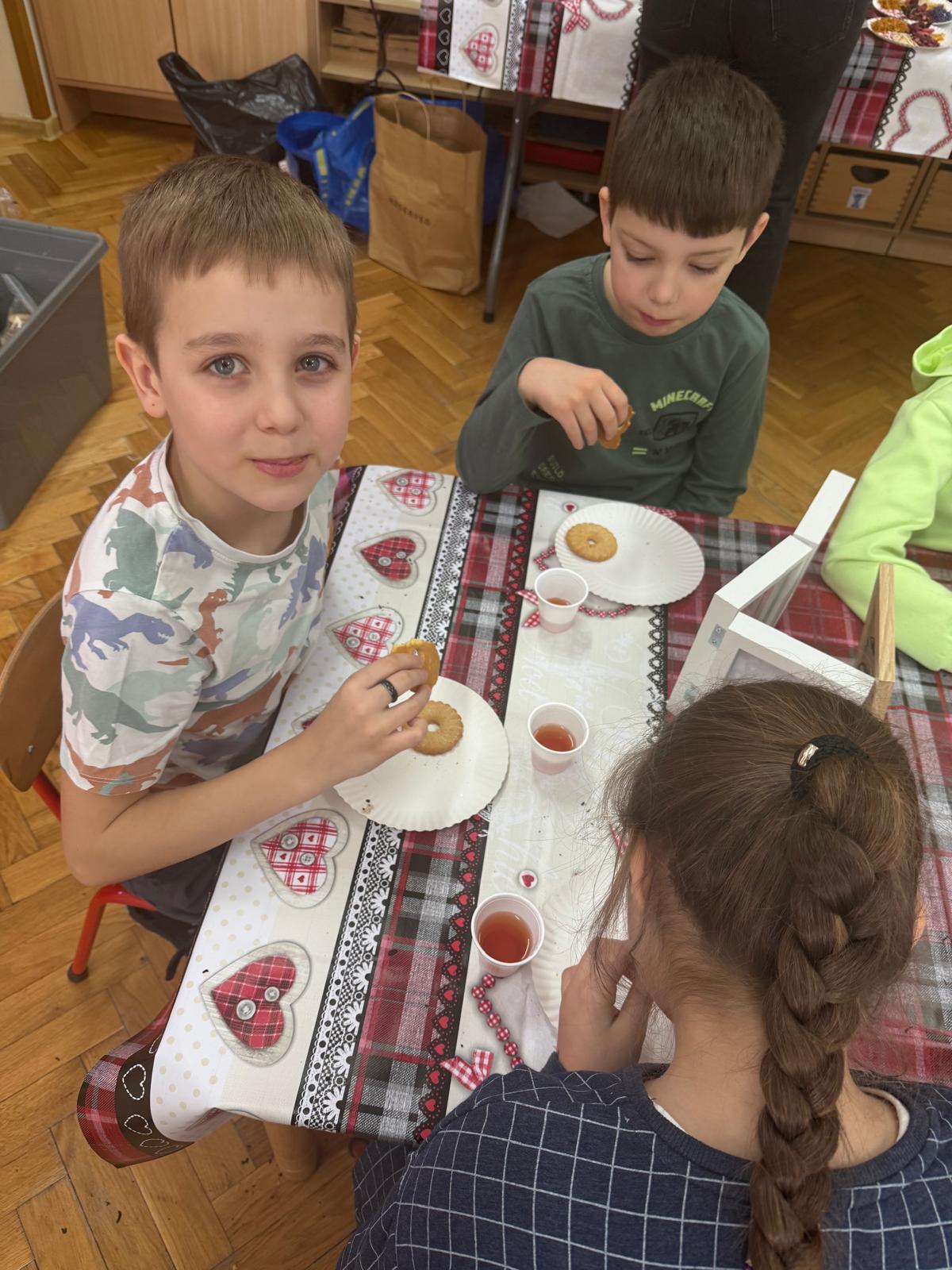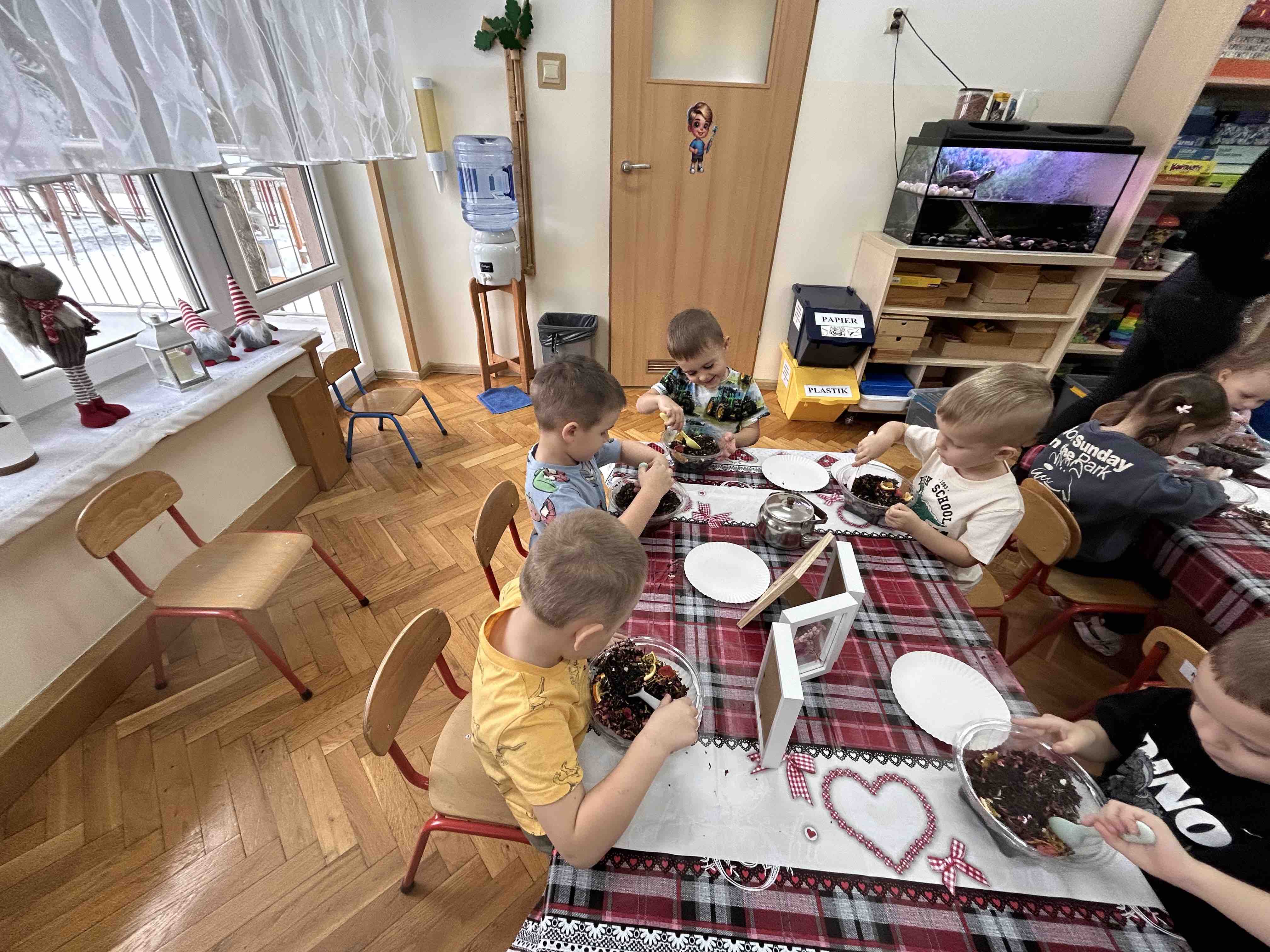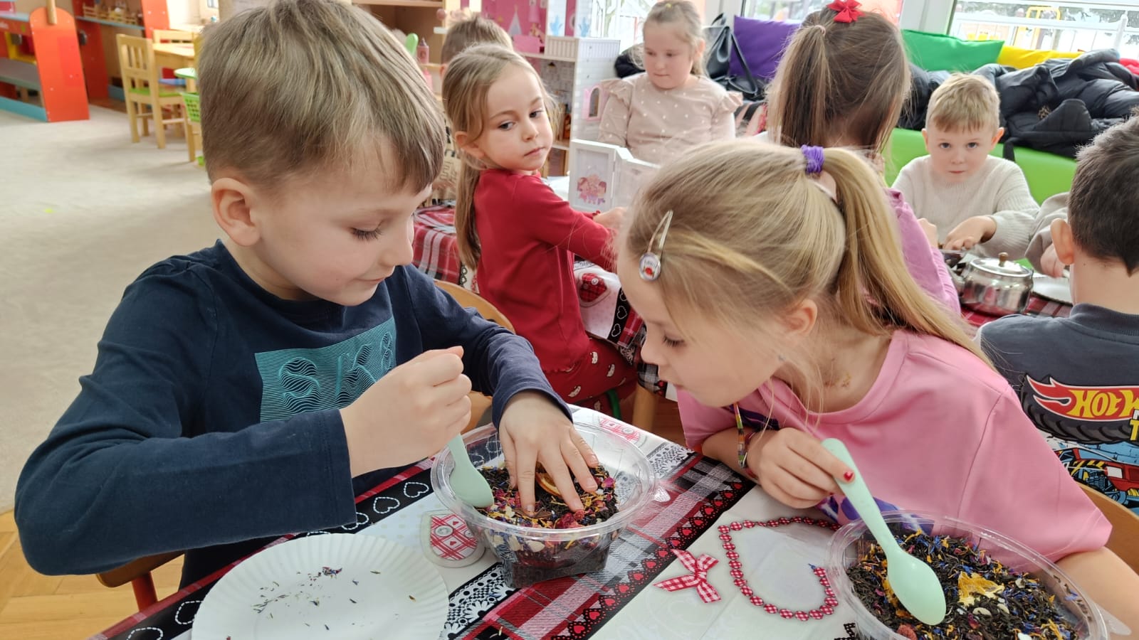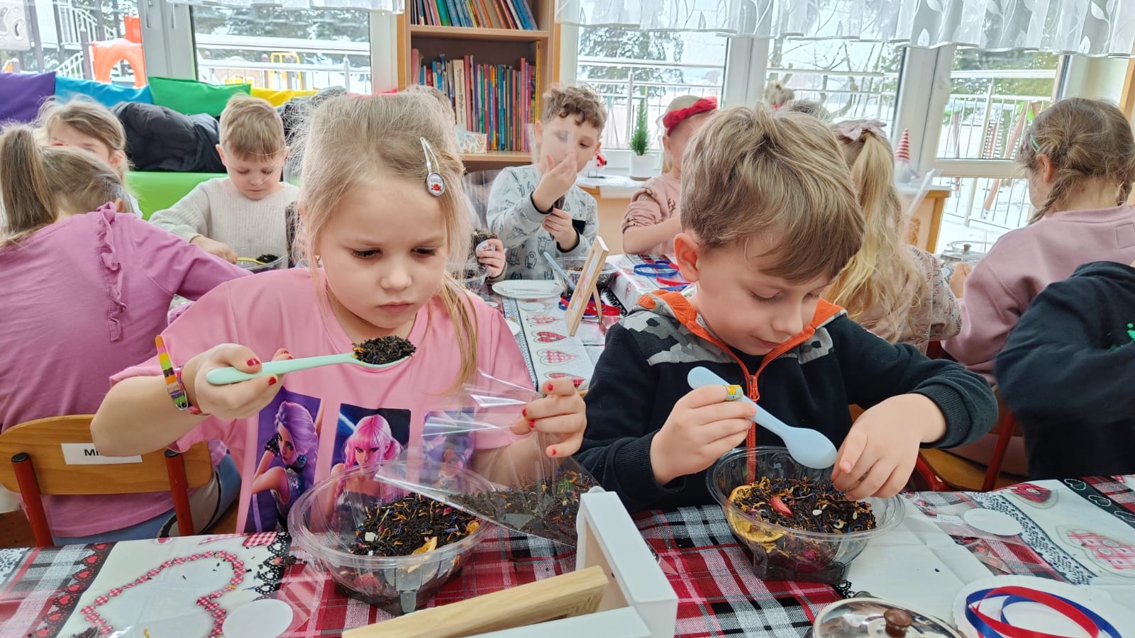 Uczestnicy warsztatów mieli za zadanie stworzyć zdrową i pyszną kompozycję herbacianą, która będzie wspaniałym prezentem dla naszych Babć i Dziadków. Dzieci były zachwycone zapachem naturalnych dodatków do naparu z herbaty ale też możliwością skosztowania zielonej herbaty i ciasteczka.