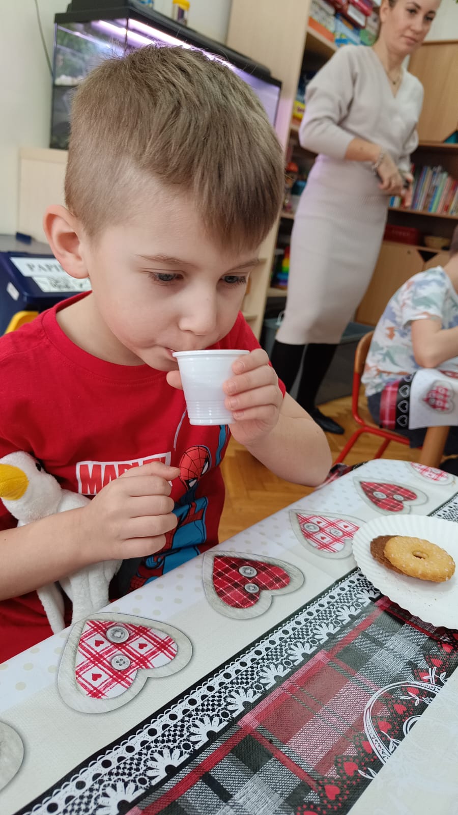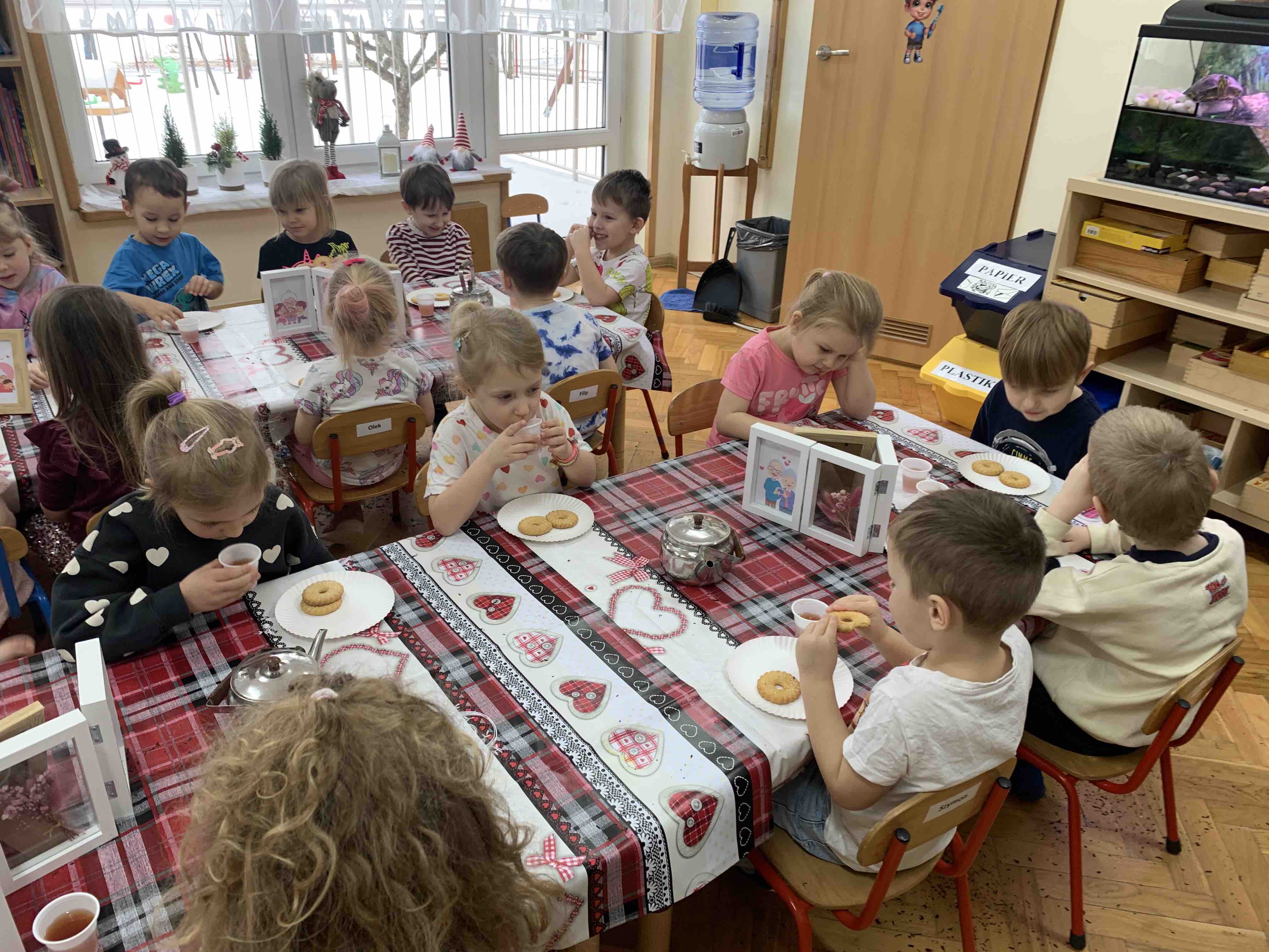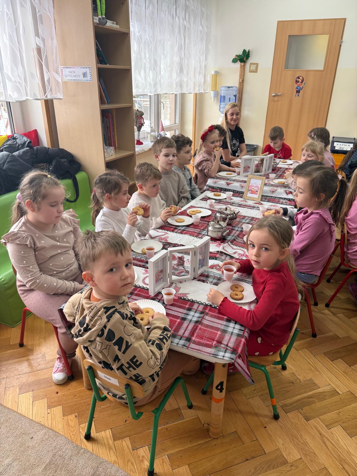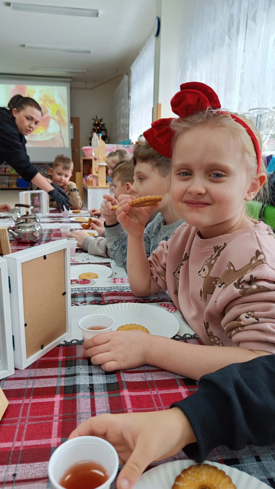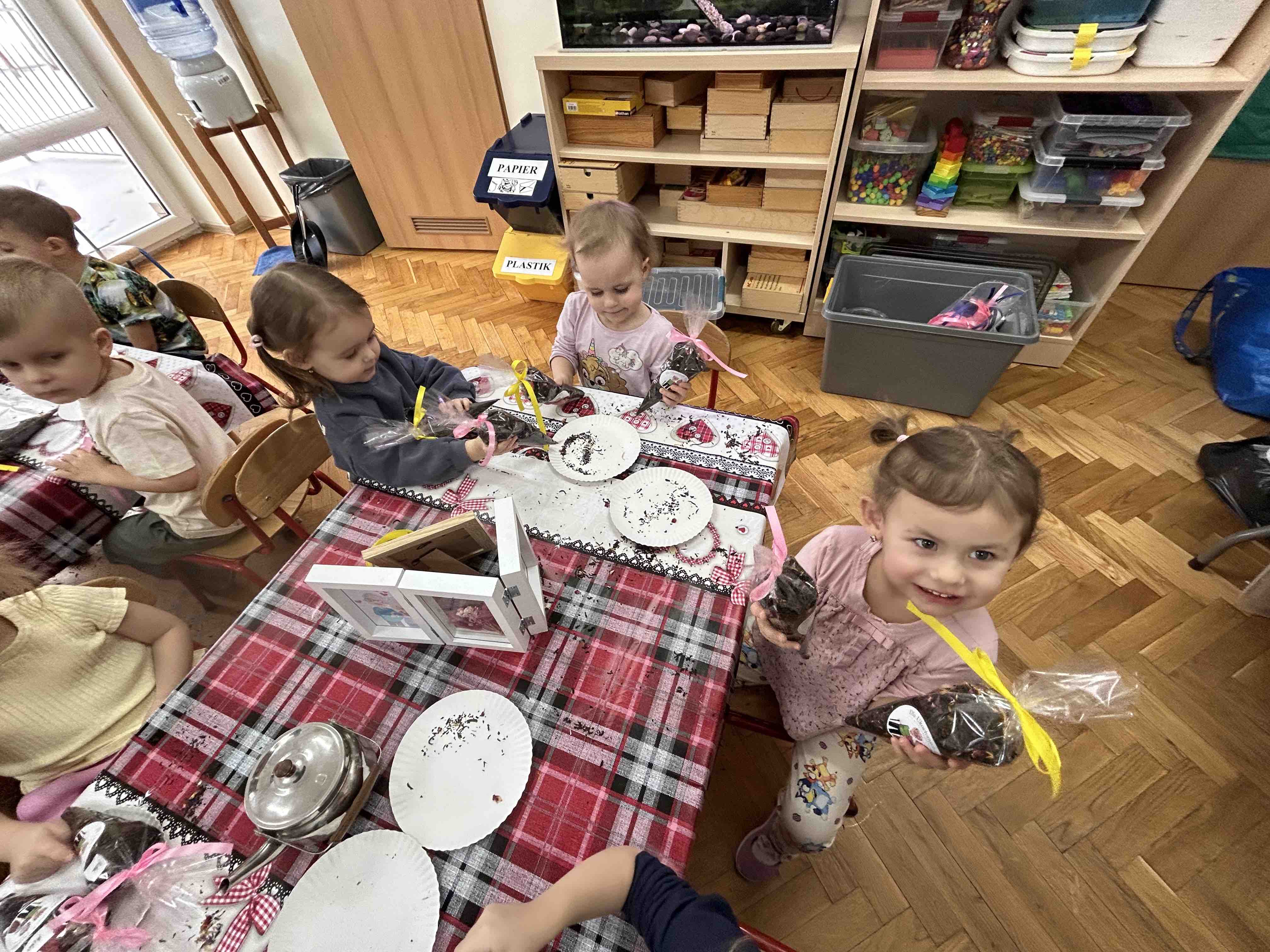Uczestnicy warsztatów mieli za zadanie stworzyć zdrową i pyszną kompozycję herbacianą, która będzie wspaniałym prezentem dla naszych Babć i Dziadków. Dzieci były zachwycone zapachem naturalnych dodatków do naparu z herbaty ale też możliwością skosztowania zielonej herbaty i ciasteczka.