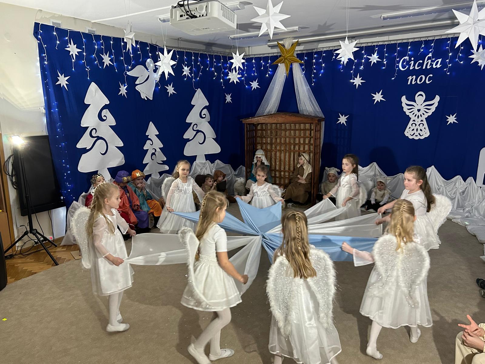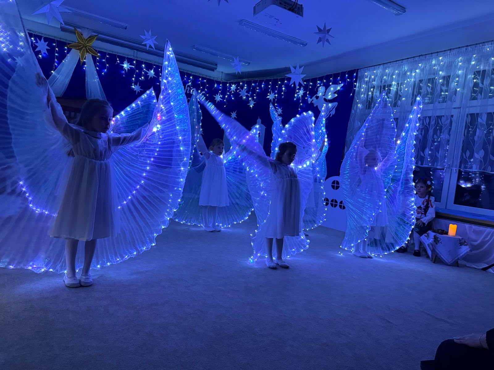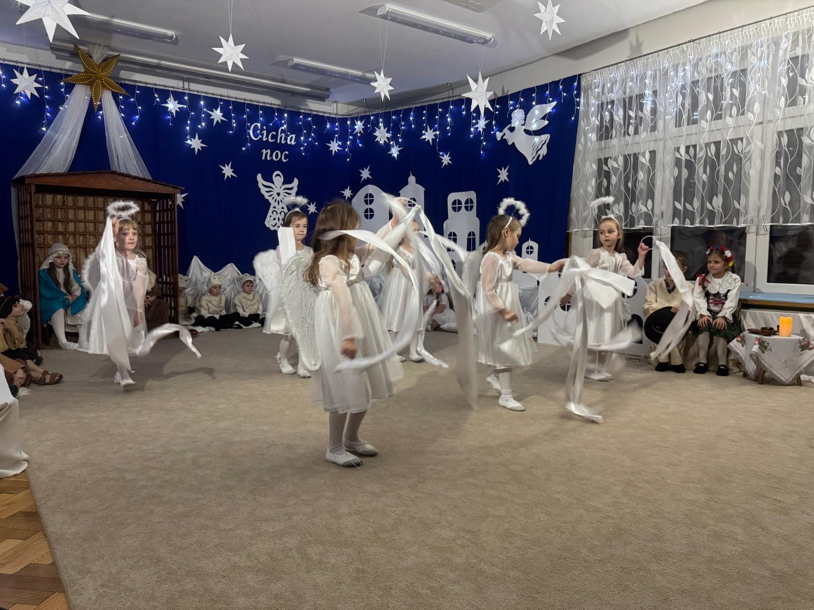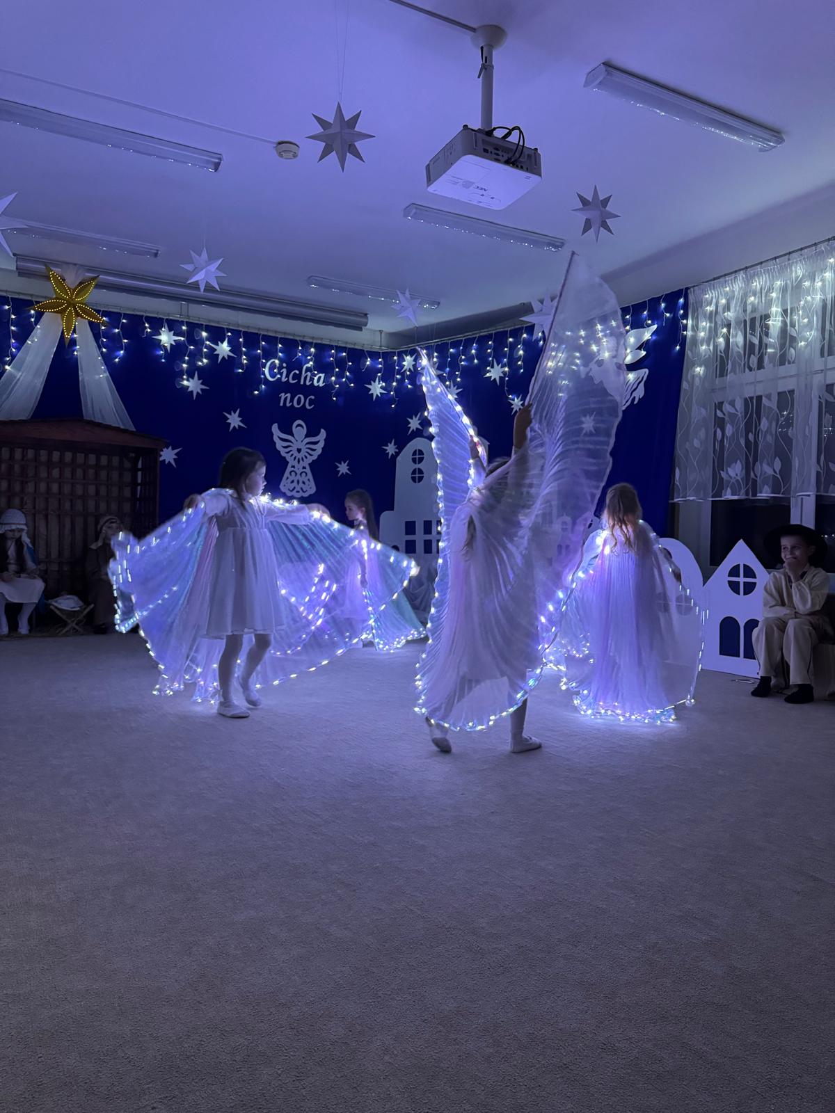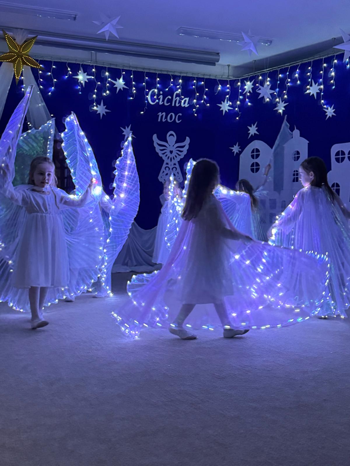 Niezwykłe stroje, bajkowa sceneria oraz starannie przygotowane dekoracje stworzyły nastrój podniosłości i wyjątkowości tego wydarzenia. Roztańczone anioły i pastuszkowie, śpiew kolęd i pastorałek oraz dopracowane układy taneczne zachwycały efektami świetlnymi, kolorowymi materiałami i lametami. Dzieci z wielkim przejęciem i radością odgrywały swoje role, tworząc widowisko pełne emocji, ciepła i wzruszeń.