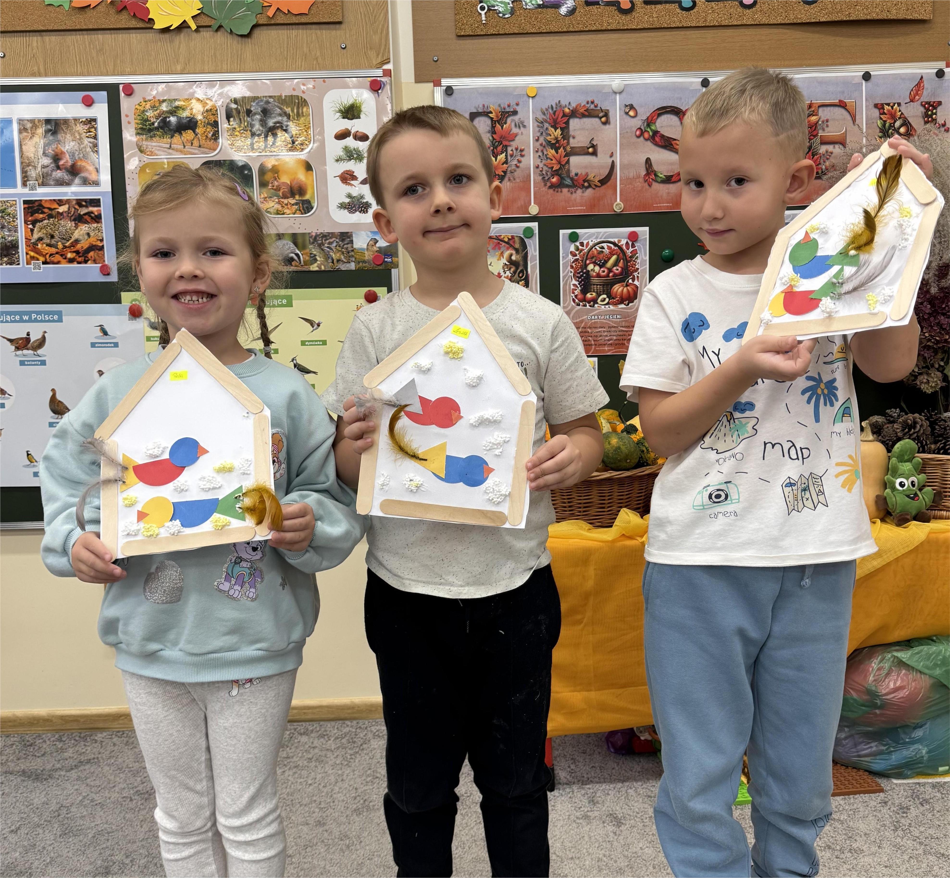 Efektem zajęć są przepiękne, barwne prace, które ozdobiły naszą salę i wprowadziły prawdziwie jesienny nastrój. Dzieci były bardzo dumne ze swoich karmników i z radością opowiadały, jak będą pomagać ptakom w czasie chłodnych dni.