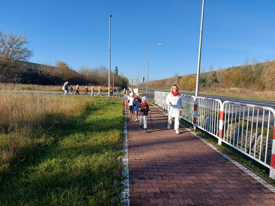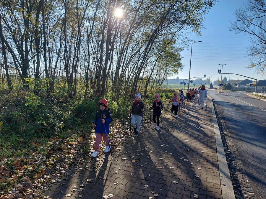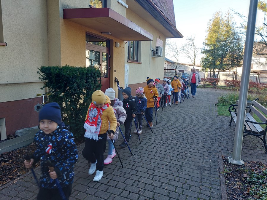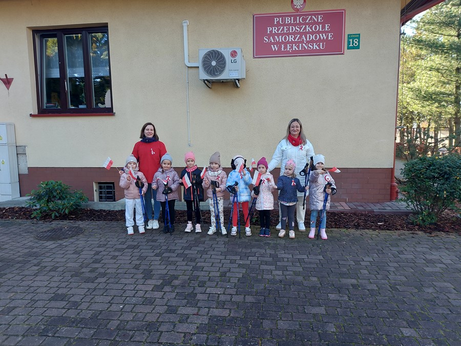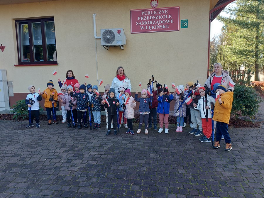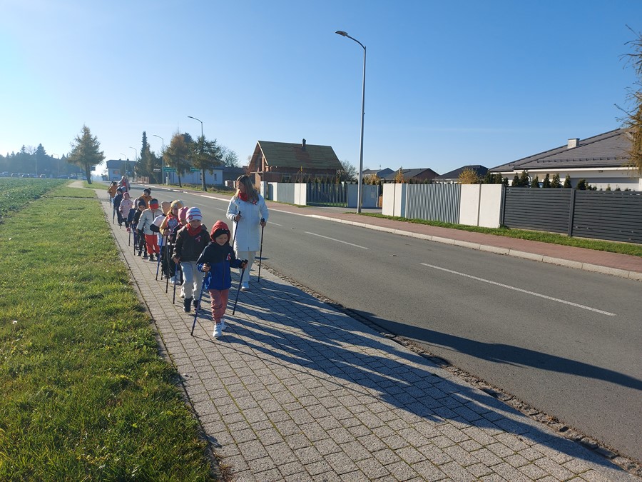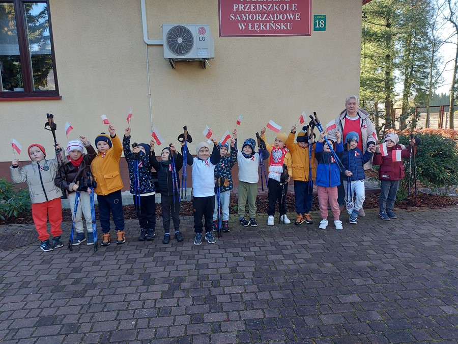 Z okazji zbliżającego się Święta Niepodległości przedszkolaki wyruszyły na marsz z kijkami, łącząc ruch na świeżym powietrzu z nauką o patriotyzmie. Ubrane w elementy garderoby w barwach narodowych oraz z przypiętymi na piersi kotylionami, dzieci dumnie i radością maszerowały ulicami Łękińska. Pogoda dopisała, a na twarzach przedszkolaków przez cały czas gościł uśmiech i entuzjazm. Mali uczestnicy byli dumni z dystansu, jaki udało im się pokonać, a każdy krok w biało-czerwonym marszu był wyrazem radości, wspólnoty i dziecięcej energii.