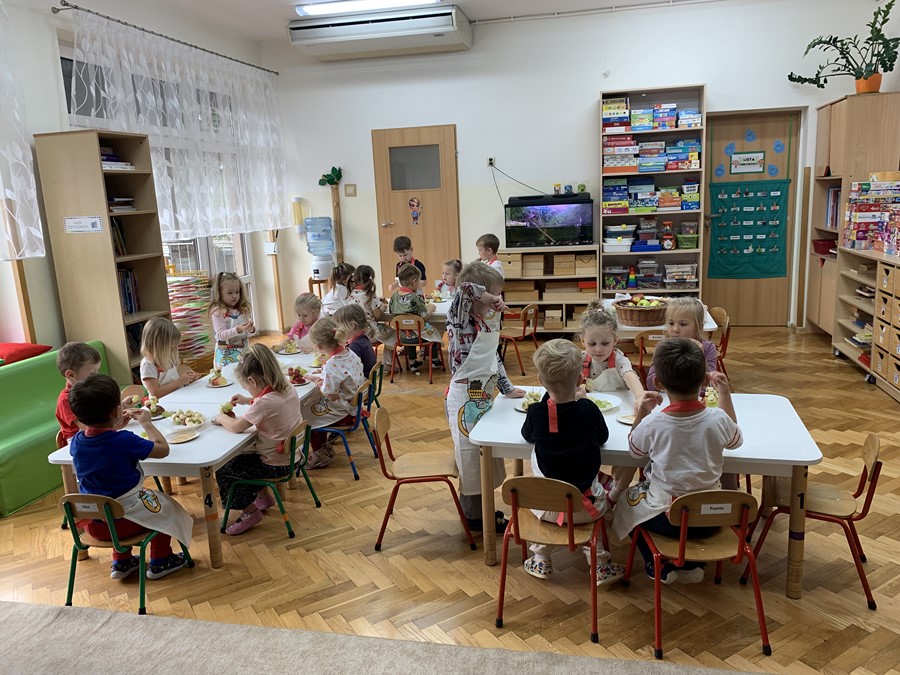 Dzieci z grupy Kropelki uczestniczyły w kolejnych zajęciach ,,Zdrowa kuchnia w grupie Kropelek”, tym razem głównym tematem był Jeż. Podczas rozmów o jesiennych darach i zwierzętach przygotowujących się do zimy, postanowiliśmy stworzyć jesiennego zwierza z owoców.