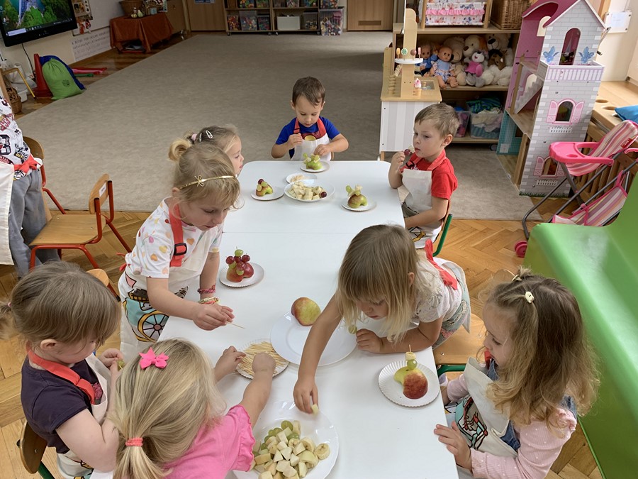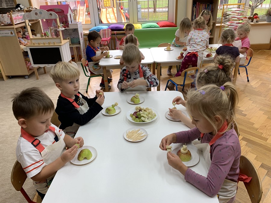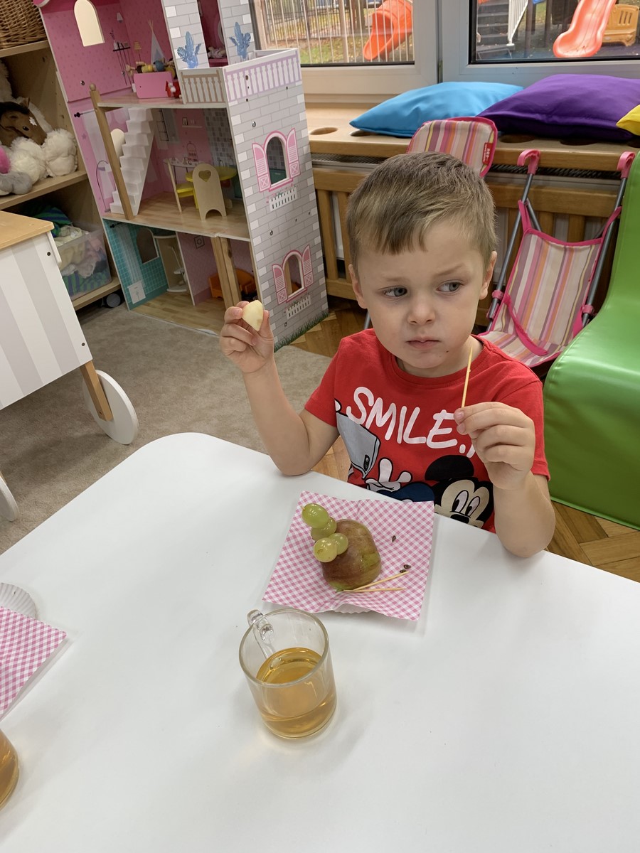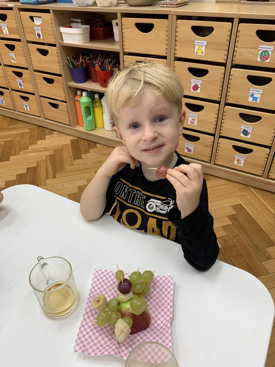 Dzieci słusznie zauważyły, że przed każdą kuchenną zabawą trzeba dokładnie umyć ręce i owoce, z których będziemy korzystali. Po przygotowaniu stanowisk pracy, każdy zatopił się w swojej fantazji tworząc kompozycje z jabłek, bananów i winogron. I tak powstały nasze owocowe Jeżyki, które w części zostały zjedzone. W końcu wspólna degustacja to bardzo przyjemna sprawa.
