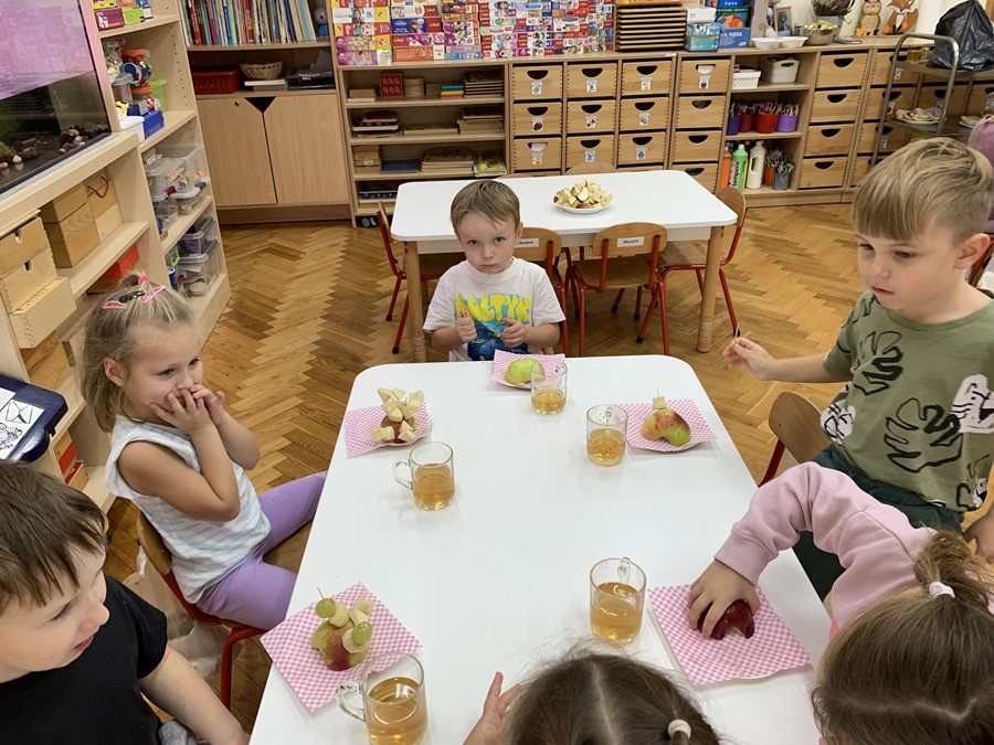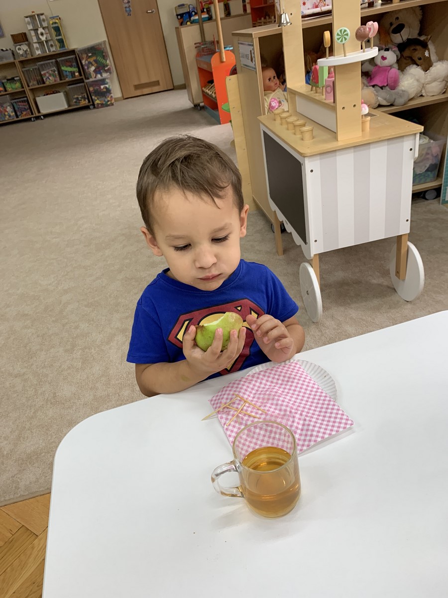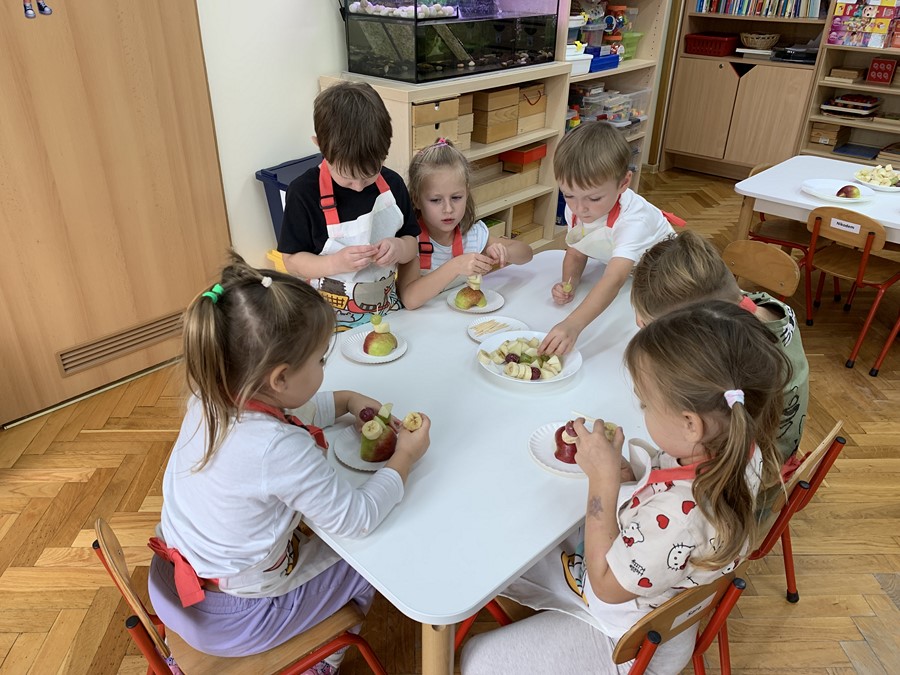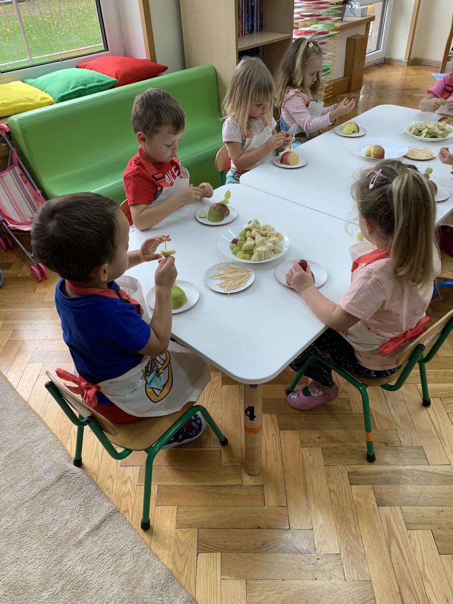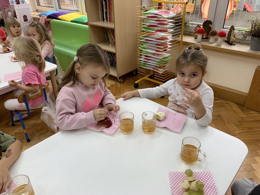 Dzieci słusznie zauważyły, że przed każdą kuchenną zabawą trzeba dokładnie umyć ręce i owoce, z których będziemy korzystali. Po przygotowaniu stanowisk pracy, każdy zatopił się w swojej fantazji tworząc kompozycje z jabłek, bananów i winogron. I tak powstały nasze owocowe Jeżyki, które w części zostały zjedzone. W końcu wspólna degustacja to bardzo przyjemna sprawa.