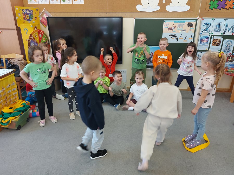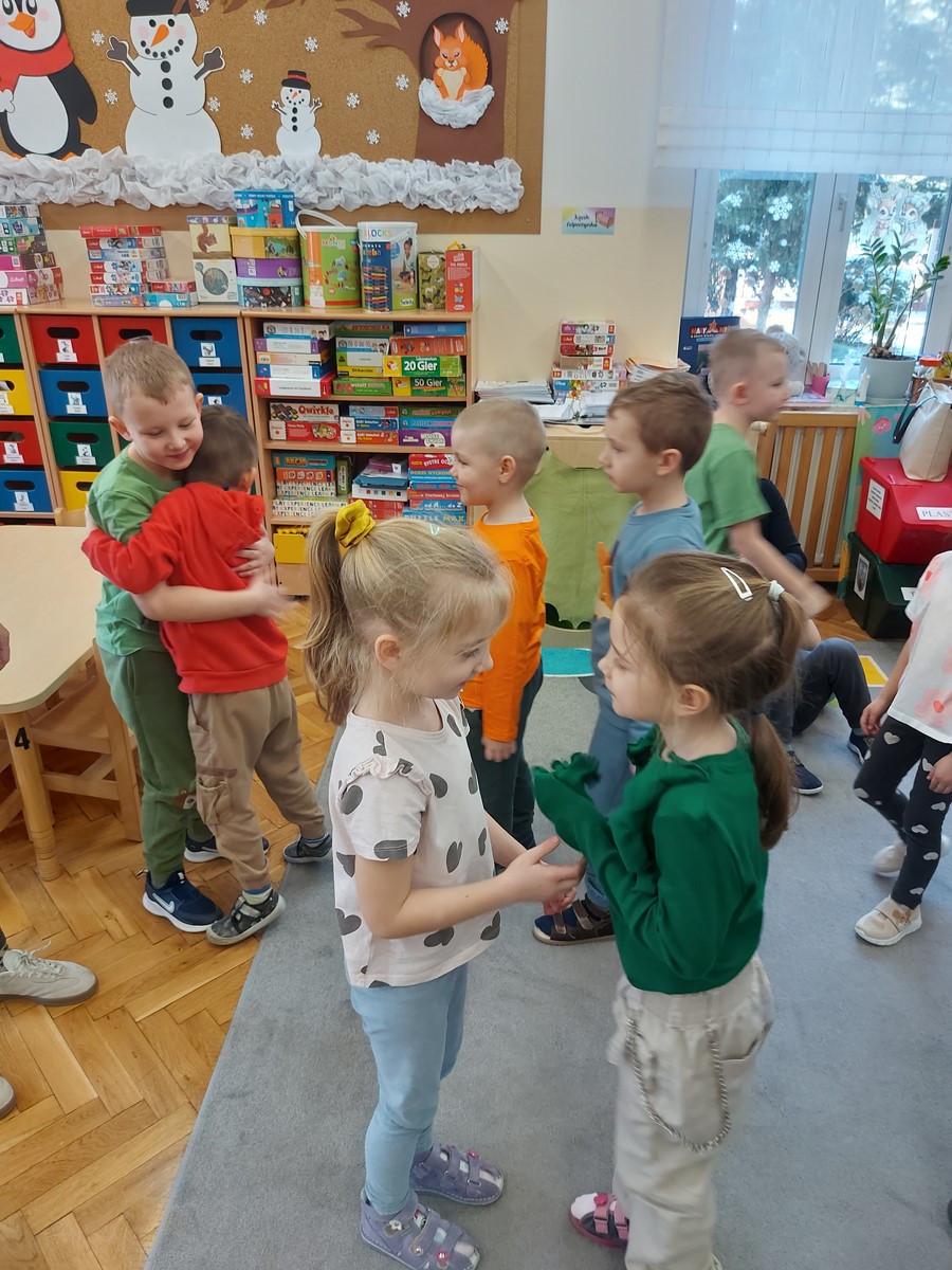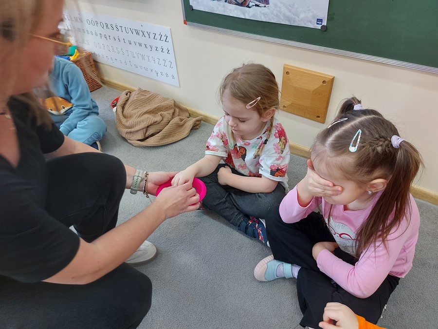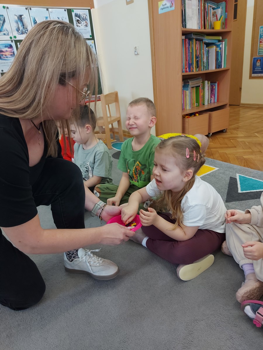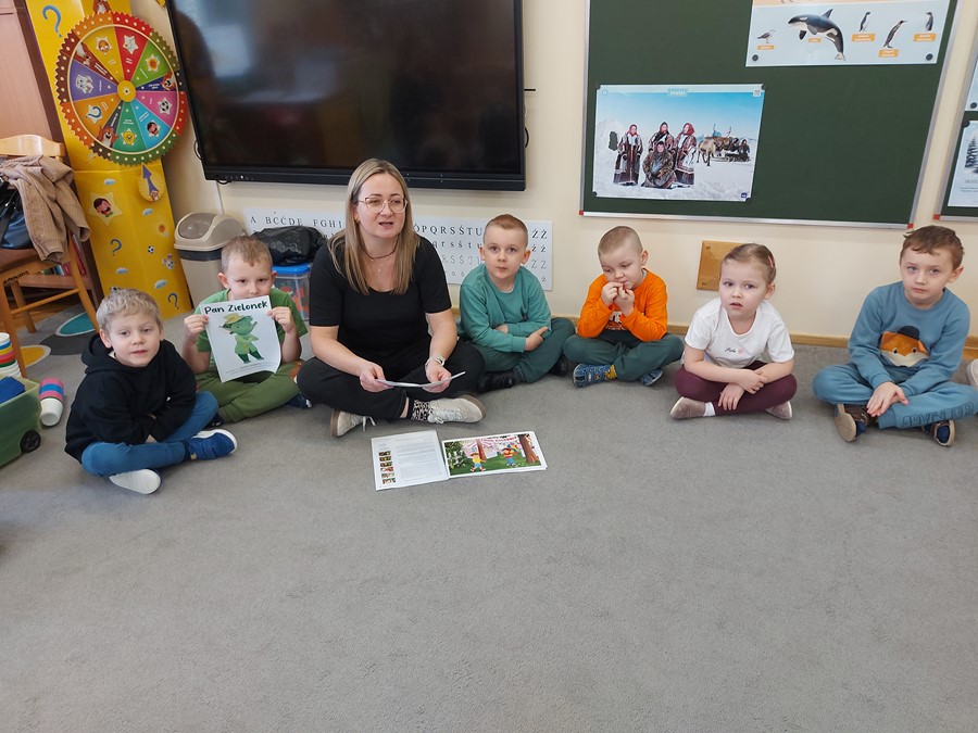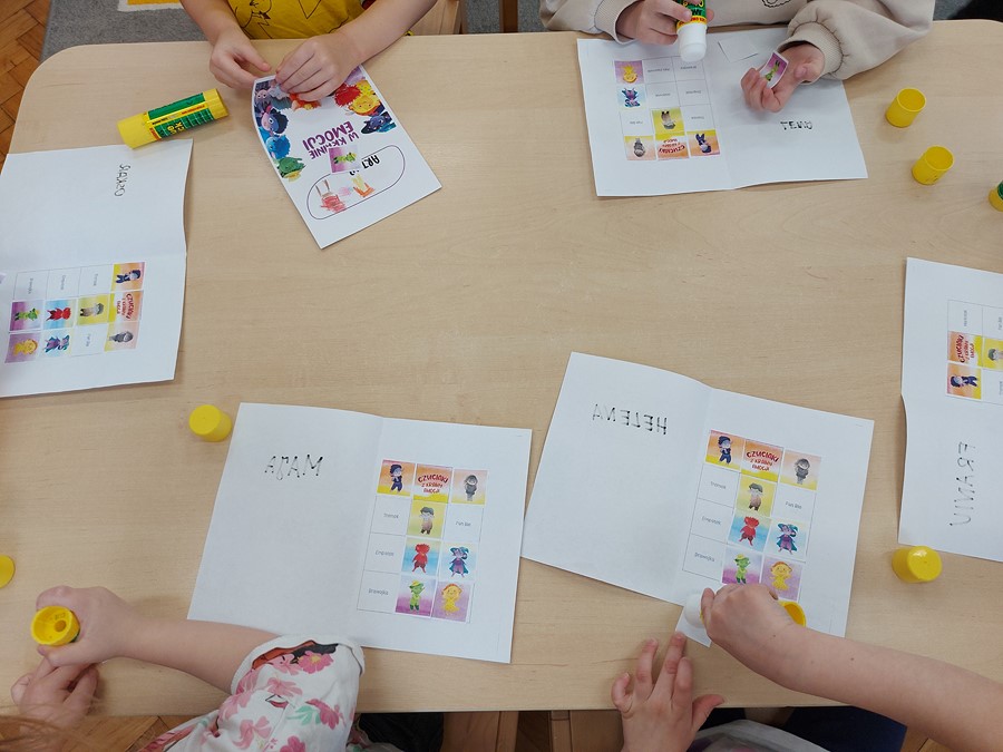 Dzieci z uwagą wysłuchały opowiadania o panu Zielonku i jego przeżyciach. Następnie brały udział w zabawach ruchowych, podczas których w bezpieczny i twórczy sposób mogły zaprezentować emocję zazdrości poprzez gest, ruch i mimikę. Po zakończonych konkurencjach uczestnicy uczyli się gratulować zwycięzcy i cieszyć się sukcesem innych, zgodnie z zasadą fair play. W dalszej części zajęć dzieci losowały swój „wymarzony guziczek”, co stało się okazją do rozmowy o marzeniach i pragnieniach. Każde dziecko miało również możliwość powiedzieć, jak się w danym momencie czuje i podzielić się swoimi przemyśleniami.
