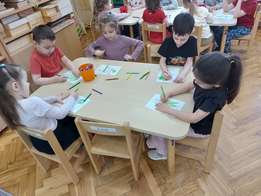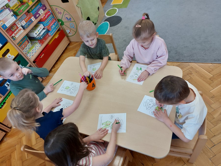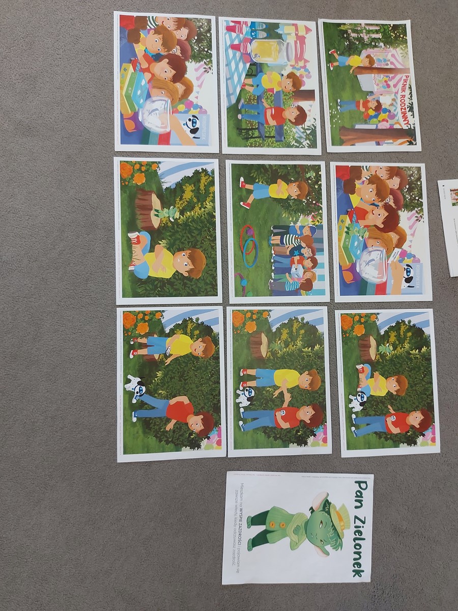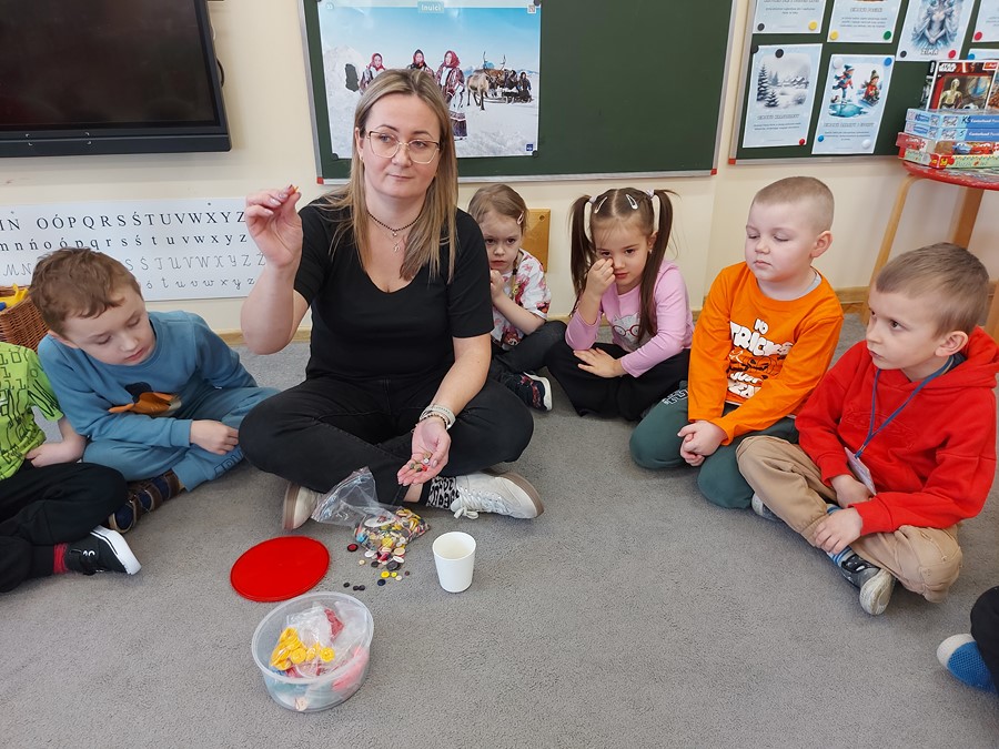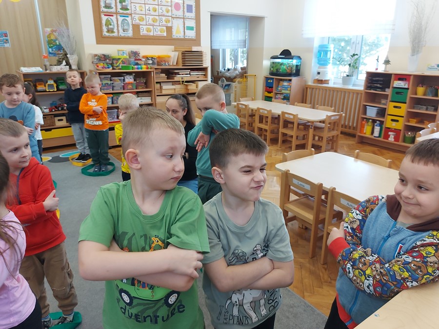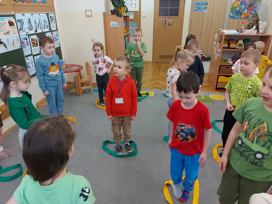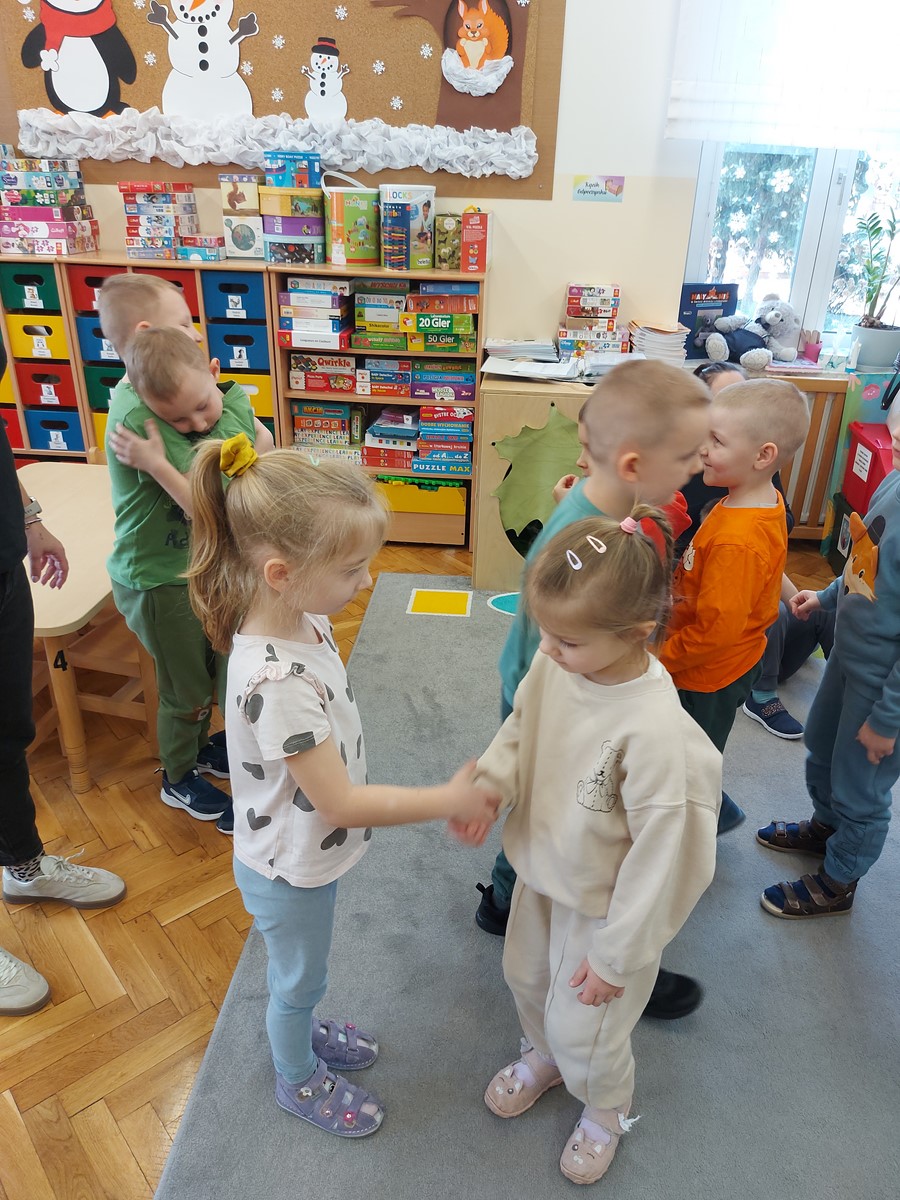 Dzieci z uwagą wysłuchały opowiadania o panu Zielonku i jego przeżyciach. Następnie brały udział w zabawach ruchowych, podczas których w bezpieczny i twórczy sposób mogły zaprezentować emocję zazdrości poprzez gest, ruch i mimikę. Po zakończonych konkurencjach uczestnicy uczyli się gratulować zwycięzcy i cieszyć się sukcesem innych, zgodnie z zasadą fair play. W dalszej części zajęć dzieci losowały swój „wymarzony guziczek”, co stało się okazją do rozmowy o marzeniach i pragnieniach. Każde dziecko miało również możliwość powiedzieć, jak się w danym momencie czuje i podzielić się swoimi przemyśleniami.