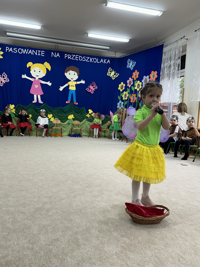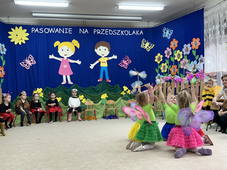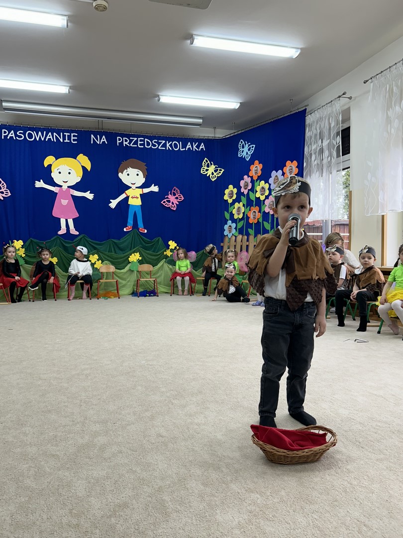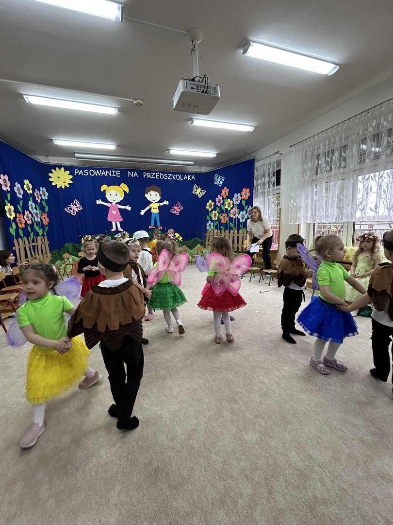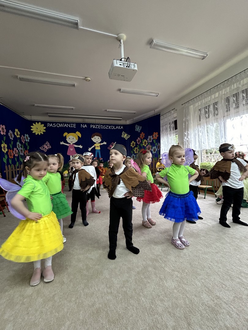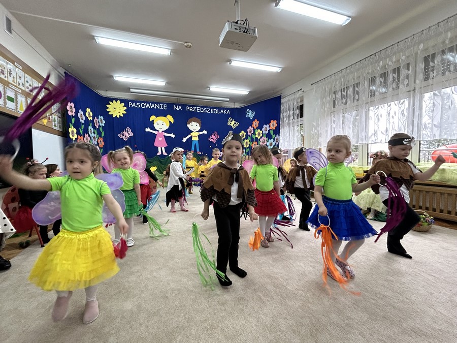 27.03.2026r. odbyło się uroczyste Pasowanie na Przedszkolaka. Była to wyjątkowa i barwna uroczystość utrzymana w wiosennym klimacie. Tego dnia sala przedszkolna zamieniła się w kolorową łąkę, a dzieci wystąpiły w pięknych strojach – można było zobaczyć motyle, pszczoły, ptaki oraz biedronki. Każde dziecko z dumą prezentowało swoje przebranie, wprowadzając wszystkich w radosny, wiosenny nastrój.