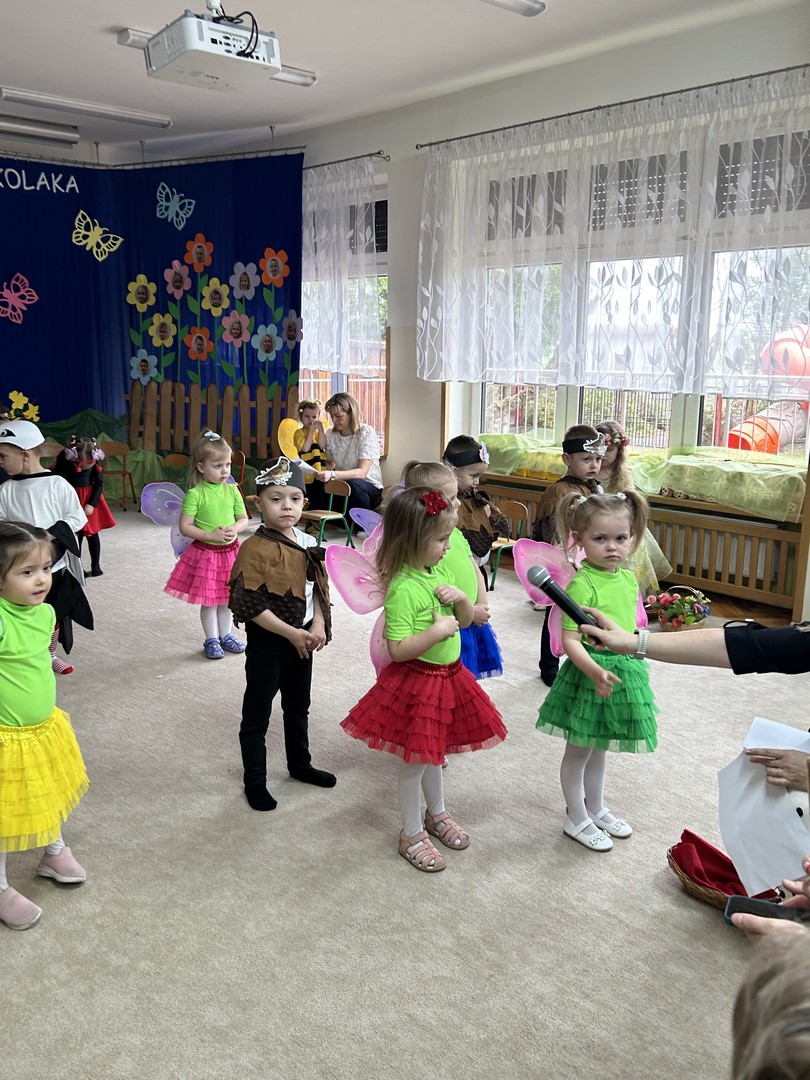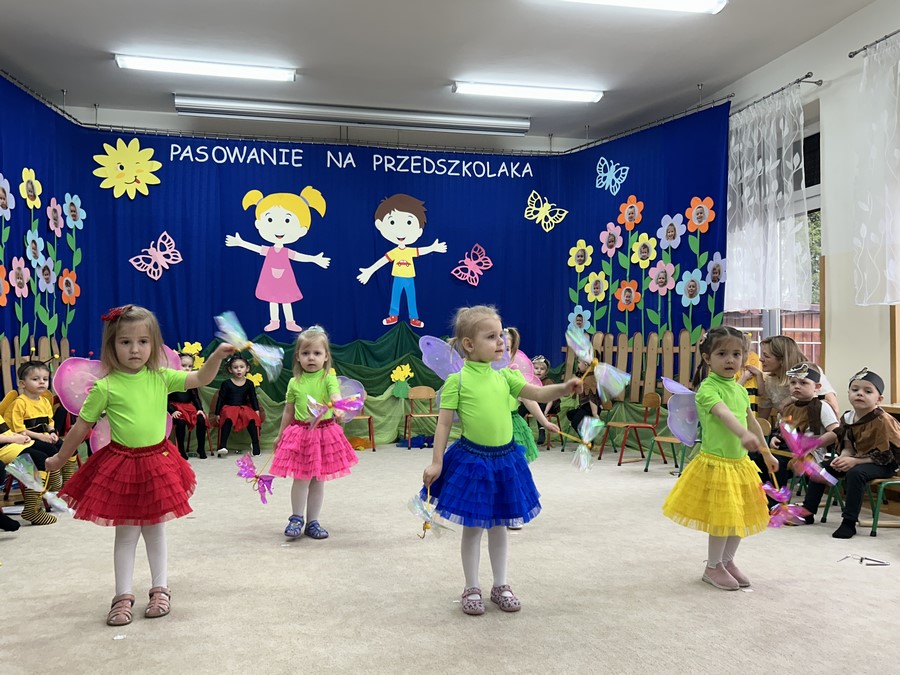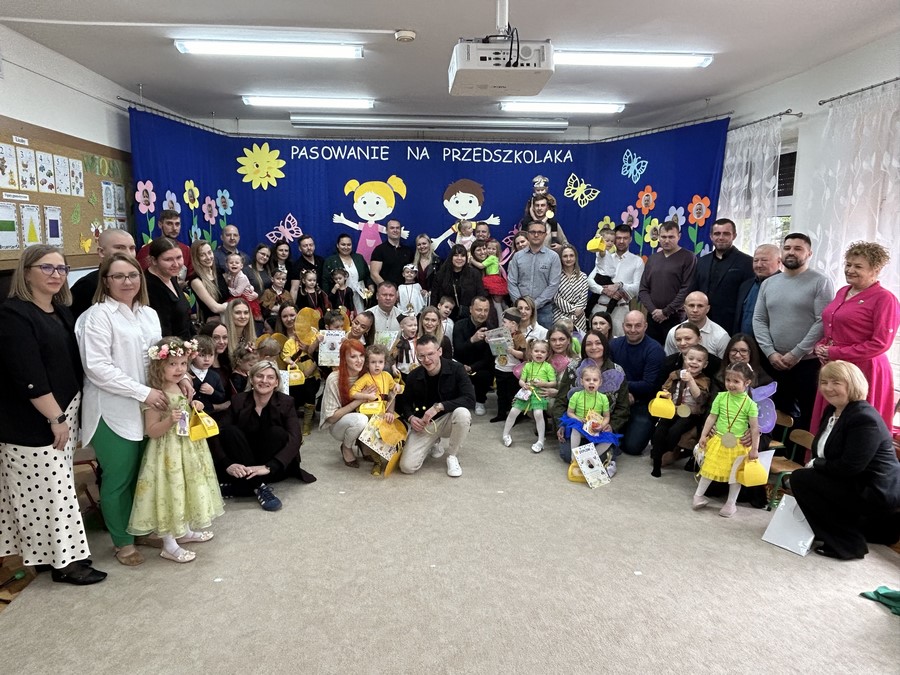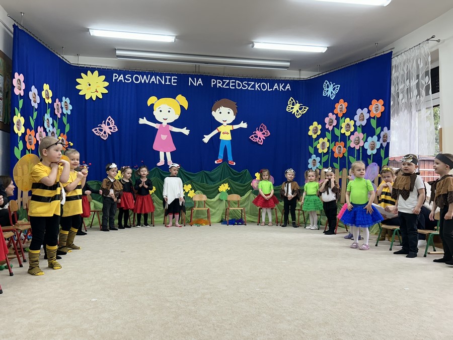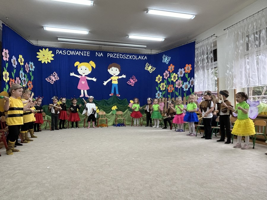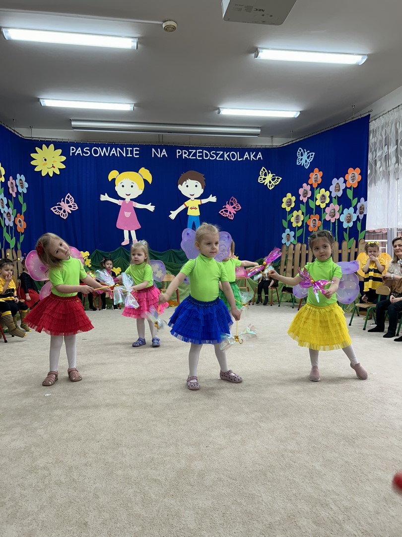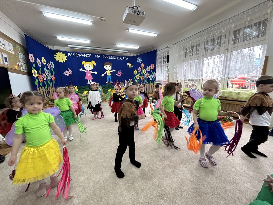 27.03.2026r. odbyło się uroczyste Pasowanie na Przedszkolaka. Była to wyjątkowa i barwna uroczystość utrzymana w wiosennym klimacie. Tego dnia sala przedszkolna zamieniła się w kolorową łąkę, a dzieci wystąpiły w pięknych strojach – można było zobaczyć motyle, pszczoły, ptaki oraz biedronki. Każde dziecko z dumą prezentowało swoje przebranie, wprowadzając wszystkich w radosny, wiosenny nastrój.