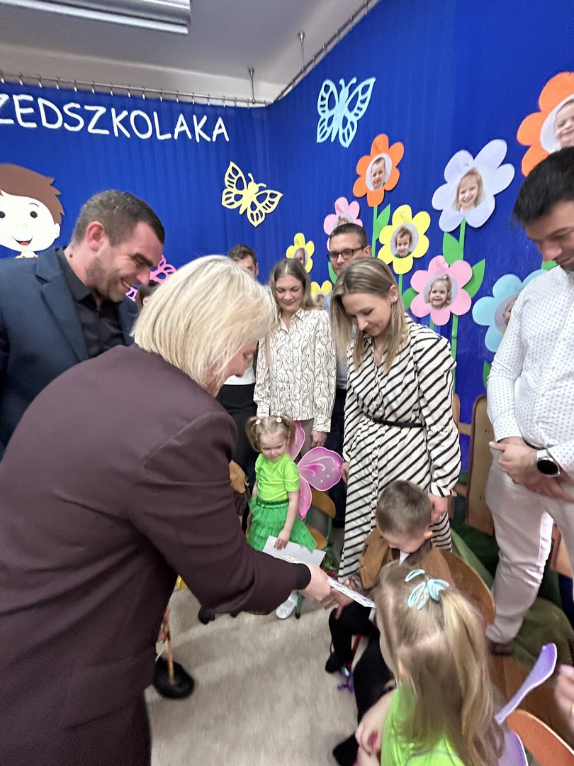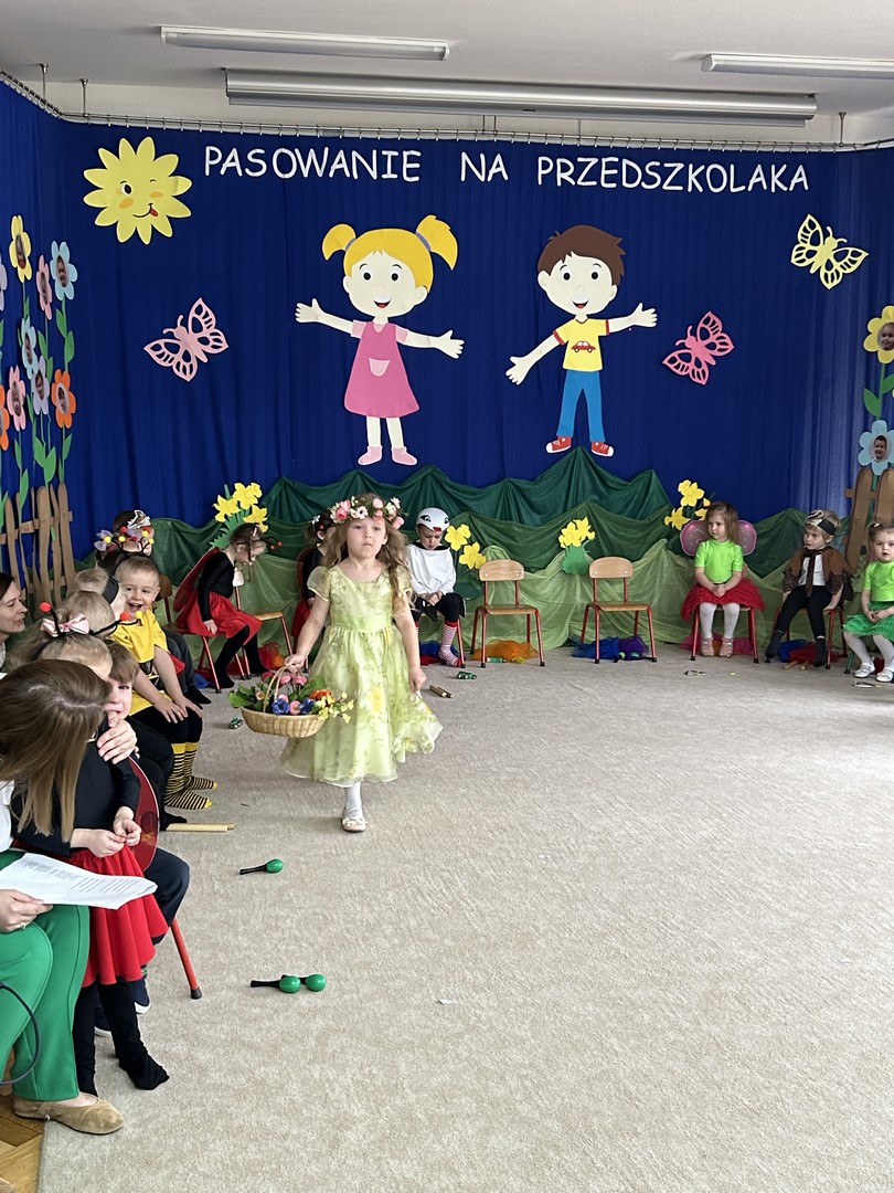 Pani Wiosna była pod wrażeniem umiejętności i starań wszystkich dzieci, dlatego każde z nich zostało nagrodzone brawami i ciepłym słowem. Po pomyślnym wykonaniu wszystkich zadań nastąpił uroczysty moment pasowania na przedszkolaka. Była to chwila pełna wzruszeń i radości, która na długo pozostanie w pamięci dzieci, rodziców i wychowawców.