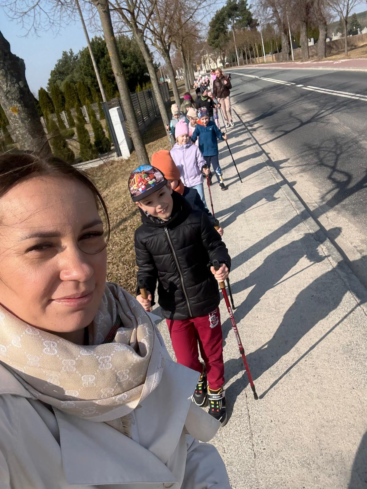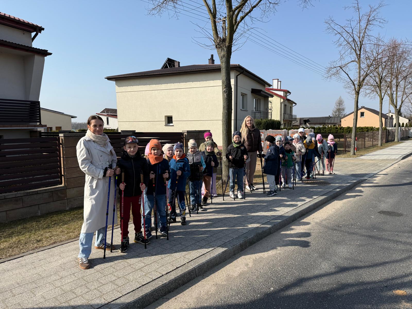 6 latki wraz z panią wybrały się w tym roku na pierwszy spacer z kijkami.