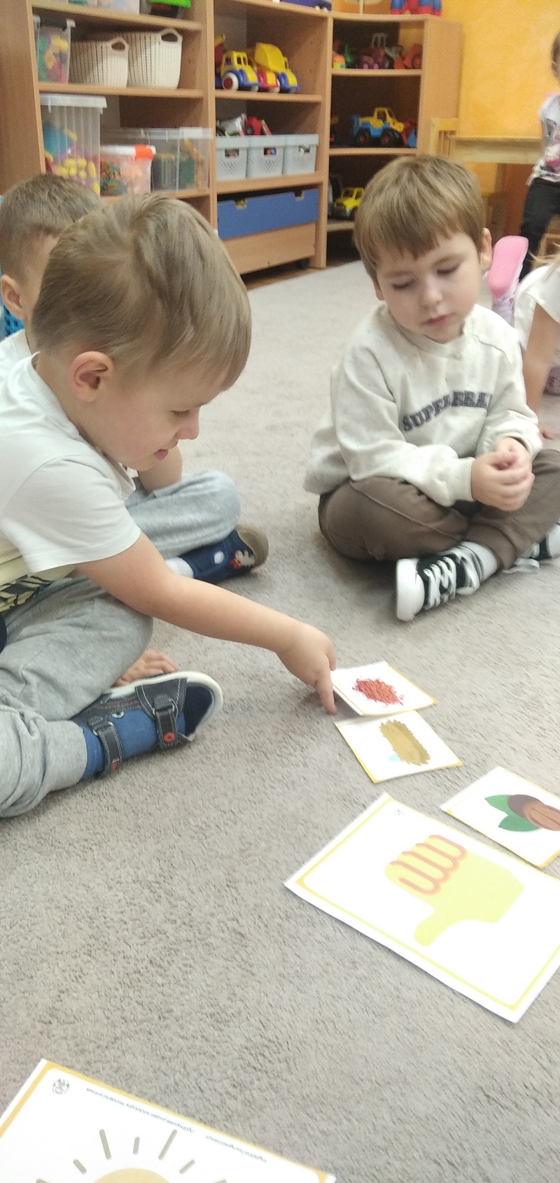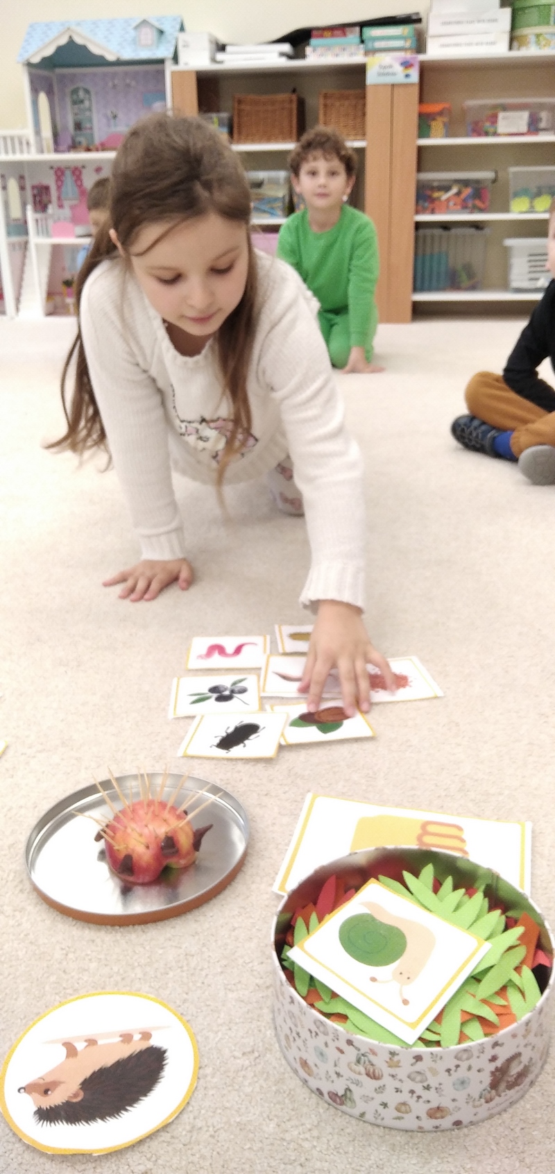 Przedszkolaki chętnie uczestniczyły w zadaniach sensorycznych - wykonały i dotykały jeża zrobionego z wykałaczek i jabłka. Promyczki i chmurki doskonaliły swoje umiejętności w zadaniach z kodowania wykorzystując karty przedstawiające pożywienie jeża i klasyfikowały je wg. koloru i wzoru.
