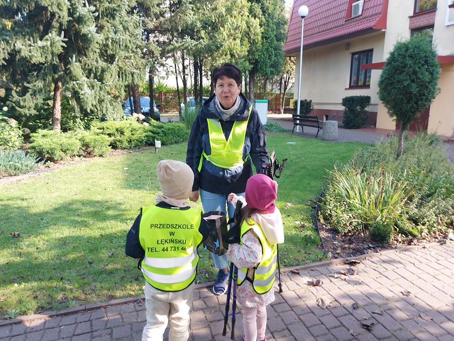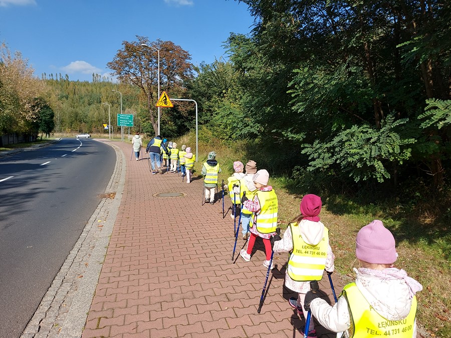 Spotkanie poprowadziła pani Ela – instruktor Nordic Walking, która w ciekawy i przystępny sposób wprowadziła przedszkolaki w tajniki tej aktywności. Ubrane w odblaskowe kamizelki, Promyczki dzielnie maszerowały ulicami Łękińska, ucząc się prawidłowej postawy, rytmu marszu i współpracy w grupie. Było dużo ruchu, śmiechu i pozytywnej energii!