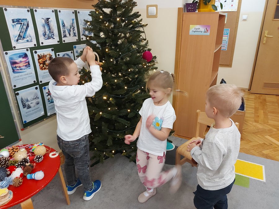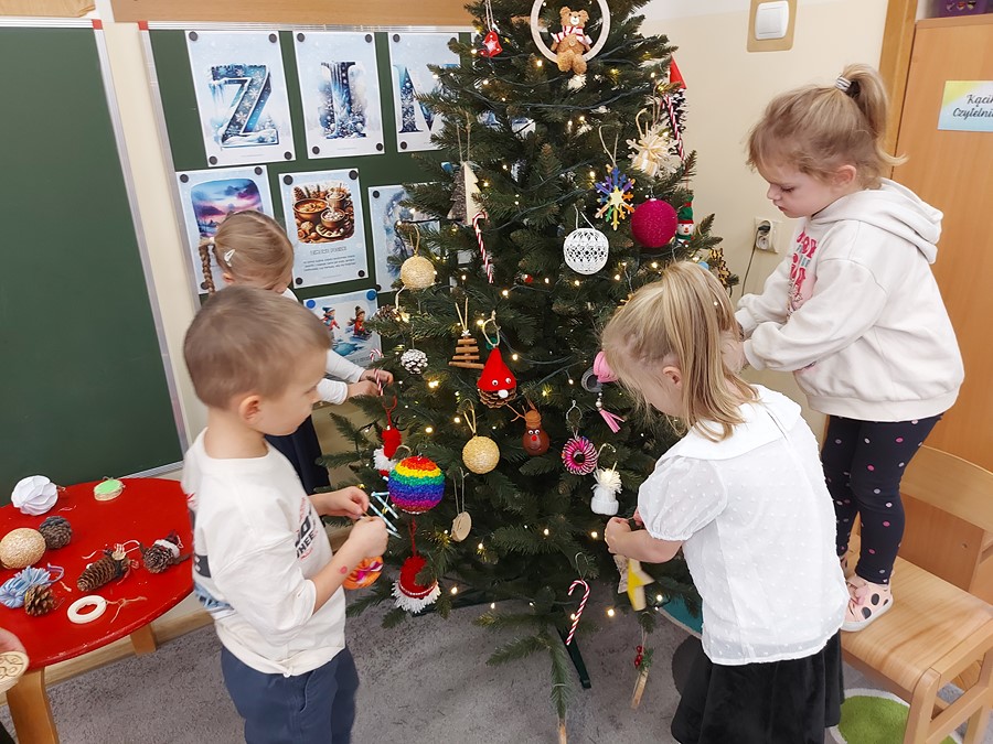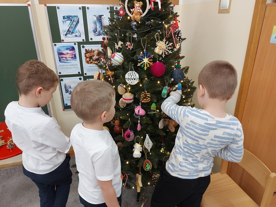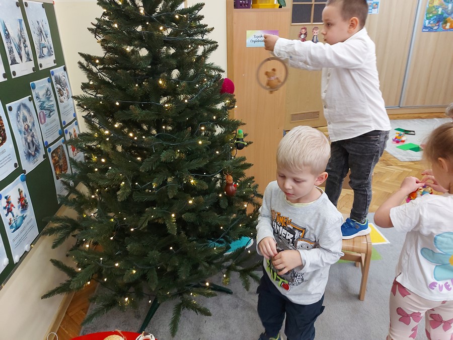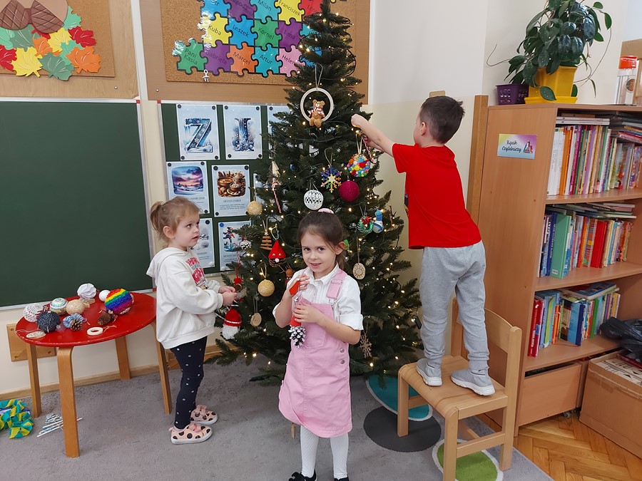 Ozdoby, które zawisły na choince, zostały przygotowane przez rodziców i zbierane jeszcze od czasu, gdy grupa była w wieku 3 lat i uzupełniane przez kolejne lata. Dzięki temu nasza choinka jest wyjątkowa – pełna wspomnień, kolorów i serca włożonego w jej przygotowanie. Dzieci z ogromnym entuzjazmem zawieszały ekologiczne ozdoby i inne dekoracje, ciesząc się każdym elementem świątecznej pracy.