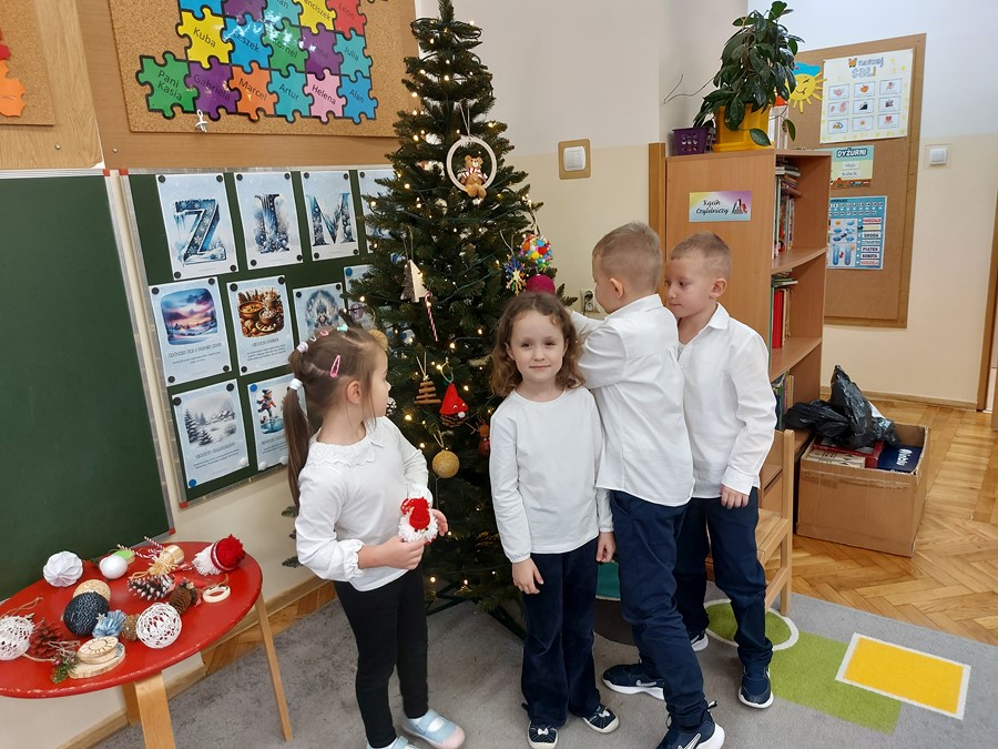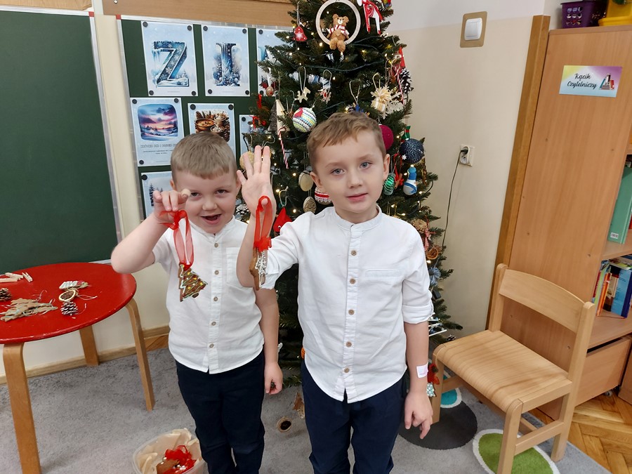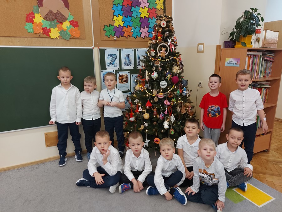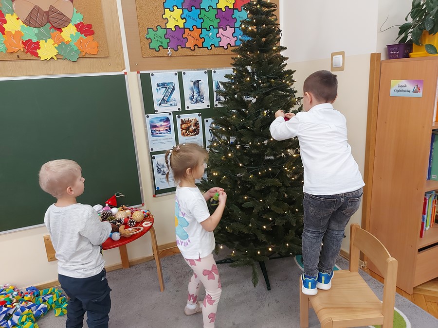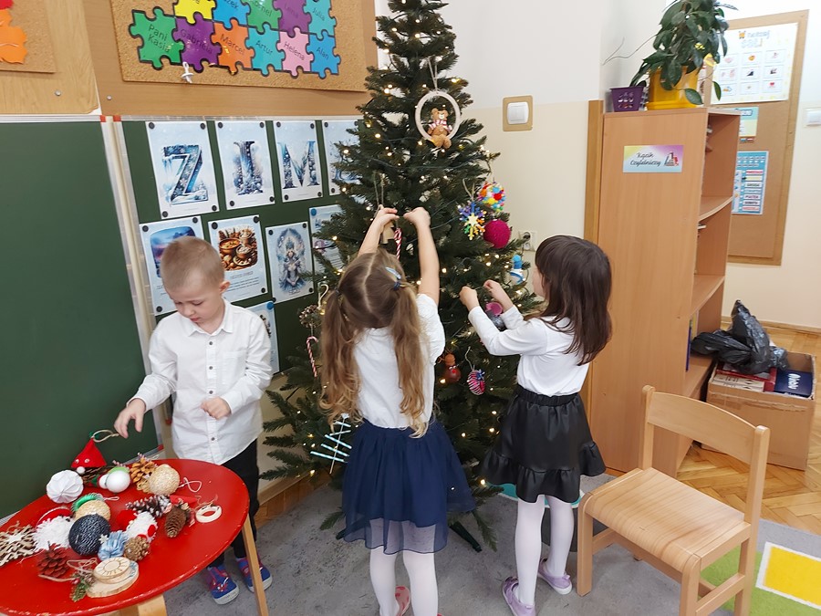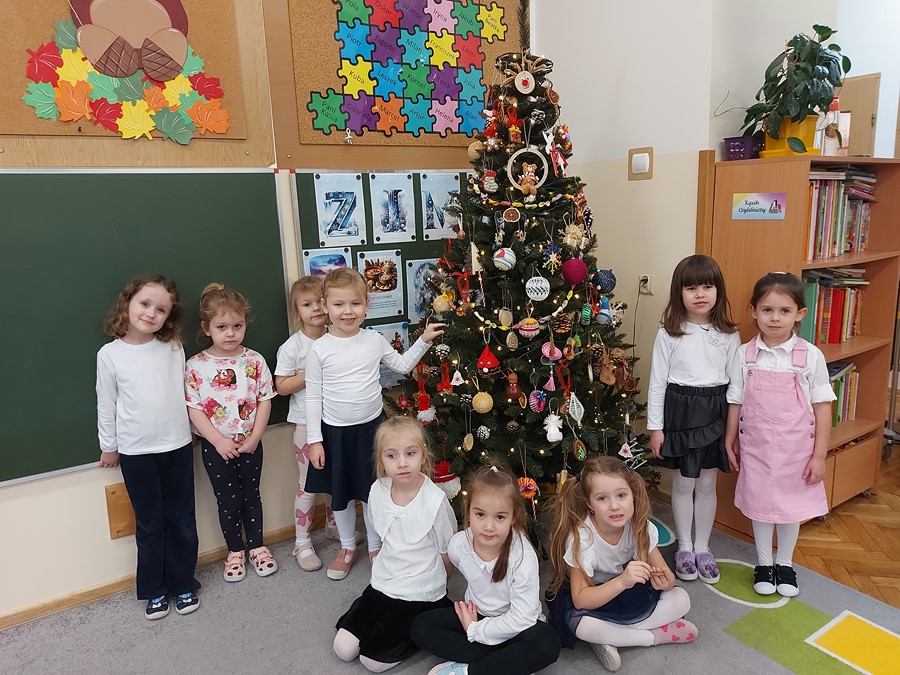 Ozdoby, które zawisły na choince, zostały przygotowane przez rodziców i zbierane jeszcze od czasu, gdy grupa była w wieku 3 lat i uzupełniane przez kolejne lata. Dzięki temu nasza choinka jest wyjątkowa – pełna wspomnień, kolorów i serca włożonego w jej przygotowanie. Dzieci z ogromnym entuzjazmem zawieszały ekologiczne ozdoby i inne dekoracje, ciesząc się każdym elementem świątecznej pracy.