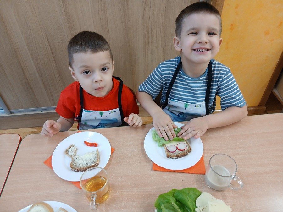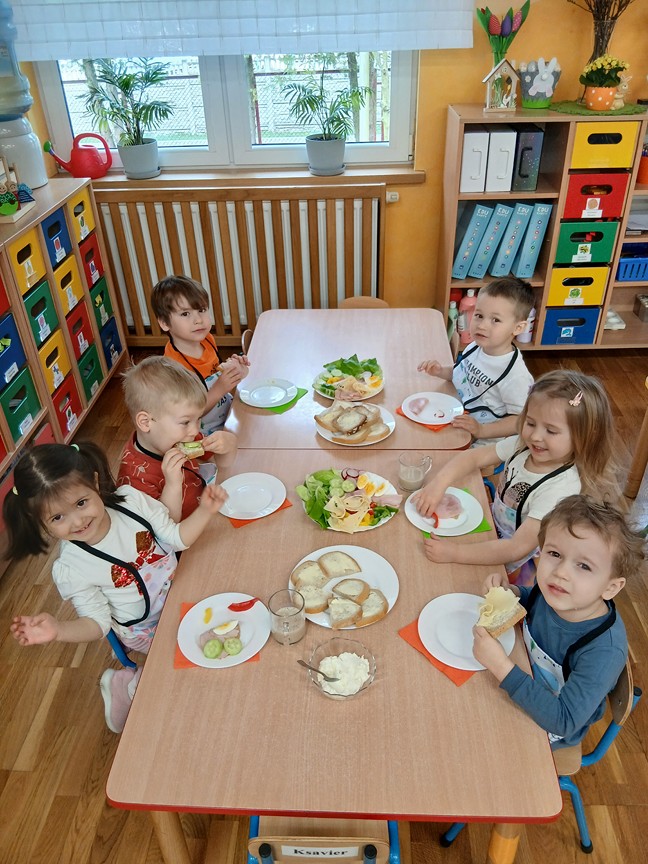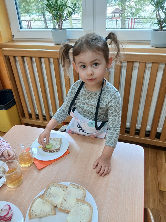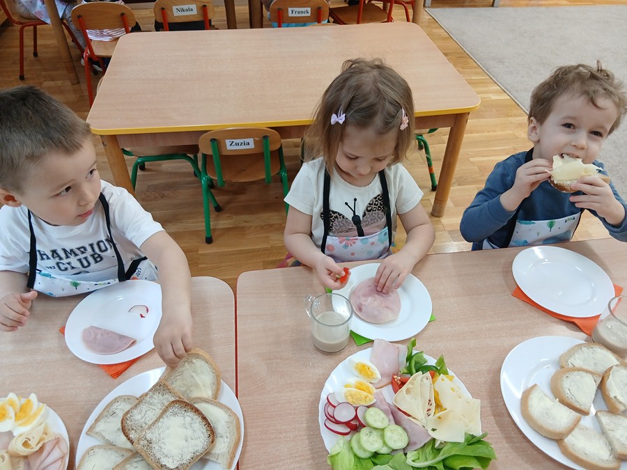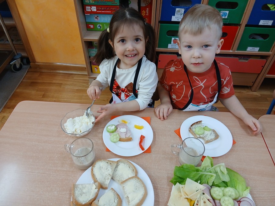 ,,Słoneczka” w ramach rozmowy o zdrowym odżywianiu zamieniły się w małych kucharzy i samodzielnie przygotowywały kanapki. Po starannym umyciu rączek i przygotowaniu stanowisk pracy na stołach zagościły świeże warzywa: sałata, rzodkiewki, papryka, pomidor oraz ogórki. Nie zabrakło wędliny, sera a także pieczywa. Dzieci samodzielnie układały na kanapkę wybrane przez siebie produkty, tworząc ciekawe kompozycje. Można śmiało powiedzieć, że zadanie wykonały doskonale. Podczas robienia kanapek kształciły odpowiednie nawyki żywieniowe, rozwijały kreatywność, wyobraźnię oraz dbałość o higienę.