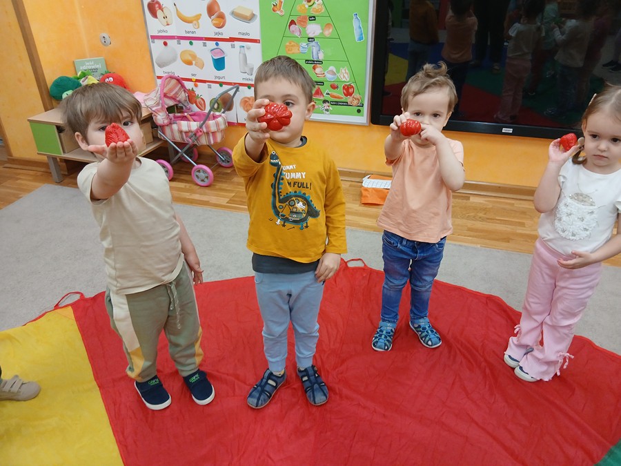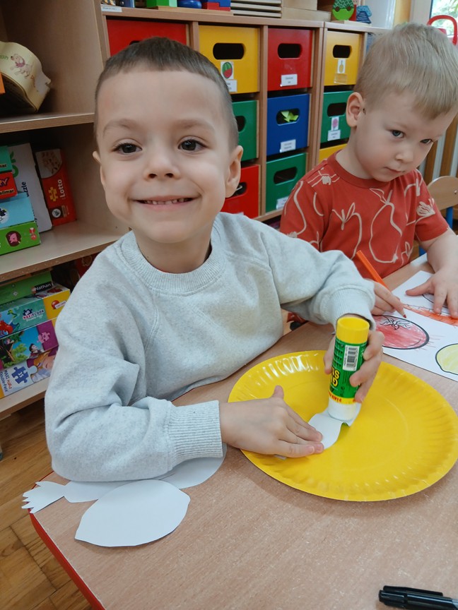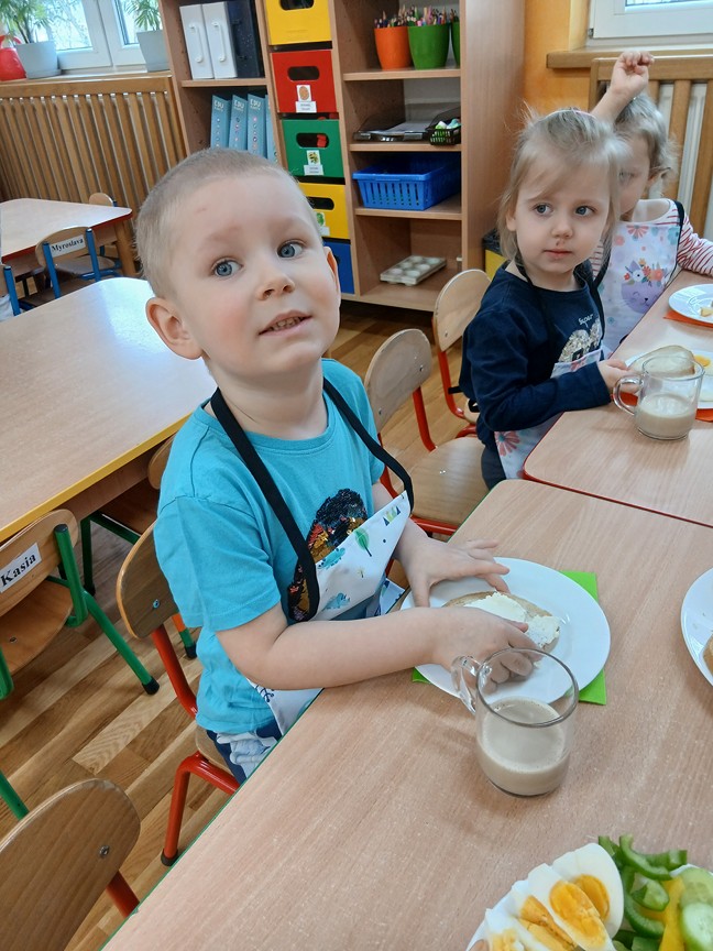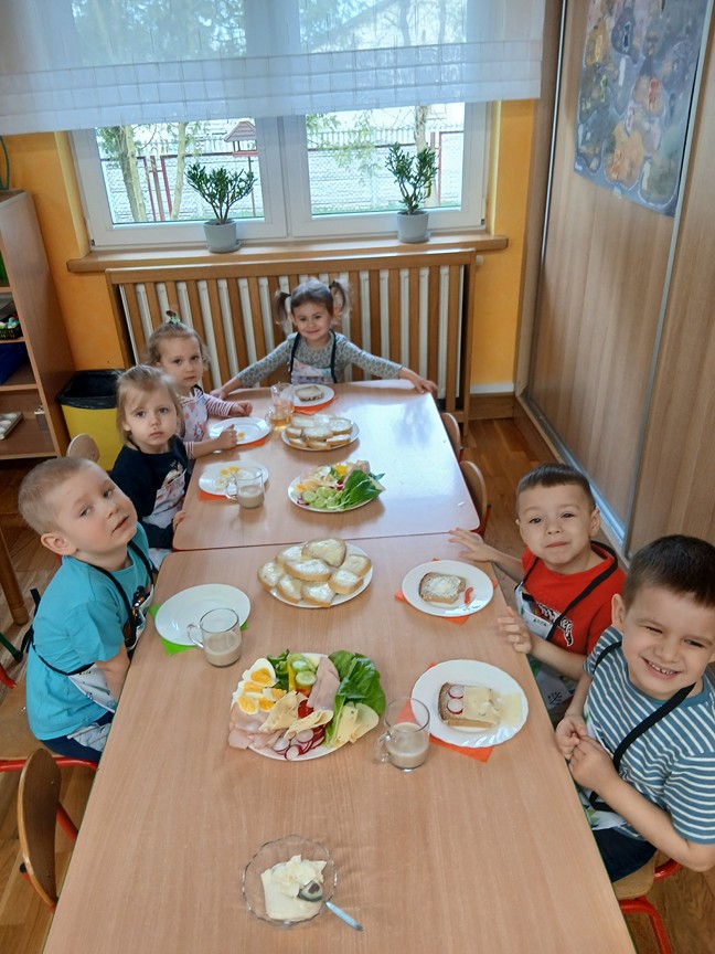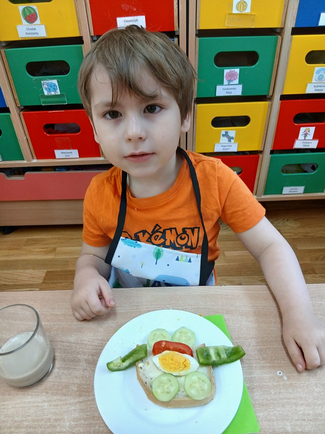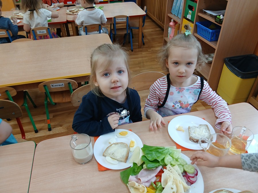 ,,Słoneczka” w ramach rozmowy o zdrowym odżywianiu zamieniły się w małych kucharzy i samodzielnie przygotowywały kanapki. Po starannym umyciu rączek i przygotowaniu stanowisk pracy na stołach zagościły świeże warzywa: sałata, rzodkiewki, papryka, pomidor oraz ogórki. Nie zabrakło wędliny, sera a także pieczywa. Dzieci samodzielnie układały na kanapkę wybrane przez siebie produkty, tworząc ciekawe kompozycje. Można śmiało powiedzieć, że zadanie wykonały doskonale. Podczas robienia kanapek kształciły odpowiednie nawyki żywieniowe, rozwijały kreatywność, wyobraźnię oraz dbałość o higienę.