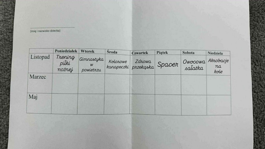 Dzieci z grupy Promyczki w dniach 3–9 listopada aktywnie uczestniczyły w realizacji zadania z innowacji pedagogicznej „Rusz się z kijkami, wesprzyj i witaminami” pod tytułem „Rodzinny Tydzień Aktywności”. Każdego dnia wspólnie z rodzicami podejmowały różnorodne formy ruchu i troski o zdrowie, a wykonane działania dokumentowały zdjęciami.