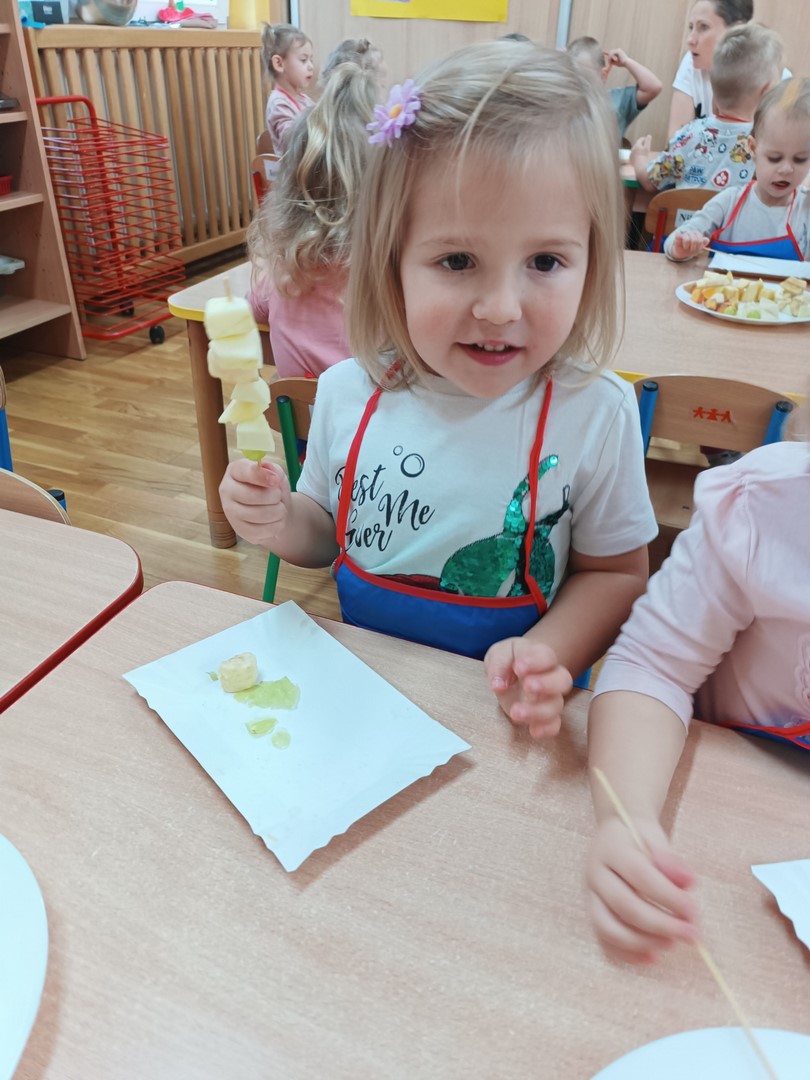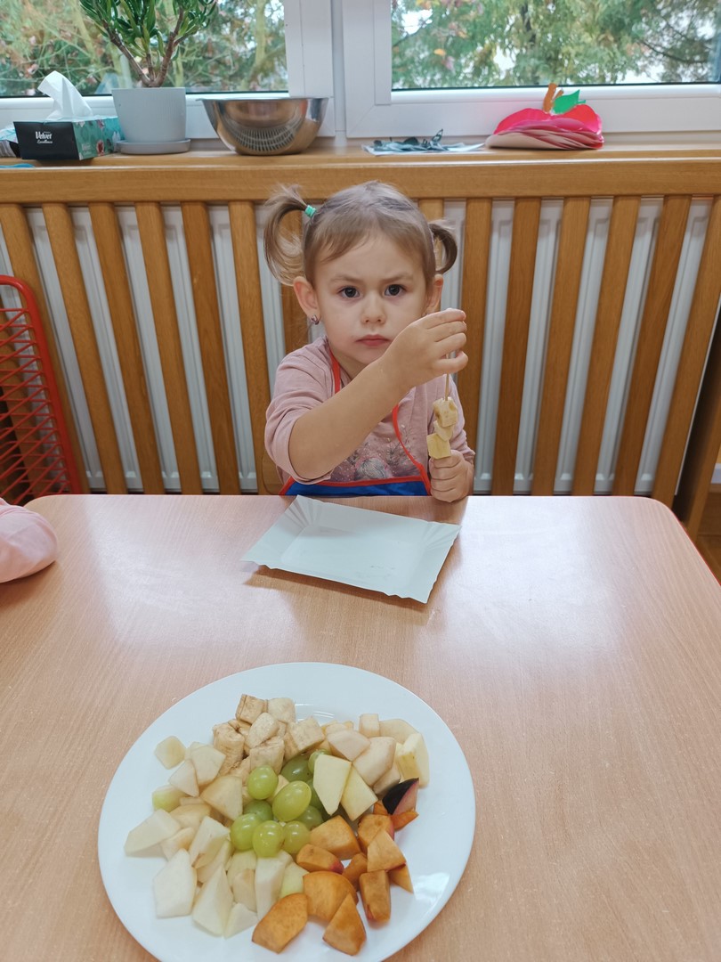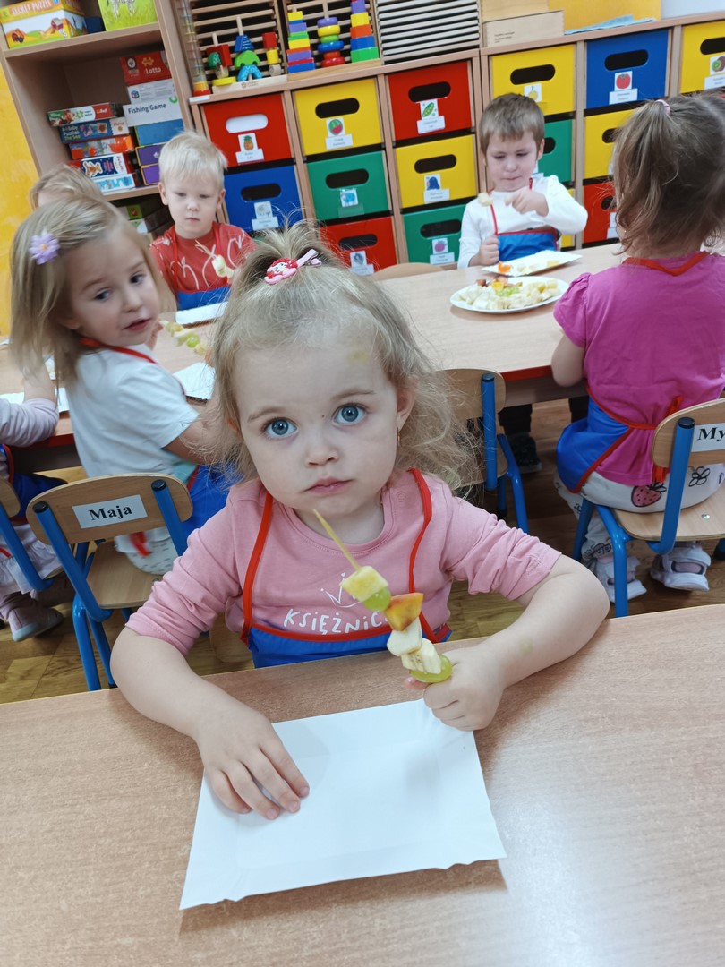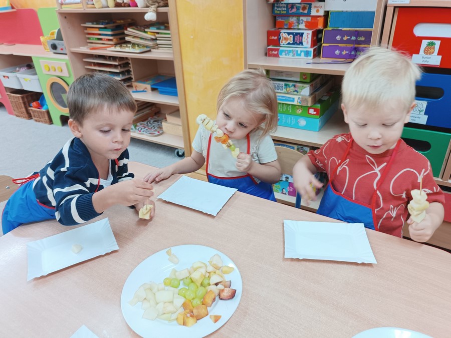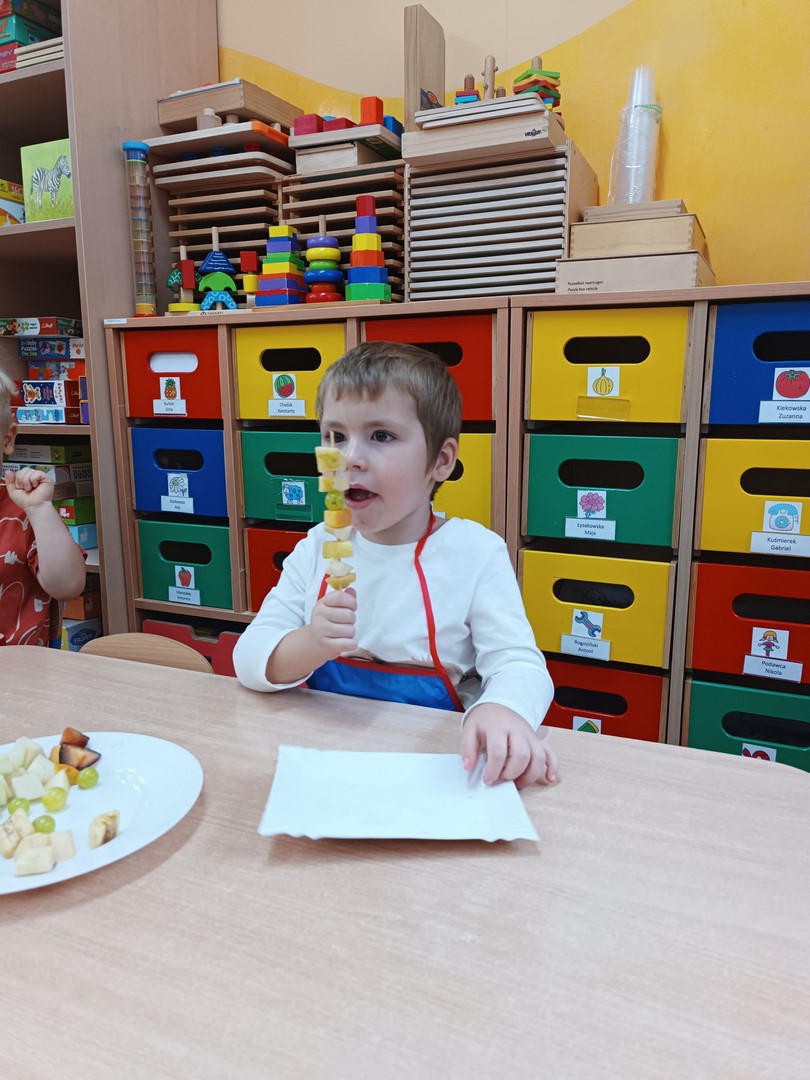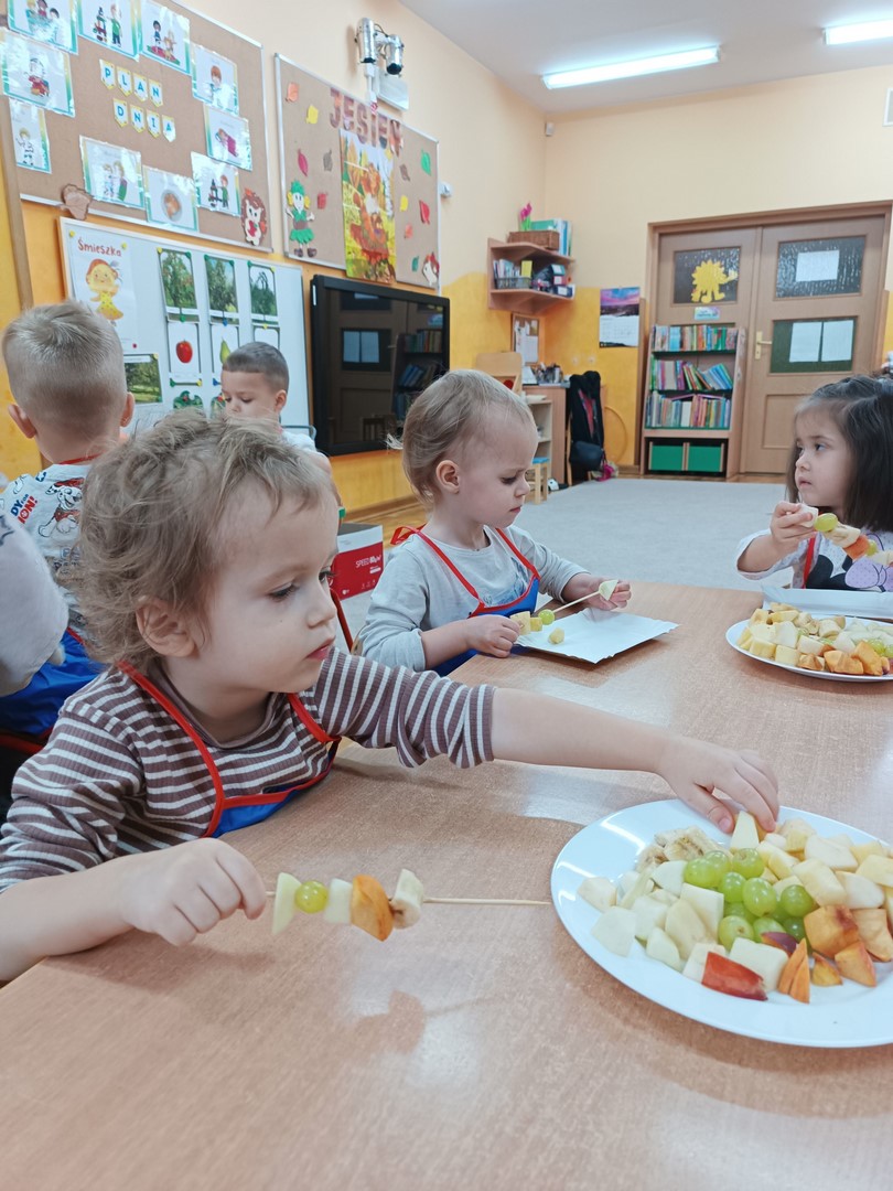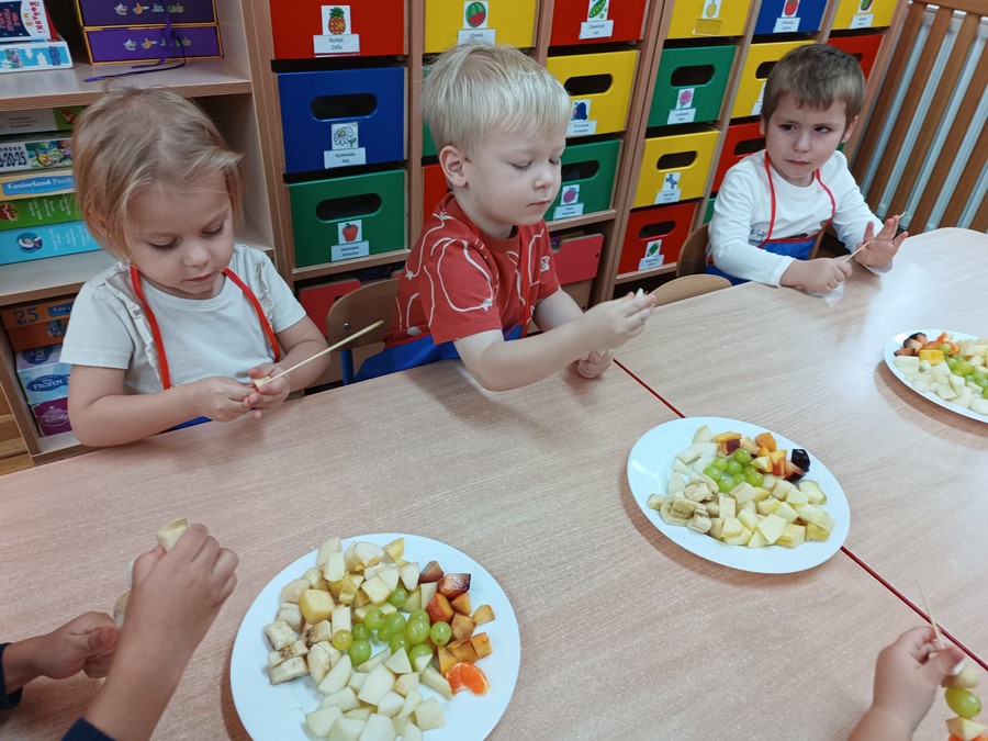Przygotowywanie owocowych szaszłyków było dla dzieci doskonałą okazją do utrwalenia zdobytej wiedzy w praktyce oraz do rozwijania samodzielności podczas przygotowania szaszłyków z owoców sadu (gruszek, jabłek, śliwek, brzoskwini).