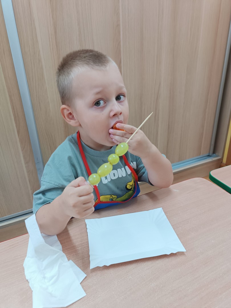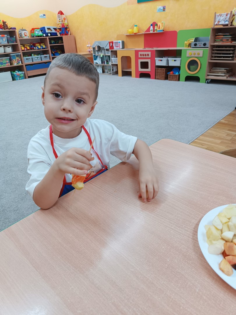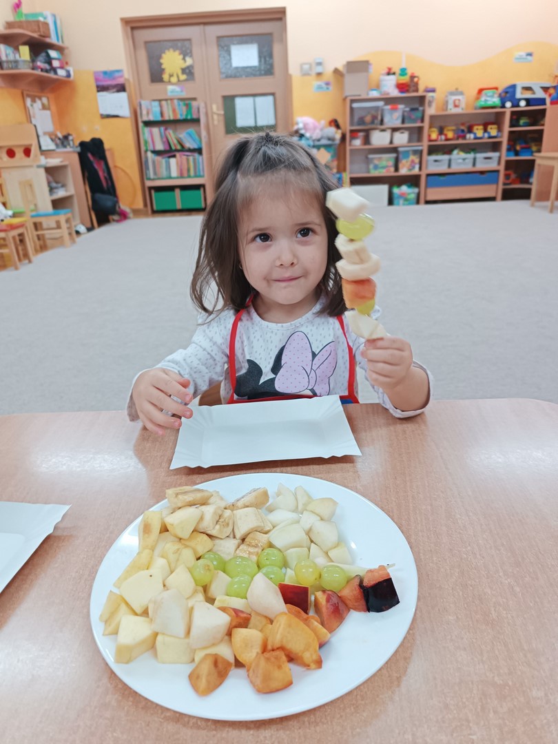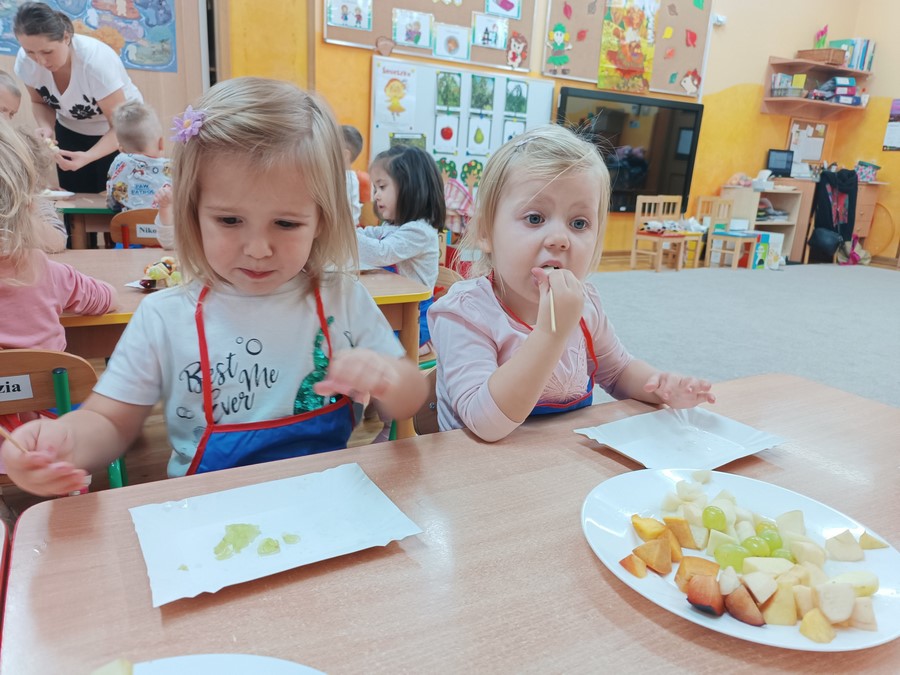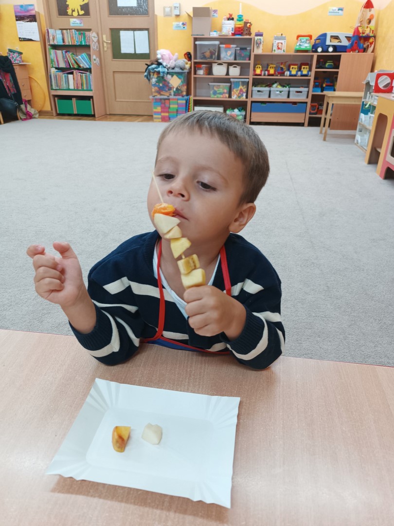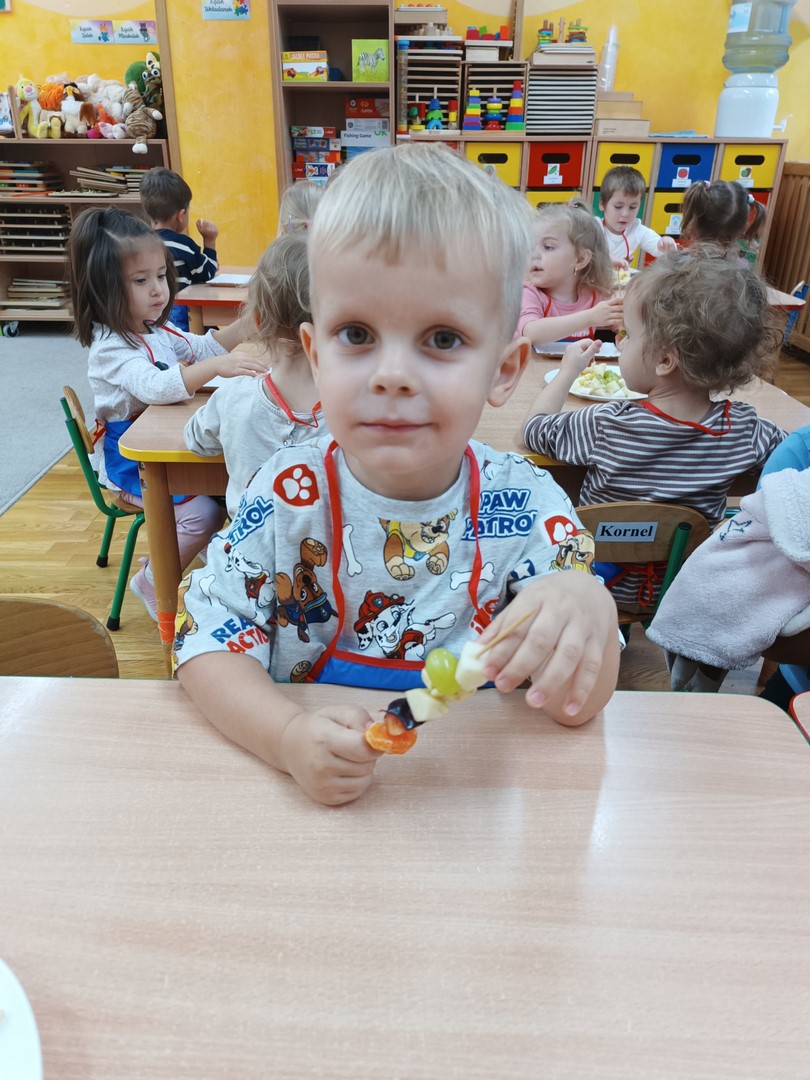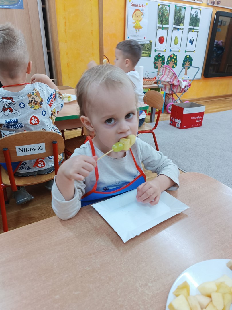 Przygotowywanie owocowych szaszłyków było dla dzieci doskonałą okazją do utrwalenia zdobytej wiedzy w praktyce oraz do rozwijania samodzielności podczas przygotowania szaszłyków z owoców sadu (gruszek, jabłek, śliwek, brzoskwini).