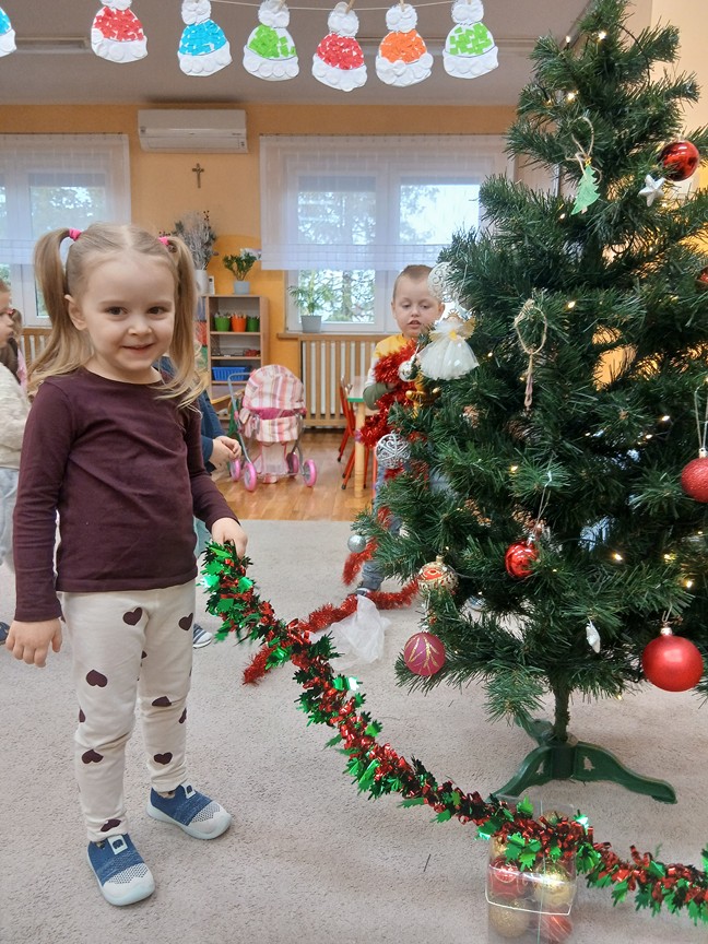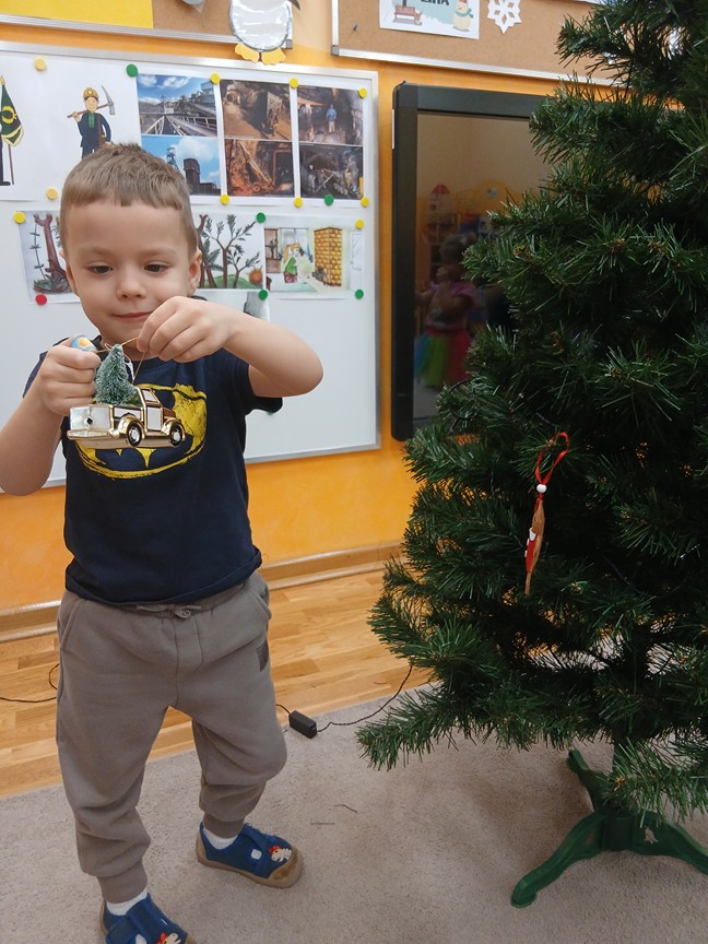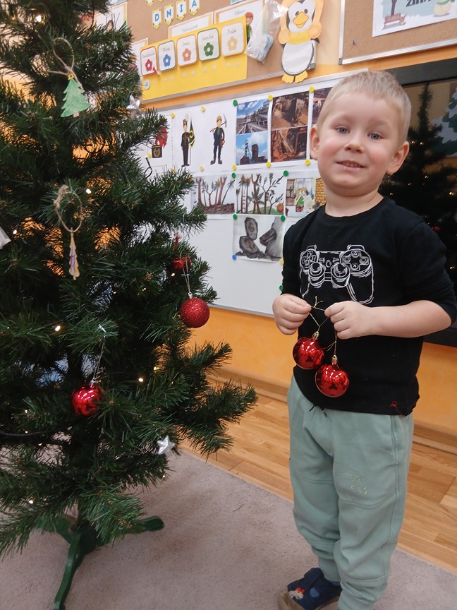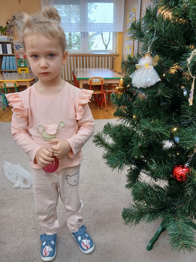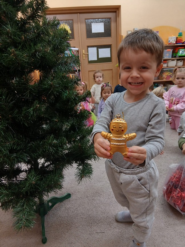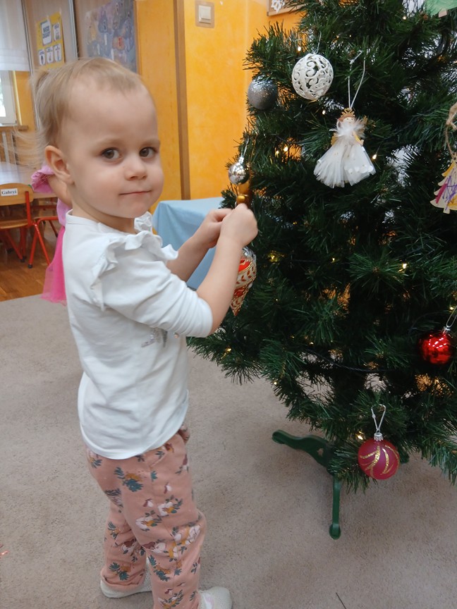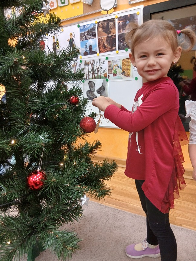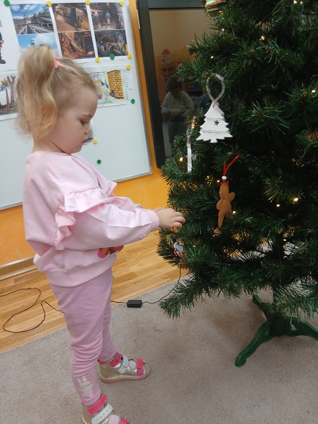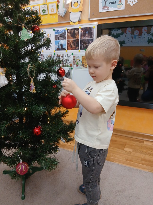 Ubieranie choinki – to moment , na który z niecierpliwością czekały wszystkie przedszkolaki. Słoneczka z zapałem przystąpiły do zawieszania na gałązkach ozdób, łańcuchów i kolorowych lampek. Drzewko zostało przystrojone bardzo szybko, wygląda wyjątkowo i przypomina nam, że Święta Bożego Narodzenia zbliżają się tuż, tuż…