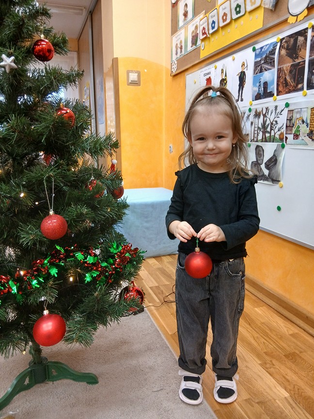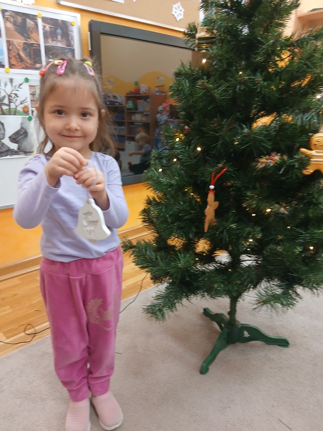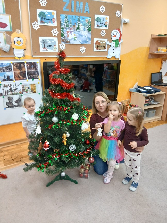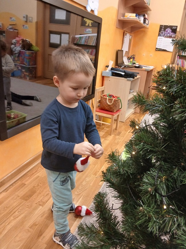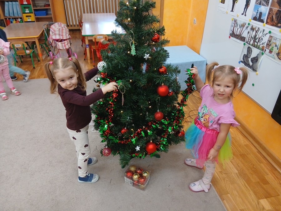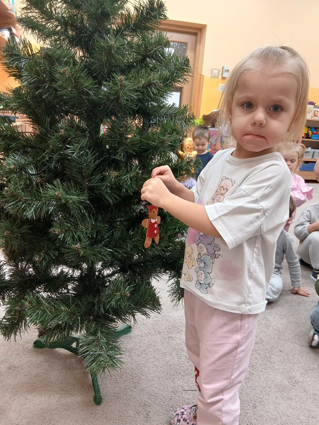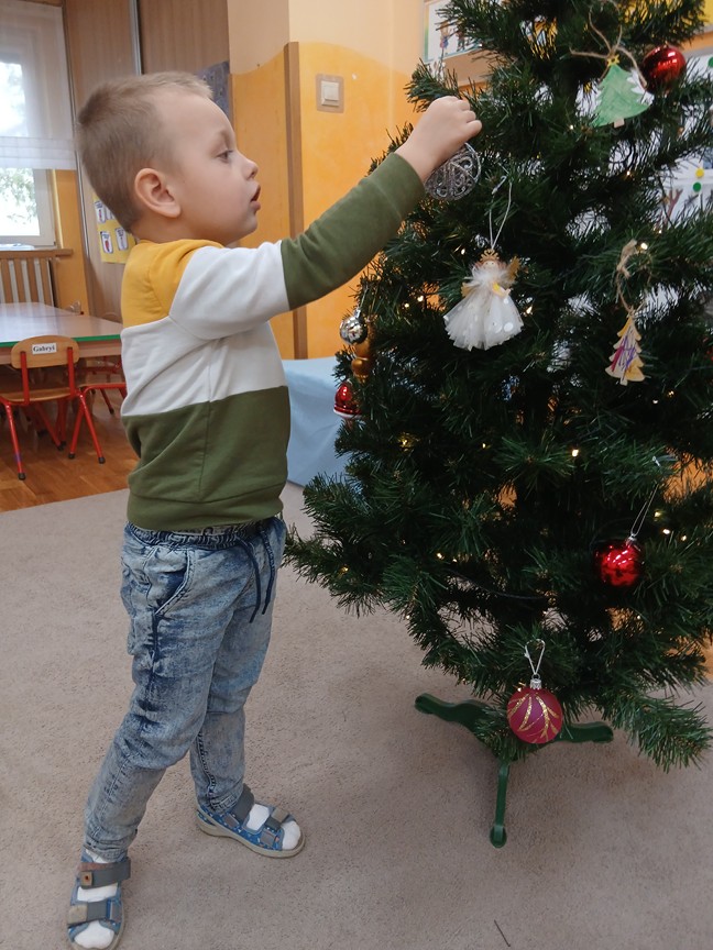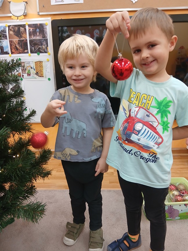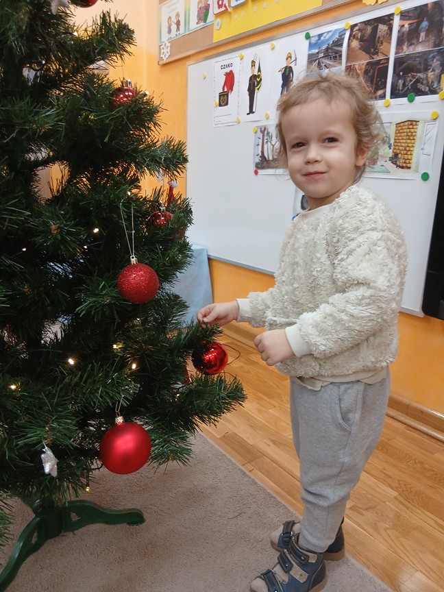 Ubieranie choinki – to moment , na który z niecierpliwością czekały wszystkie przedszkolaki. Słoneczka z zapałem przystąpiły do zawieszania na gałązkach ozdób, łańcuchów i kolorowych lampek. Drzewko zostało przystrojone bardzo szybko, wygląda wyjątkowo i przypomina nam, że Święta Bożego Narodzenia zbliżają się tuż, tuż…