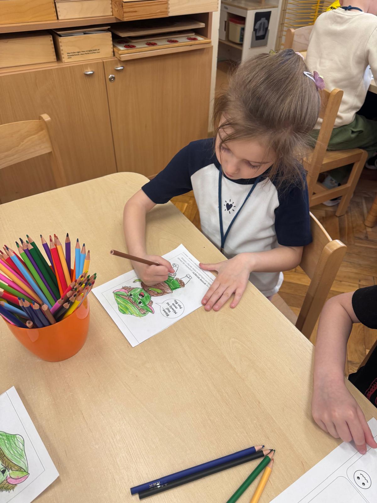 W dalszej części zajęć dzieci kolorowały postać Pana Ble oraz tworzyły własne rysunki przedstawiające to, co wywołuje u nich przyjemne skojarzenia, takie jak ulubione zapachy czy smaki, a także to, co budzi w nich wstręt i obrzydzenie. Dzięki temu mogły lepiej zrozumieć swoje odczucia i różnice między nimi.