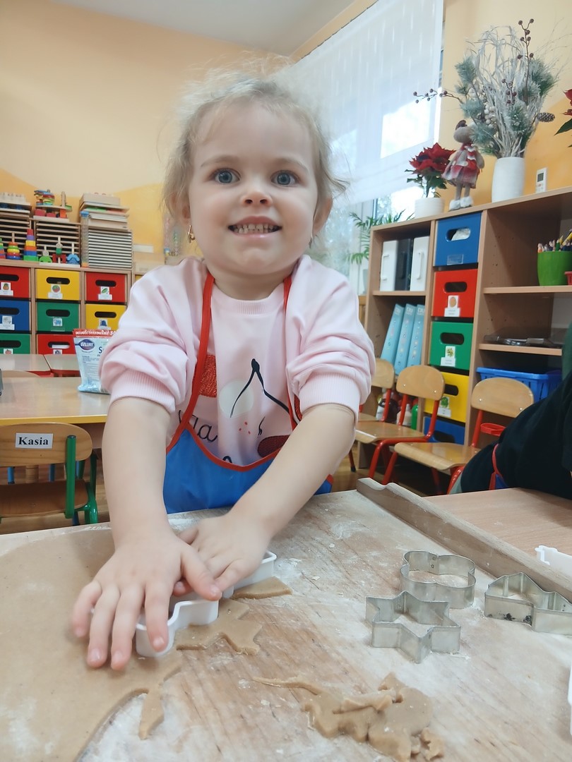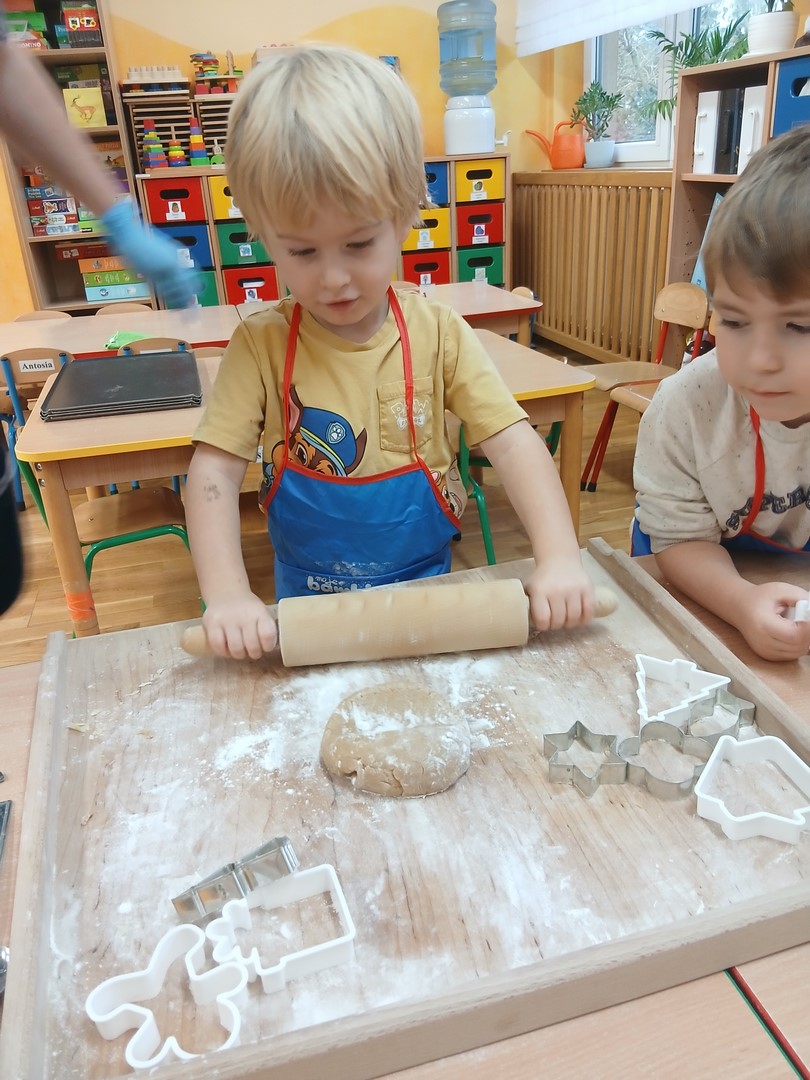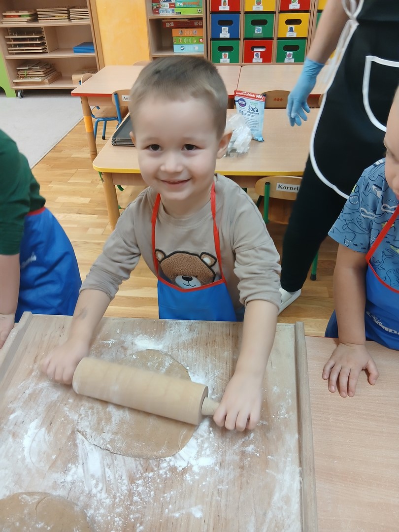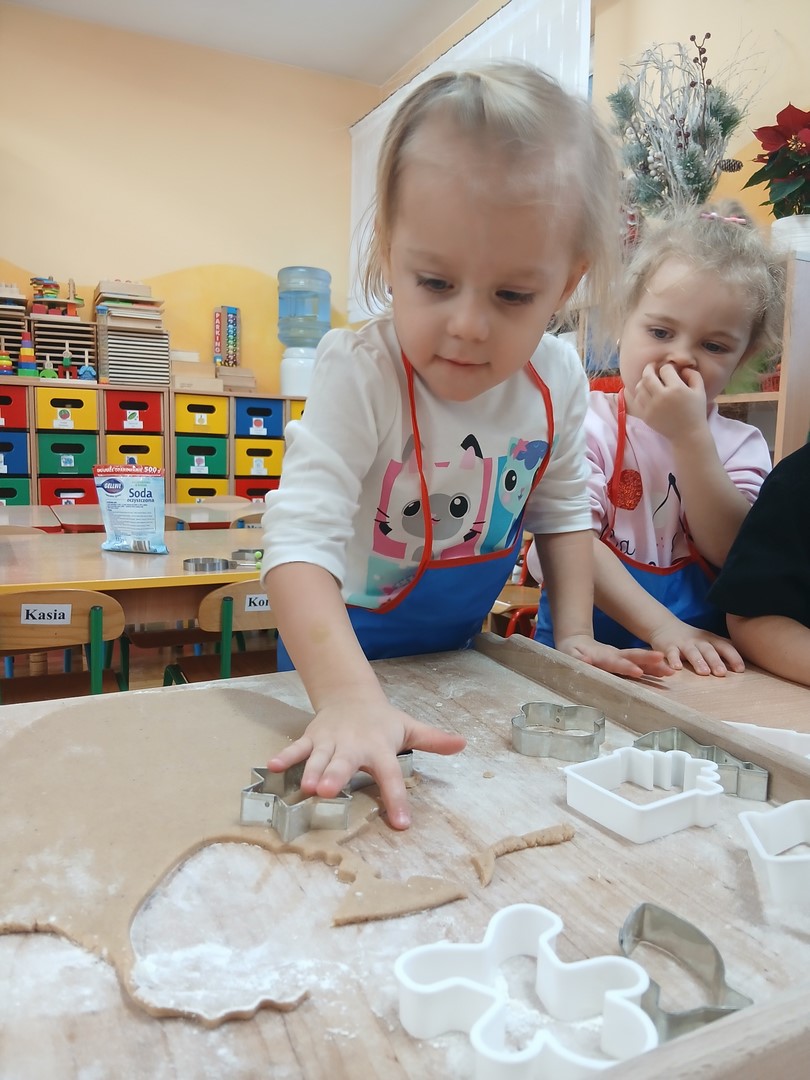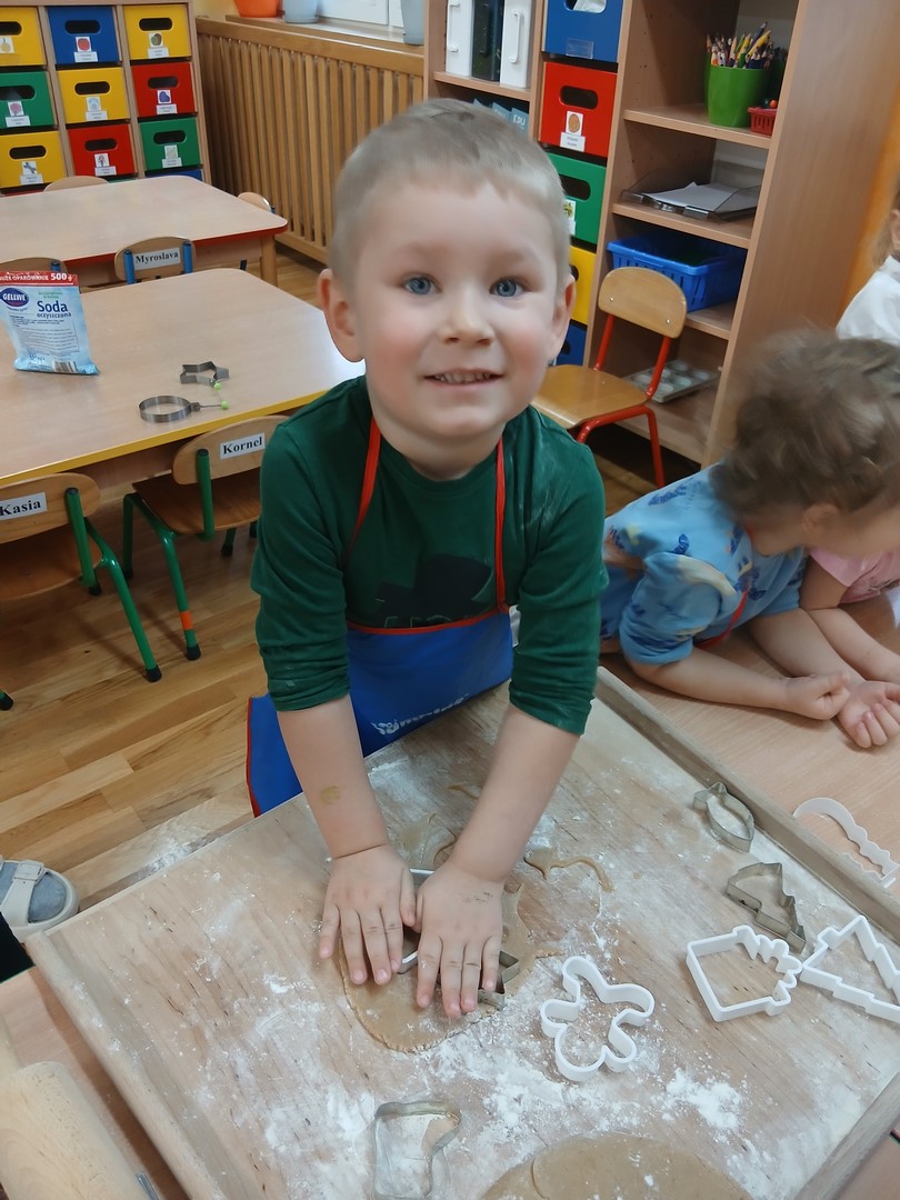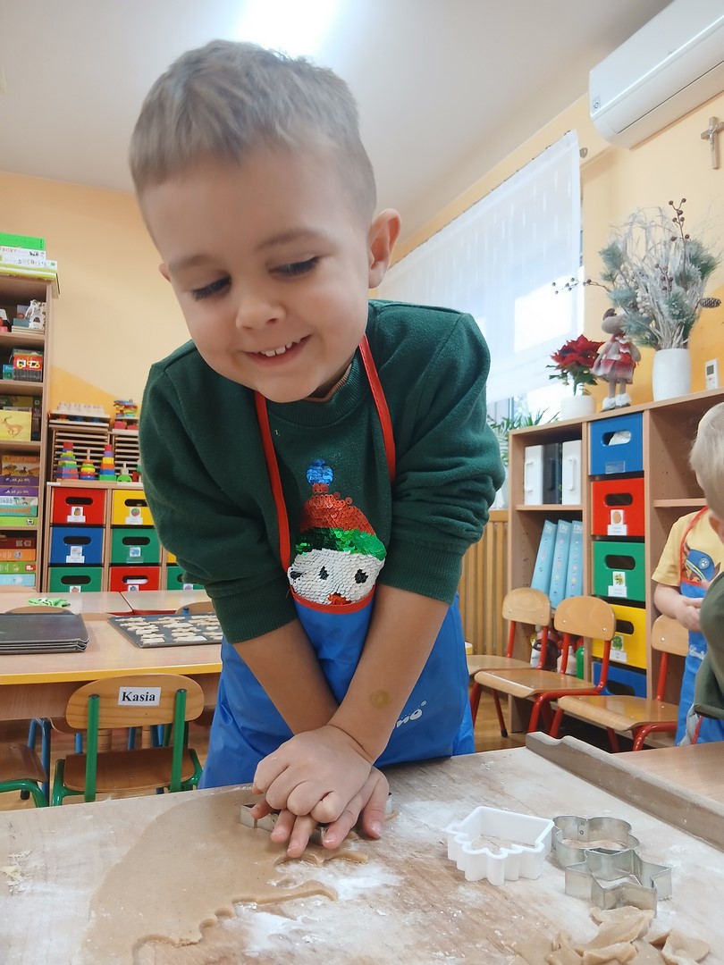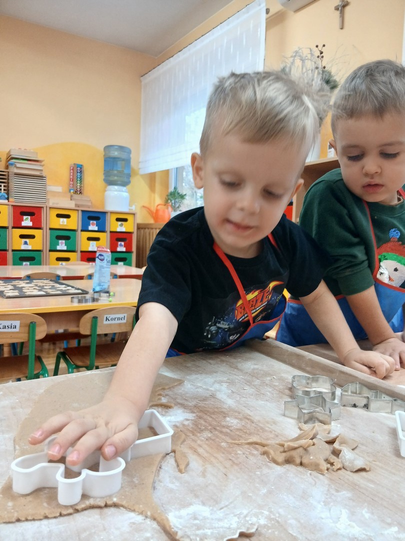 W grupie Słoneczek zapanowała wyjątkowo ciepła i świąteczna atmosfera. Dzieci z wielkim zaangażowaniem uczestniczyły w pieczeniu oraz dekorowaniu pierniczków. Najpierw poznały składniki potrzebne do przygotowania ciasta, a następnie wspólnie wałkowały, wykrawały różnorodne kształty i z niecierpliwością czekały na efekty pieczenia.