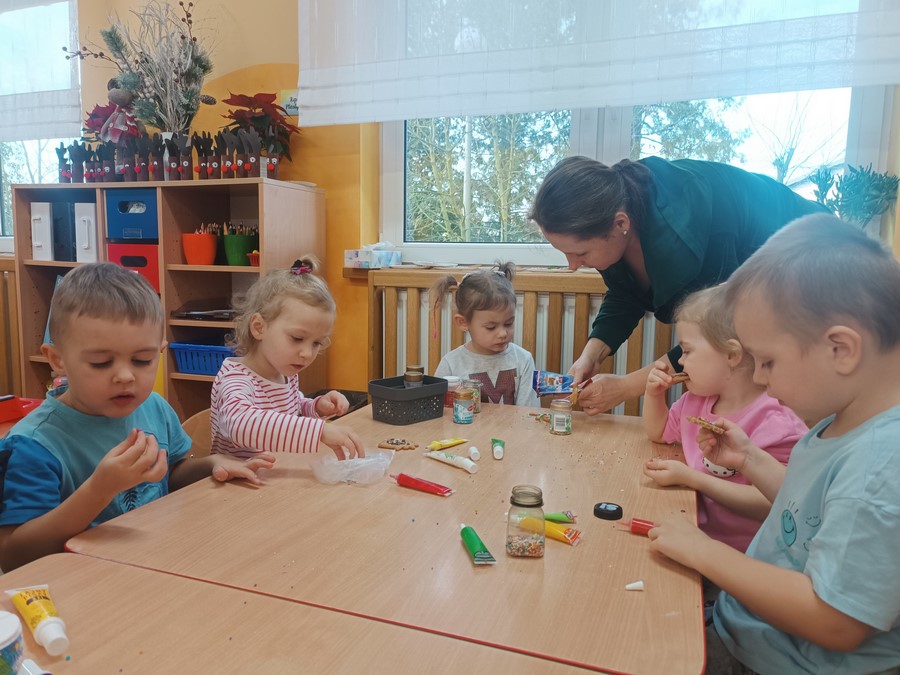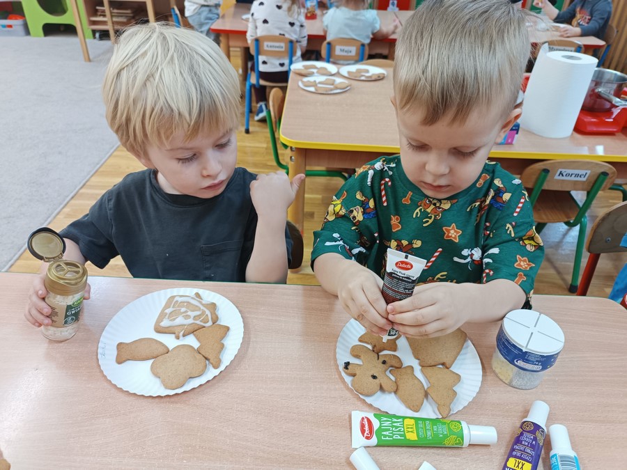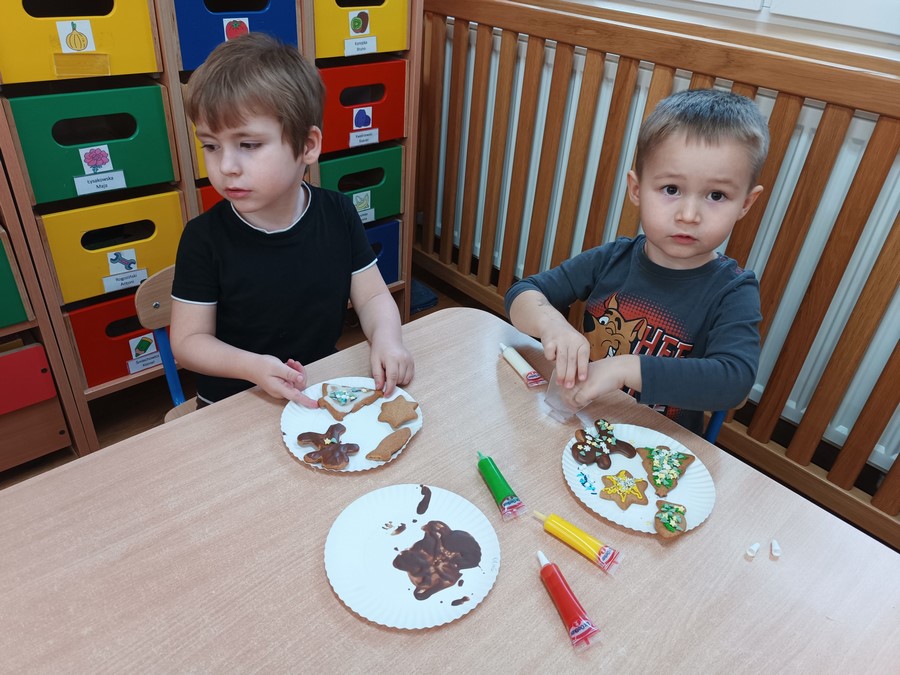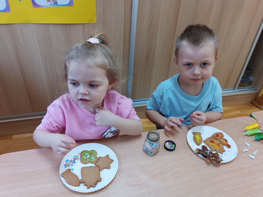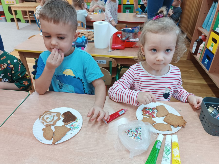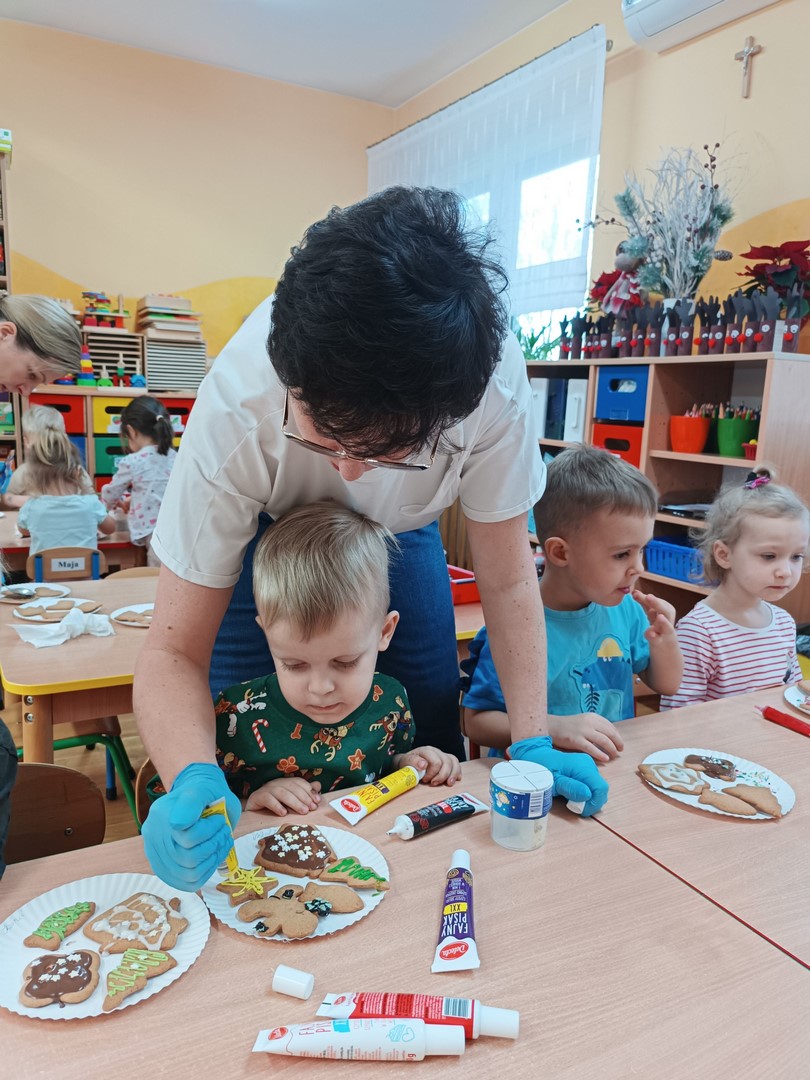 Najwięcej radości sprawiło dekorowanie pierniczków kolorowymi lukrami i posypkami. Dzieci mogły wykazać się kreatywnością, rozwijać sprawność manualną oraz uczyć się współpracy w grupie. Wspólne przygotowanie pierniczków było nie tylko wspaniałą zabawą, ale także okazją do kultywowania tradycji i budowania świątecznego nastroju.