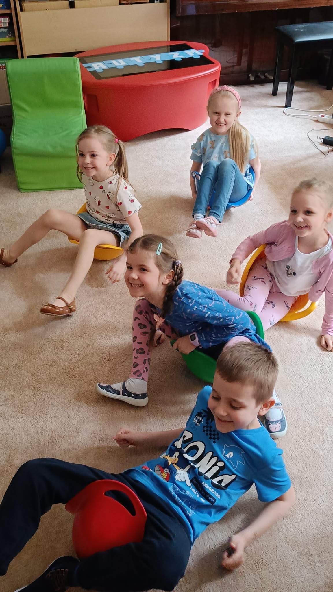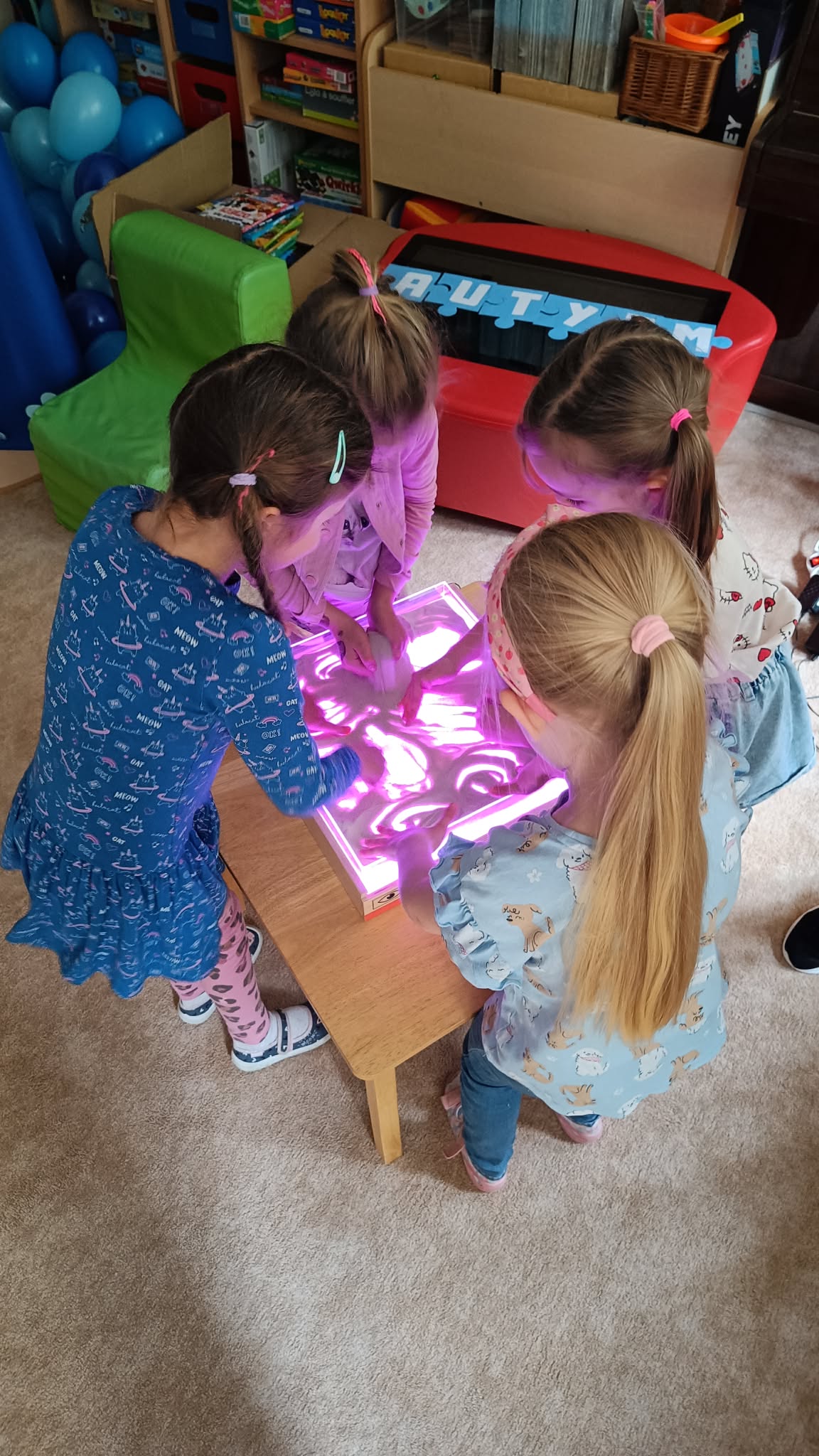 Grupa pięcio- i sześciolatków wzięła udział w wyjątkowych zajęciach sensorycznych. Dzieci aktywnie uczestniczyły w różnych zadaniach rozwijających zmysły – rozpoznawały zapachy i dopasowywały je do odpowiednich obrazków, malowały na podświetlonym piasku oraz z uwagą słuchały opowiadania. Zajęcia były dla nich ciekawym doświadczeniem i okazją do nauki poprzez zabawę.